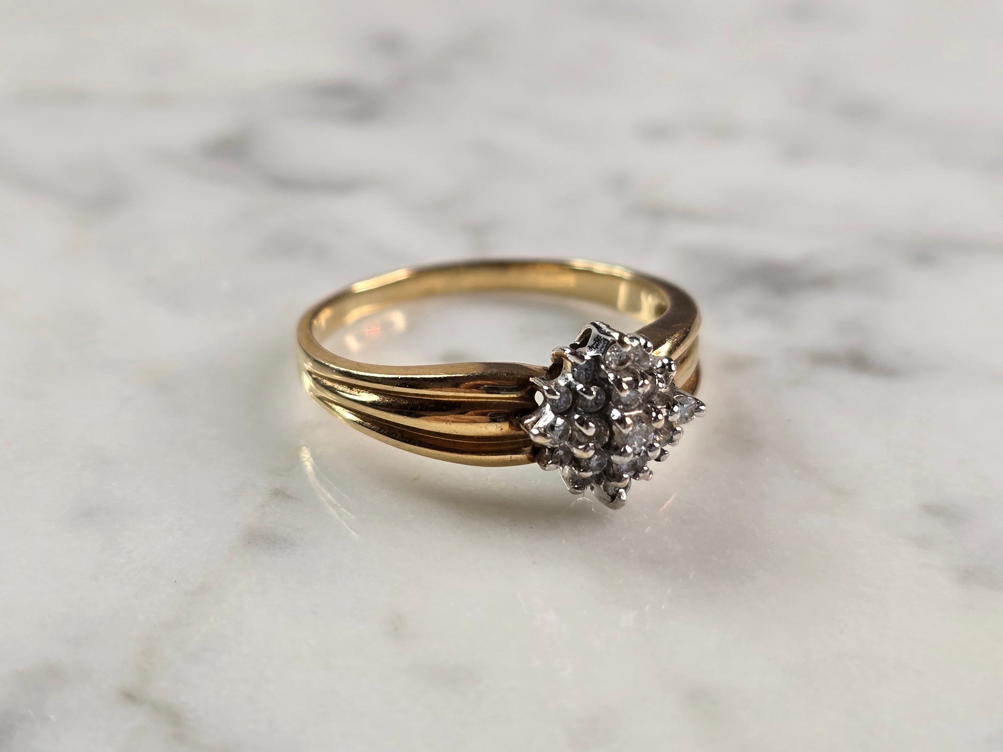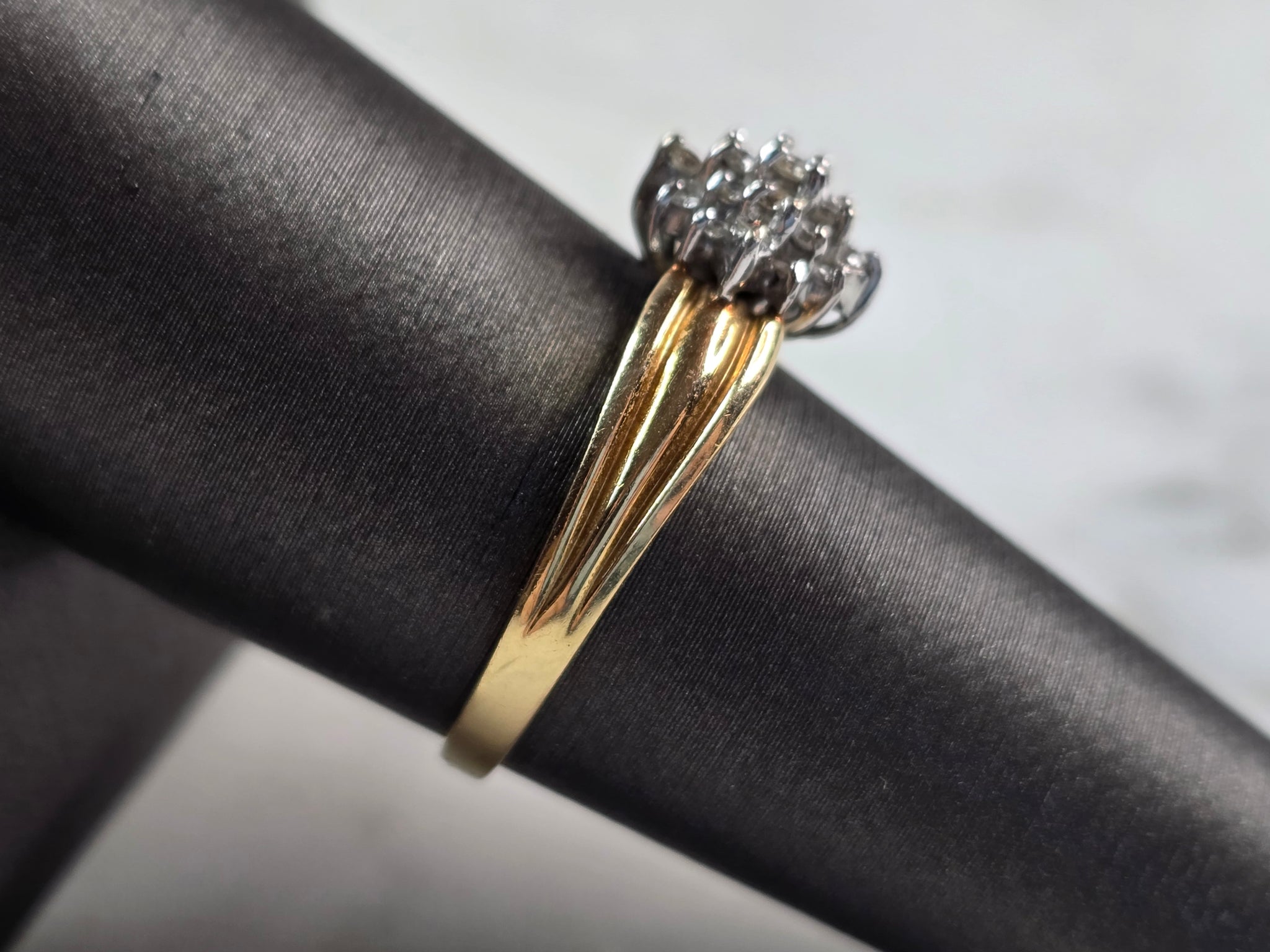 FOR SALE IS THIS ATTRACTIVE 14K YELLOW GOLD DIAMOND CLUSTER RING. THE RING WEIGHS 3.6g, AND IS A SIZE 8.0. THERE ARE ABOUT .57 cts OF DIAMONDS. ANY QUESTIONS, PLEASE DO NOT HESITATE TO ASK. THIS MAKES A WONDERFUL GIFT FOR THAT SOMEONE SPECIAL. BE SURE TO CHECK OUT SOME OF MY OTHER GREAT ITEMS UP FOR SALE. THANK YOU.