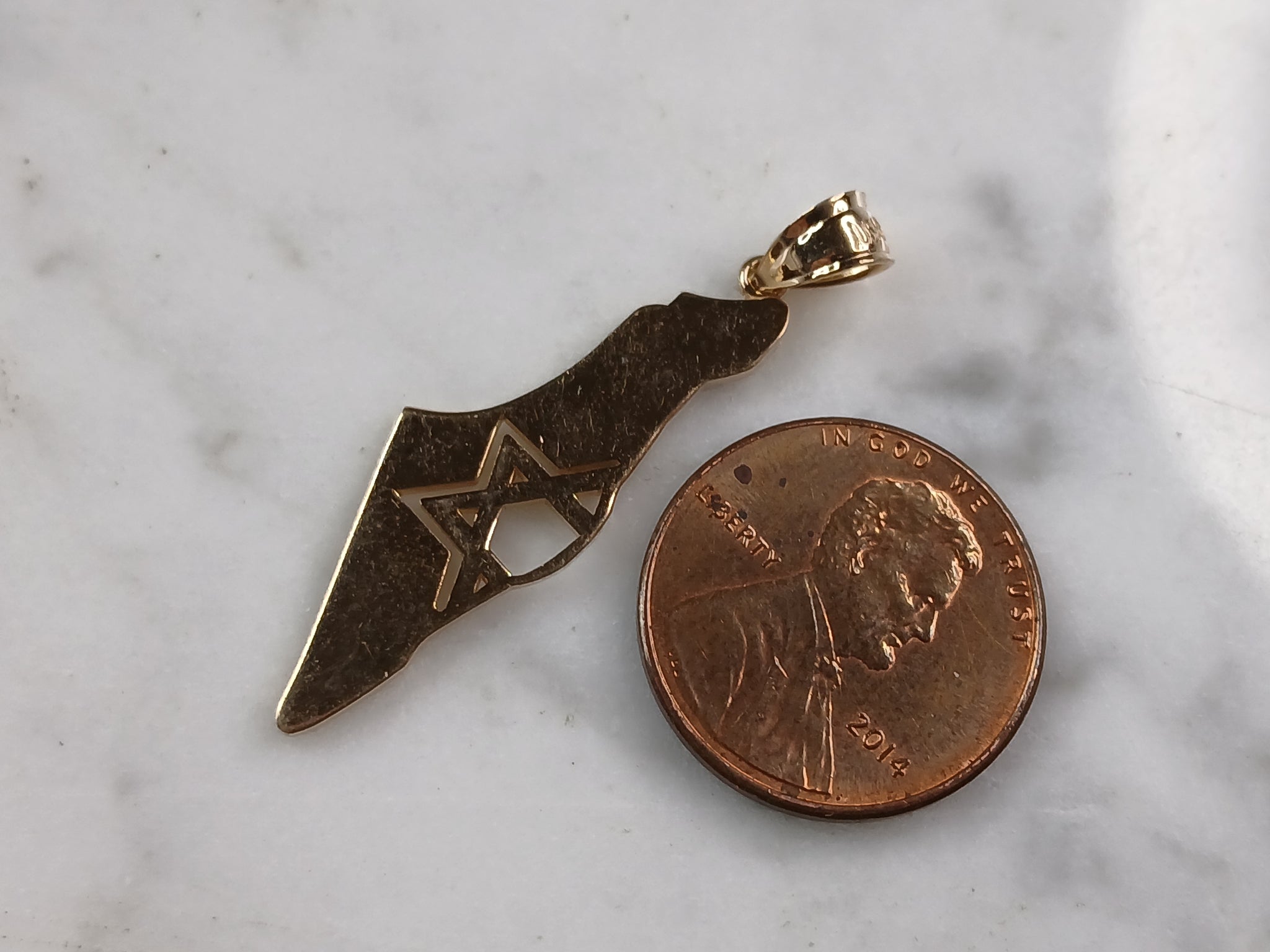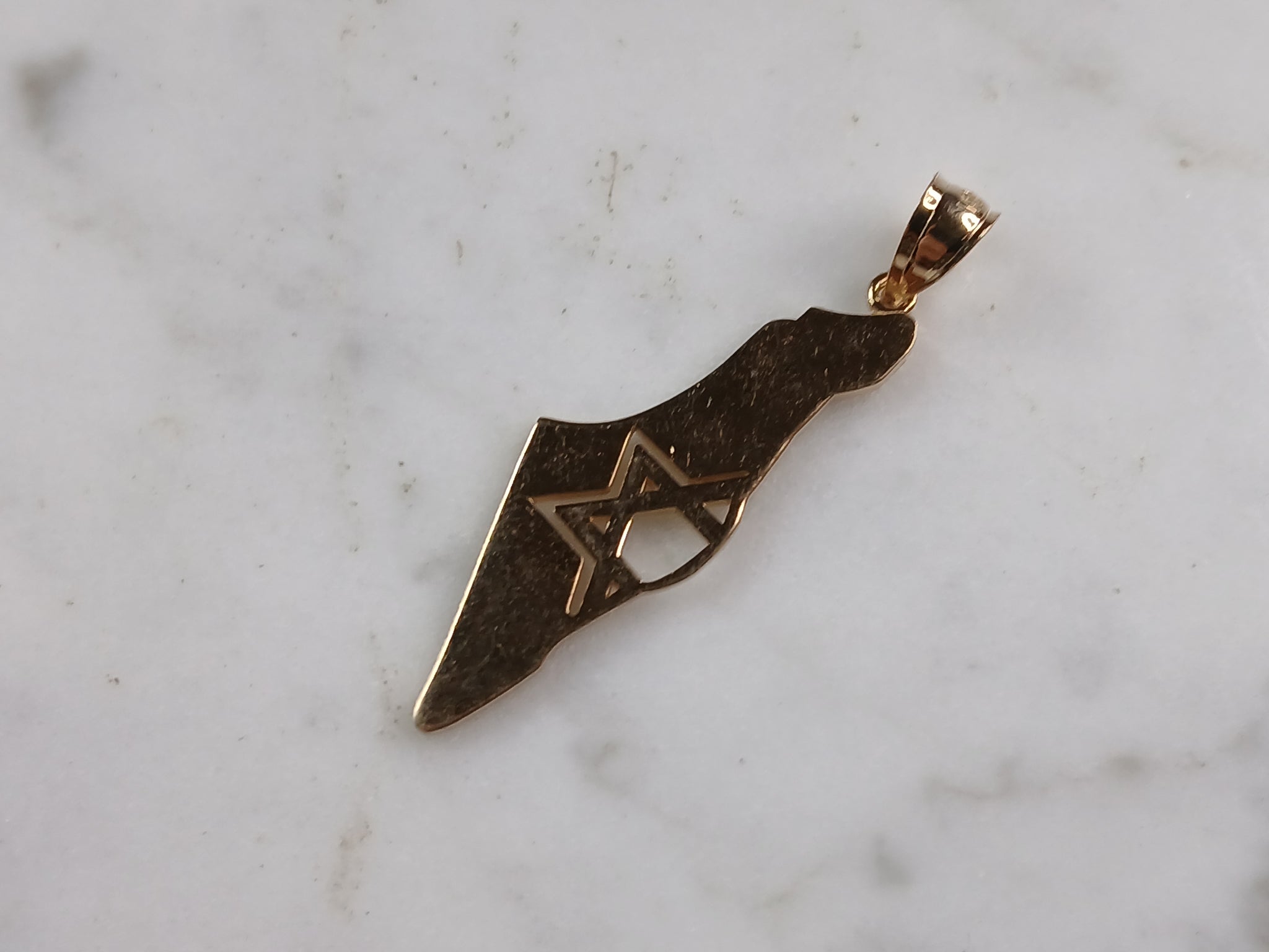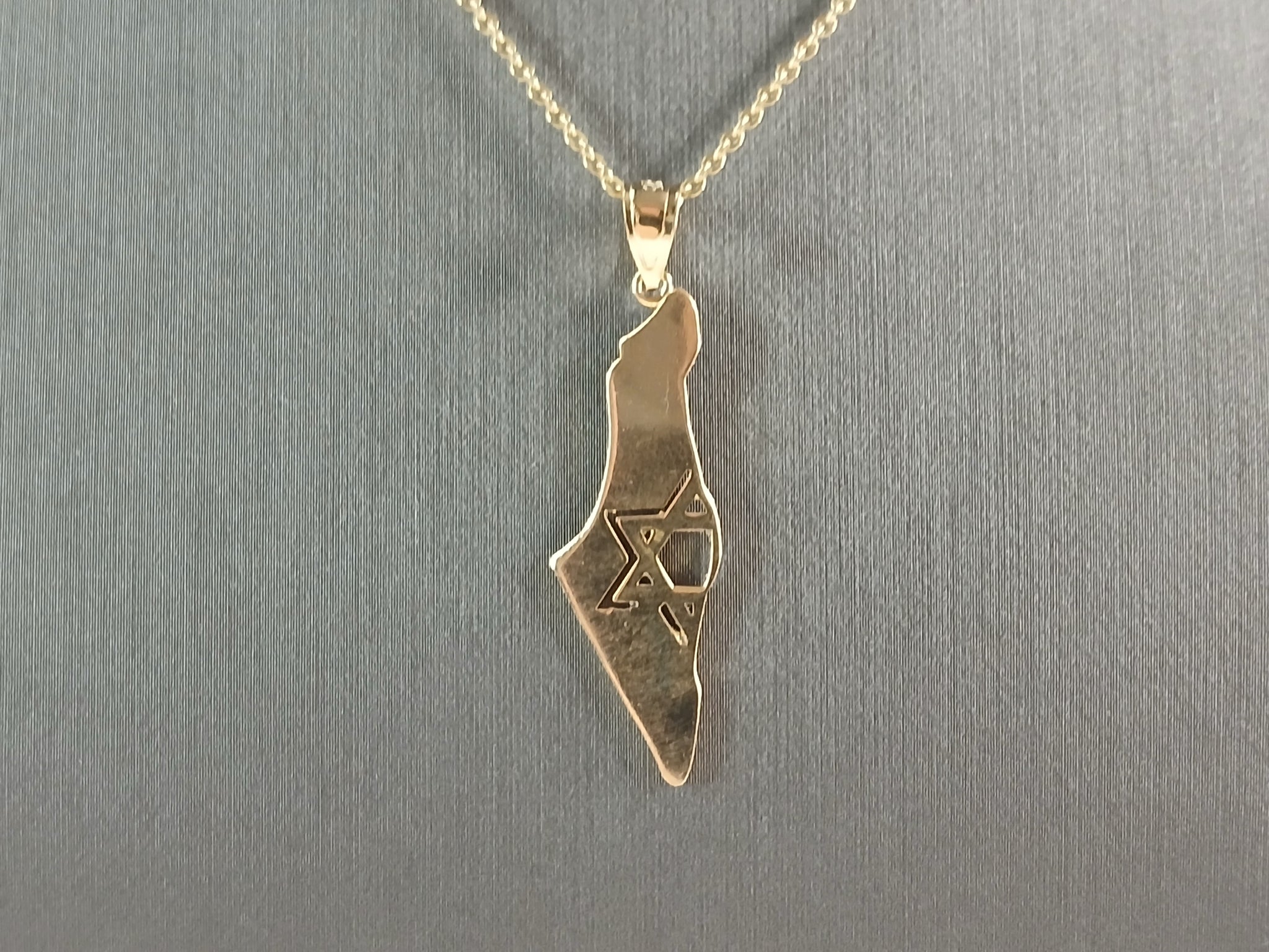 A STERLING SILVER GOLD TONE JUDAICA STAR OF DAVID PENDANT WITH NECKLACE IN THE SHAPE OF ISRAEL. THE PENDANT WITH NECKLACE WEIGHS 3.1g. THE NECKLACE MEASURES 18" LONG, AND THE PENDANT 1 1/2" LONG BY 1/2" WIDE. PENDANT IS MARKED ON THE BALE. MAKES A GREAT GIFT FOR THAT SOMEONE SPECIAL. ANY QUESTIONS, PLEASE ASK. BE SURE TO CHECK OUT OUR OTHER ITEMS FOR SALE.