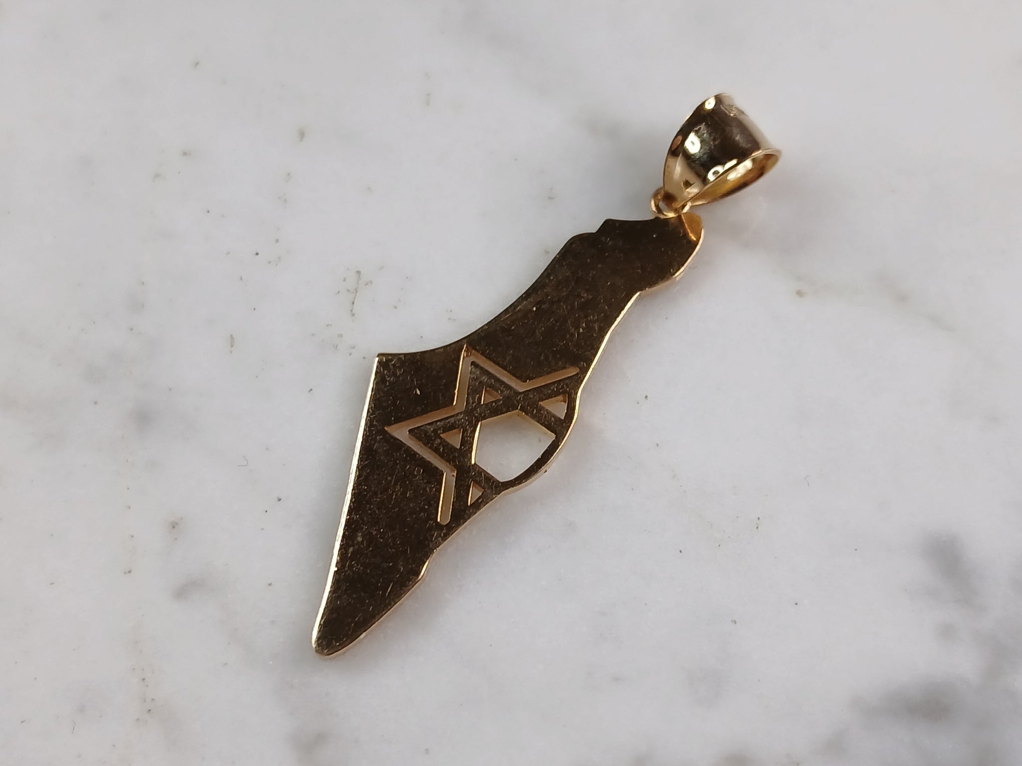 A STERLING SILVER GOLD TONE JUDAICA STAR OF DAVID PENDANT WITH NECKLACE IN THE SHAPE OF ISRAEL. THE PENDANT WITH NECKLACE WEIGHS 4.1g. THE NECKLACE MEASURES 18" LONG, AND THE PENDANT 1 3/4" LONG BY 1/2" WIDE. PENDANT IS MARKED ON THE BALE. MAKES A GREAT GIFT FOR THAT SOMEONE SPECIAL. ANY QUESTIONS, PLEASE ASK. BE SURE TO CHECK OUT OUR OTHER ITEMS FOR SALE.