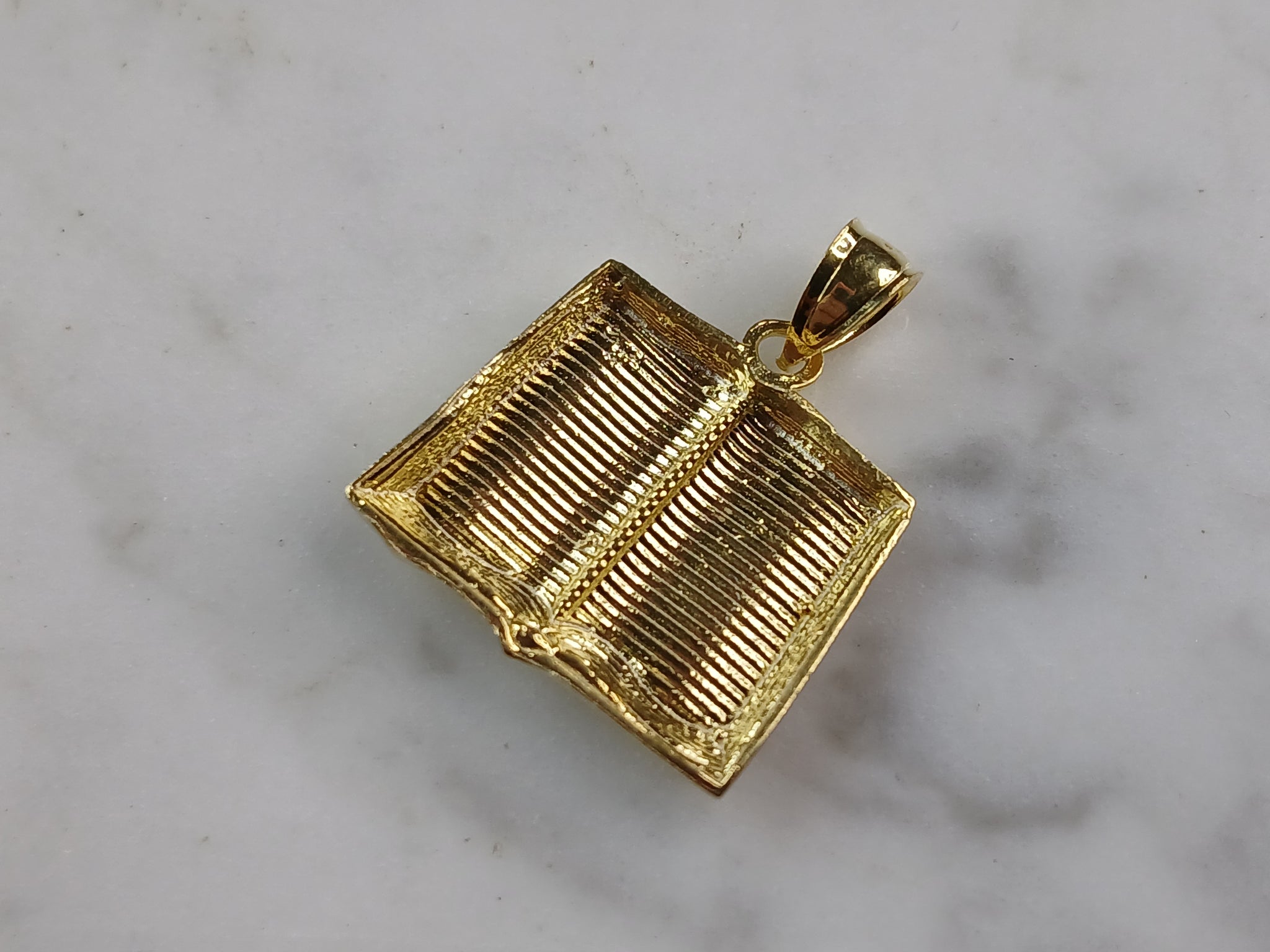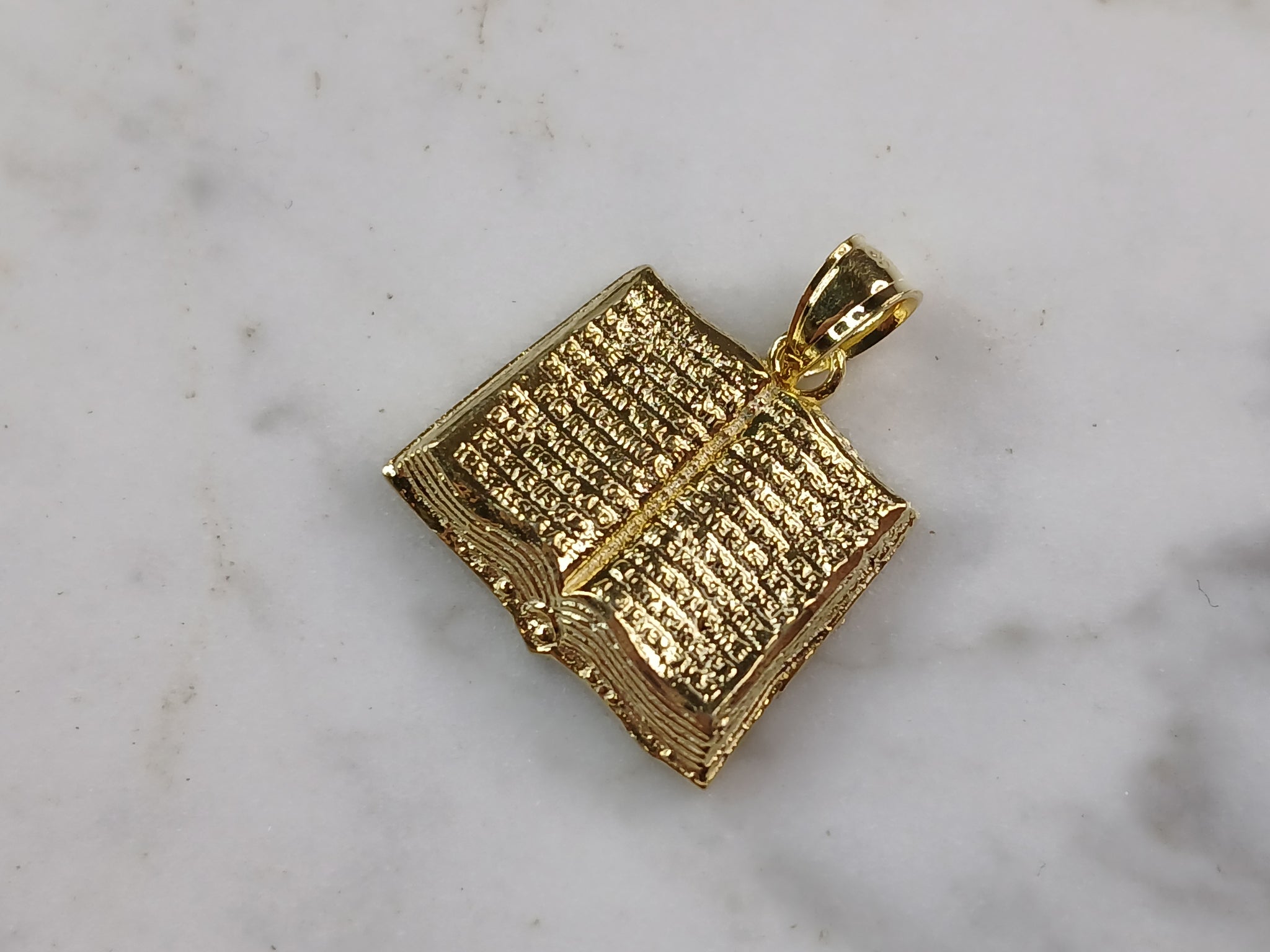 A STERLING SILVER GOLD TONE RELIGIOUS HOLY BIBLE PENDANT WITH NECKLACE. PENDANT WITH NECKLACE WEIGHS 3.7g. THE PENDANT MEASURES 1" LONG BY 7/8" WIDE. THE NECKLACE MEASURES 18" LONG AND IS ADJUSTABLE TO 16". MAKES A GREAT GIFT FOR THAT SOMEONE SPECIAL. ANY QUESTIONS, PLEASE ASK. BE SURE TO CHECK OUT OUR OTHER ITEMS FOR SALE.