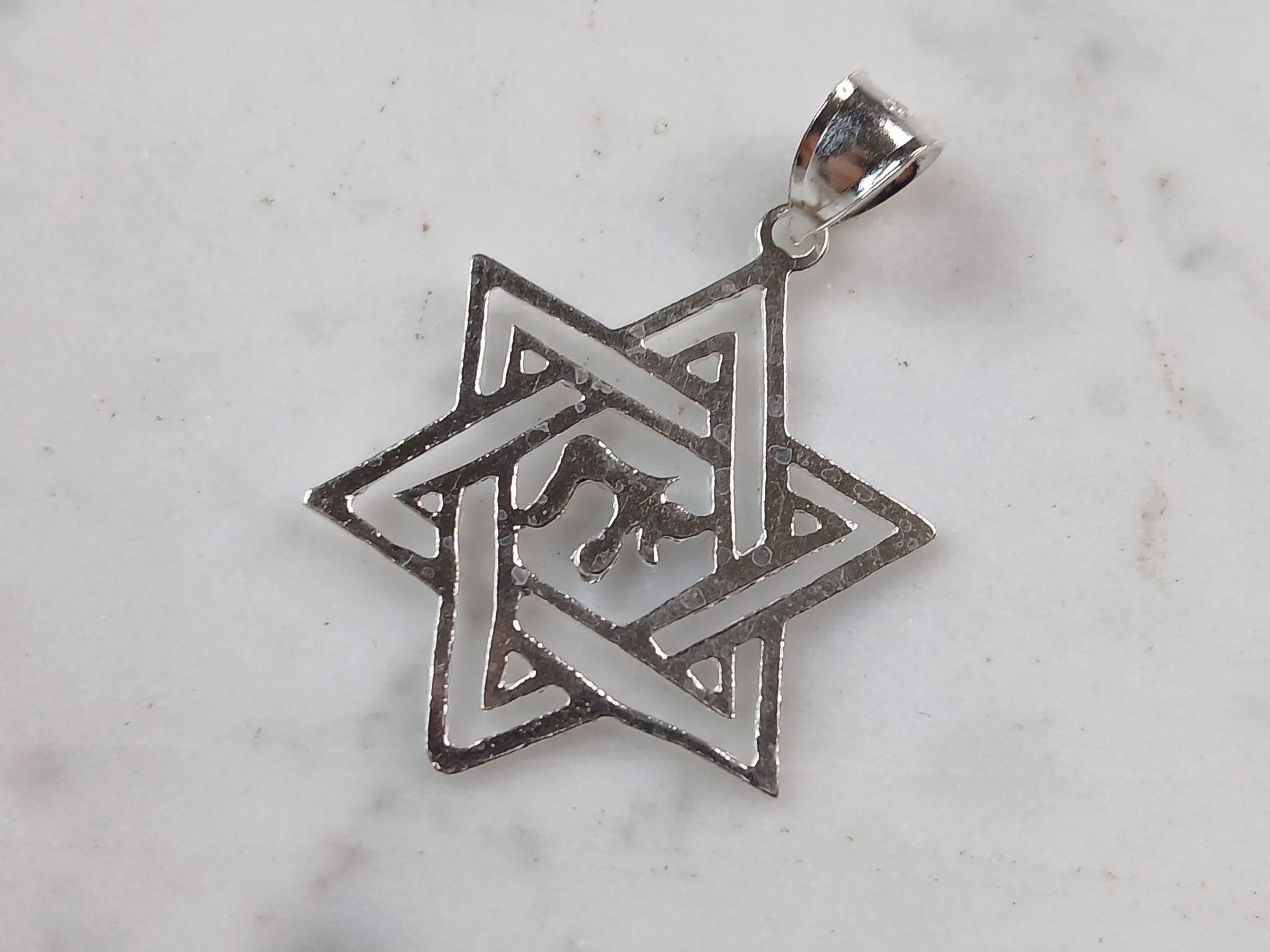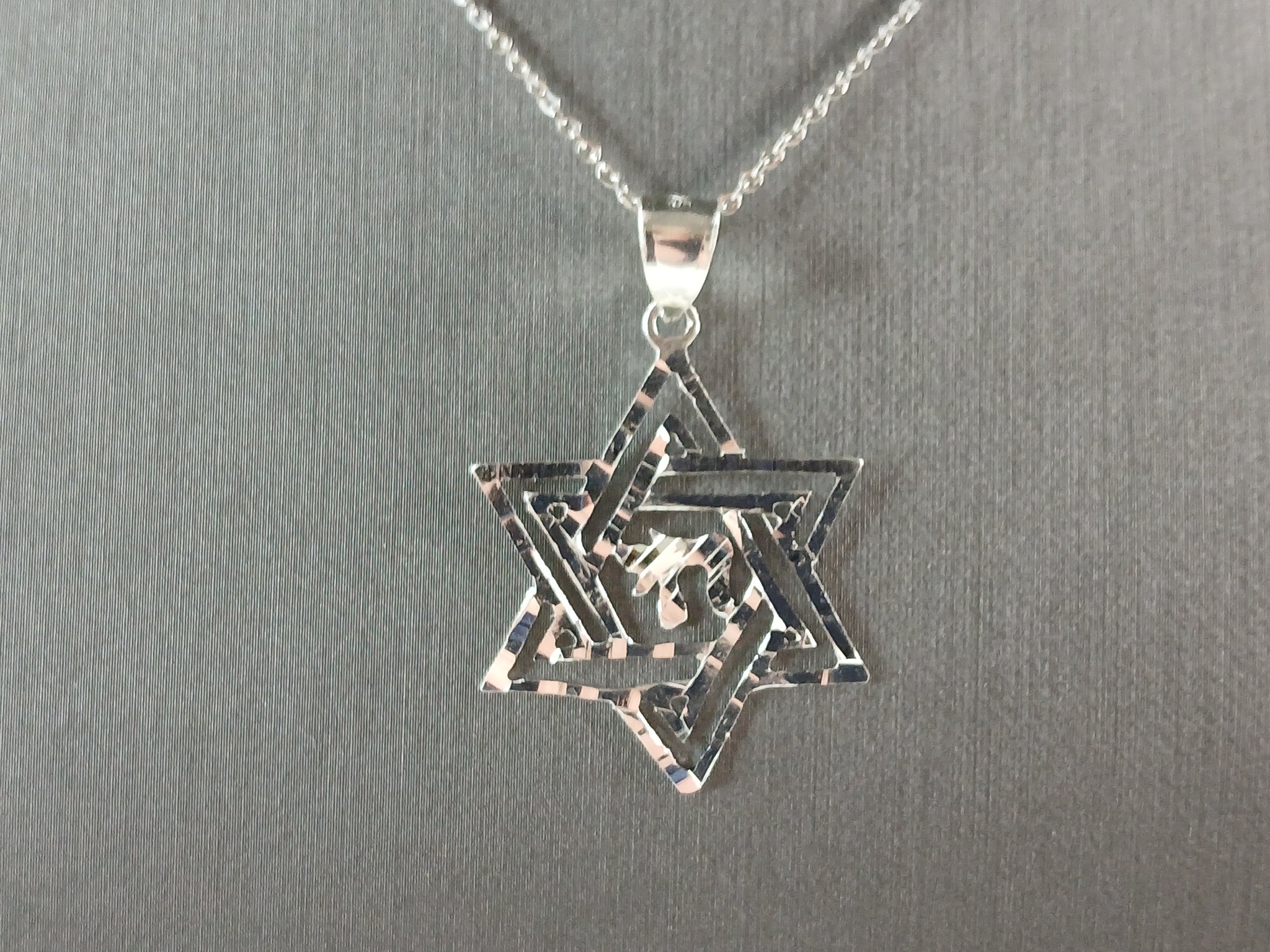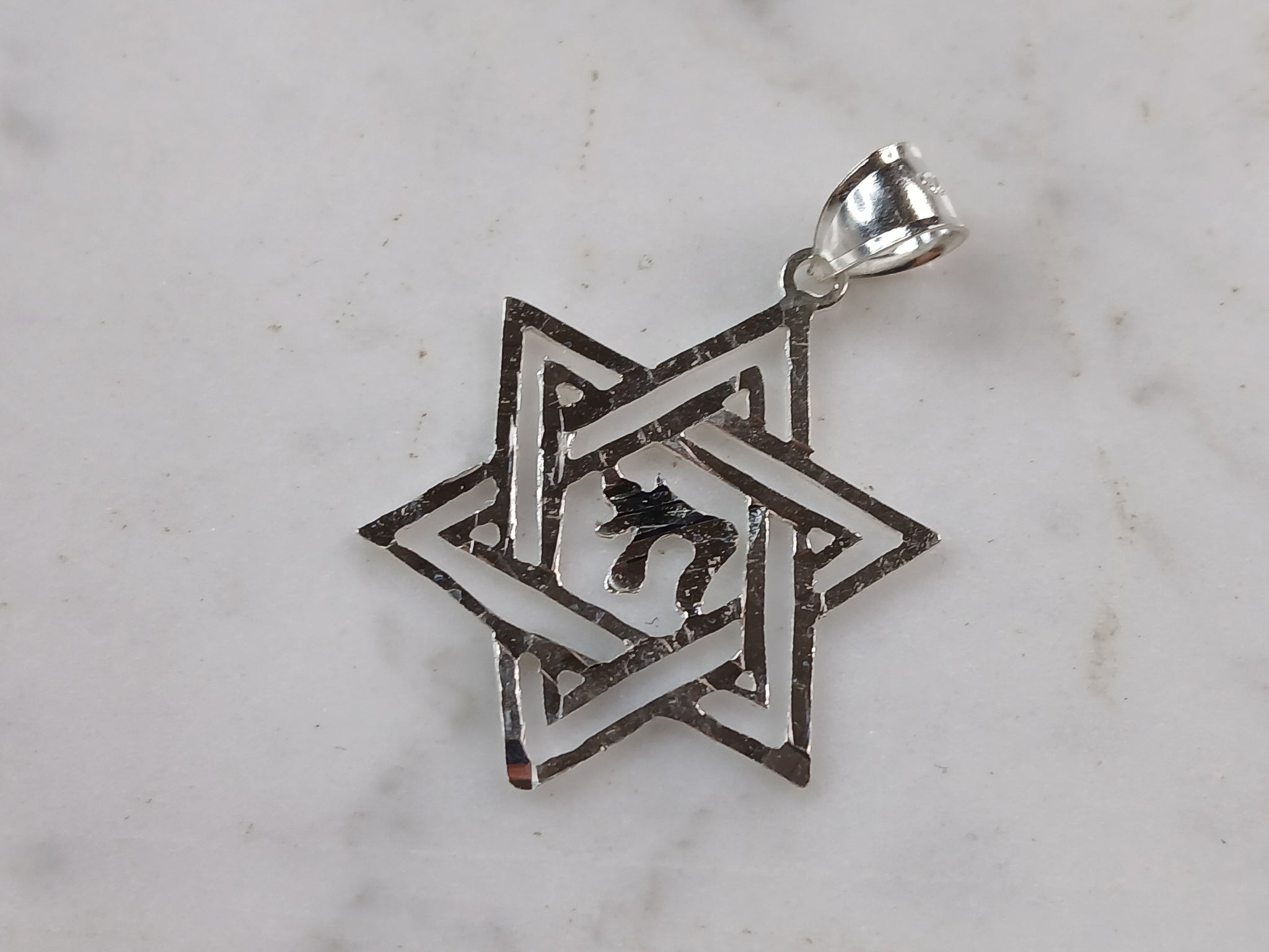 A STERLING SILVER STAR OF DAVID CHAI PENDANT WITH NECKLACE. THE PENDANT WITH NECKLACE WEIGHS 3.1g. THE NECKLACE MEASURES 18" LONG, AND IS ADJUSTABLE TO 16" LONG. THE PENDANT MEASURES 1 1/2" LONG BY 1" WIDE. MAKES A GREAT GIFT FOR THAT SOMEONE SPECIAL. ANY QUESTIONS, PLEASE ASK. BE SURE TO CHECK OUT OUR OTHER ITEMS FOR SALE.