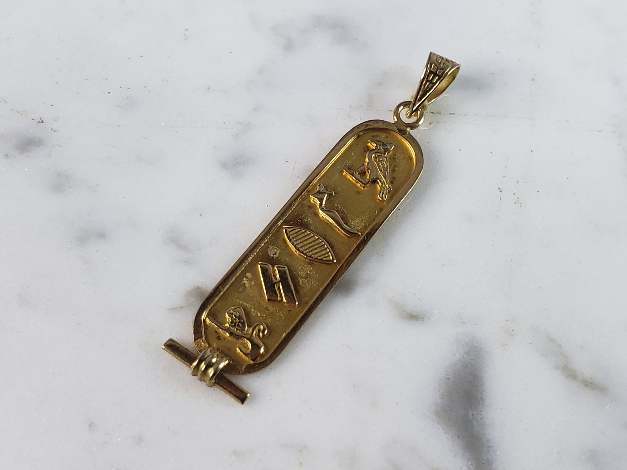 A VINTAGE ESTATE 18K YELLOW GOLD EGYPTIAN HIEROGLYPH PENDANT. THE PENDANT MEASURES 1 3/4" BY 3/8", AND WEIGHS 2.3g. PENDANT HAS A FAINT FOREIGN MARK ON THE BACK TOP CORNER. MAKES A GREAT GIFT FOR THAT SOMEONE SPECIAL. ANY QUESTIONS, PLEASE DO NOT HESITATE TO ASK. BE SURE TO CHECK OUT OUR OTHER ITEMS FOR SALE.