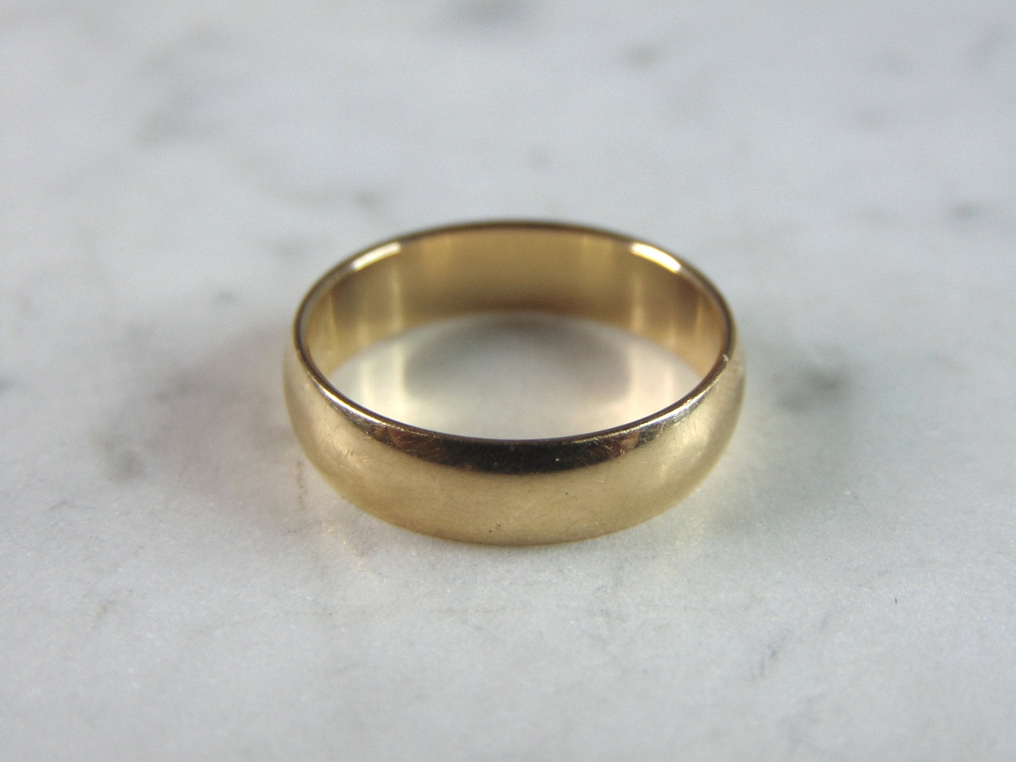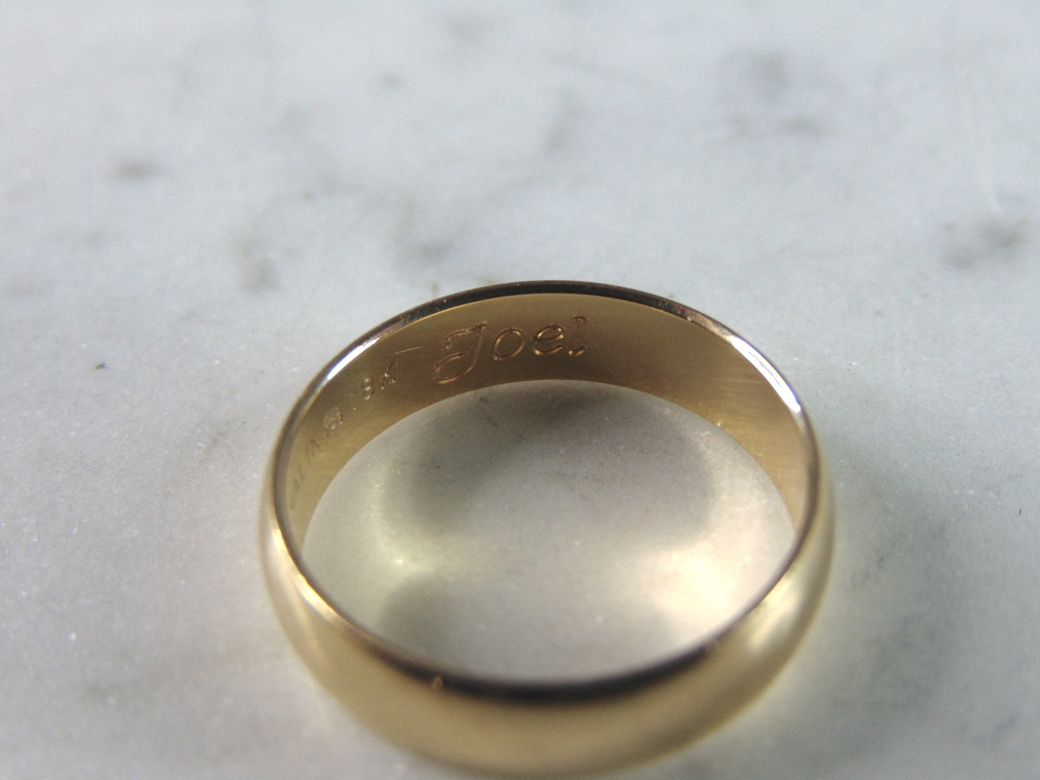 THIS ITEM IS A VINTAGE ESTATE 18K YELLOW GOLD WEDDING BAND RING. RING IS MARKED ON THE INSIDE. THE SIZE OF THE RING IS A 7. THE RING WEIGHS 4.1g AND IS 1/4" WIDE. RING DOES HAVE A NAME ENGRAVED BUT CAN BE REMOVED BY AN EXPIERNCED JEWELER. ANY OTHER QUESTIONS PLEASE DO NOT HESITATE TO ASK. BE SURE TO CHECK OUT SOME OF MY OTHER GREAT ITEMS UP FOR SALE. THANK YOU