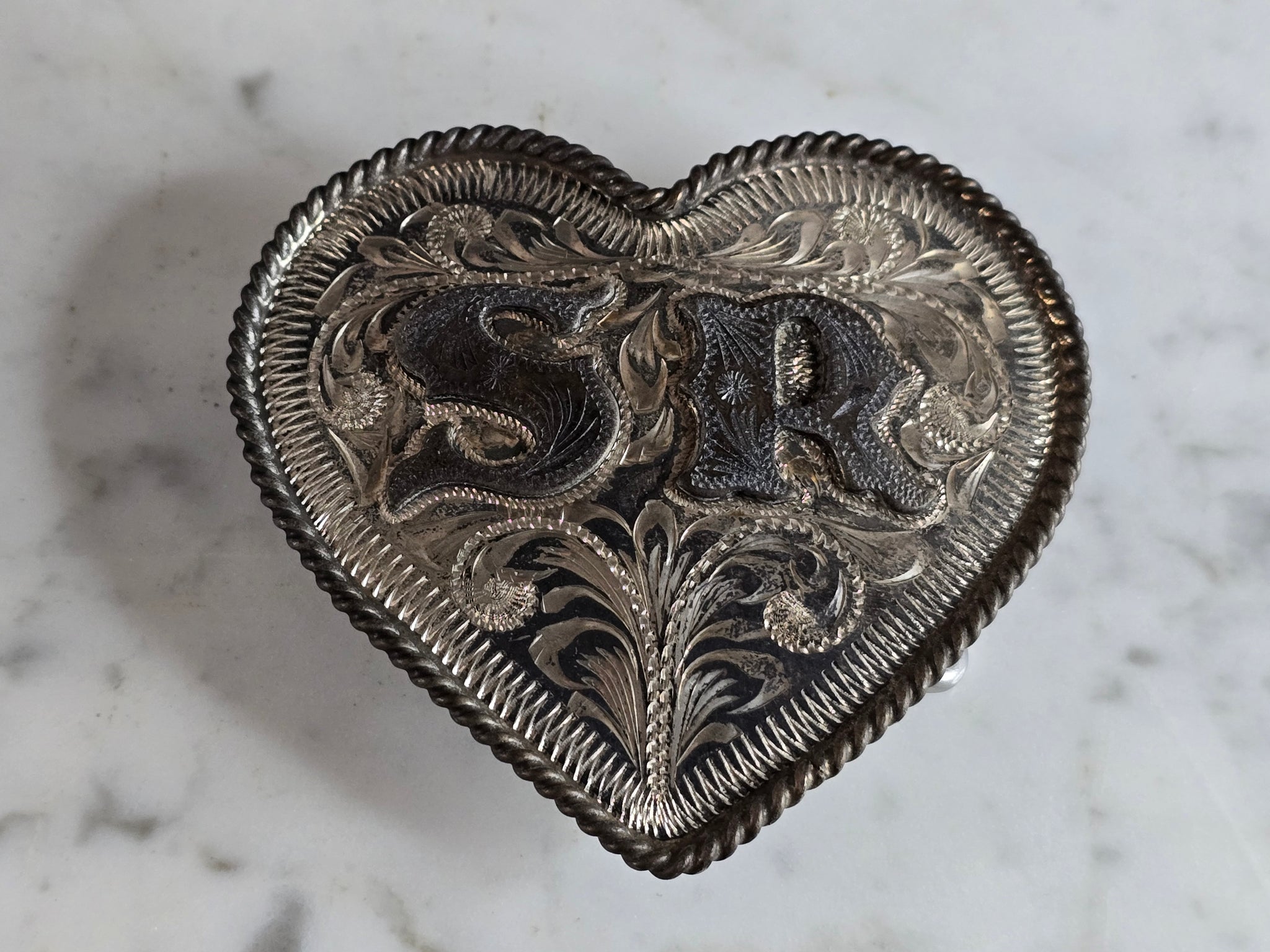 A VINTAGE ESTATE STERLING SILVER SOUTHWESTERN HEART BELT BUCKLE WITH THE INITIALS "SR". THE BUCKLE WEIGHS 58.0g AND MEASURES 3" BY 2 3/4". BUCKLE IS MARKED " STERLING, KUSTOM KRAFT. MAKES A GREAT GIFT FOR THAT SPECIAL SOMEONE. ANY QUESTIONS, PLEASE ASK. BE SURE TO CHECK OUT OUR OTHER ITEMS FOR SALE.