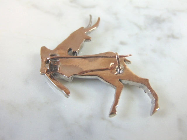 A womens vintage estate 14k white gold diamond stag brooch. Piece weighs 9.1g and measures 1 3/4" long by 1 3/4" wide. There are about 2.35cts of diamonds. There are 3 diamonds missing, however you can only tell when looking under a magnifying glass. Some of the other diamonds do have some chips. I do believe they were intended to be like that for the holes that the diamonds are set in are not perfectly round. The eye of the stag appears to be ruby. Piece is not marked but it has been tested.