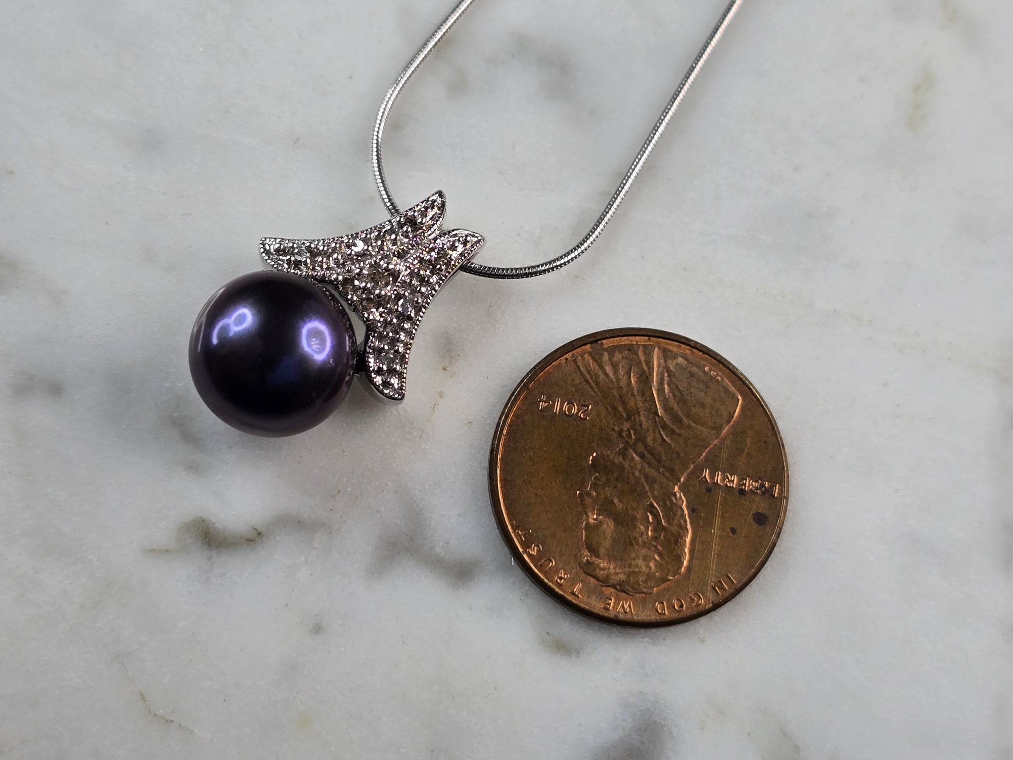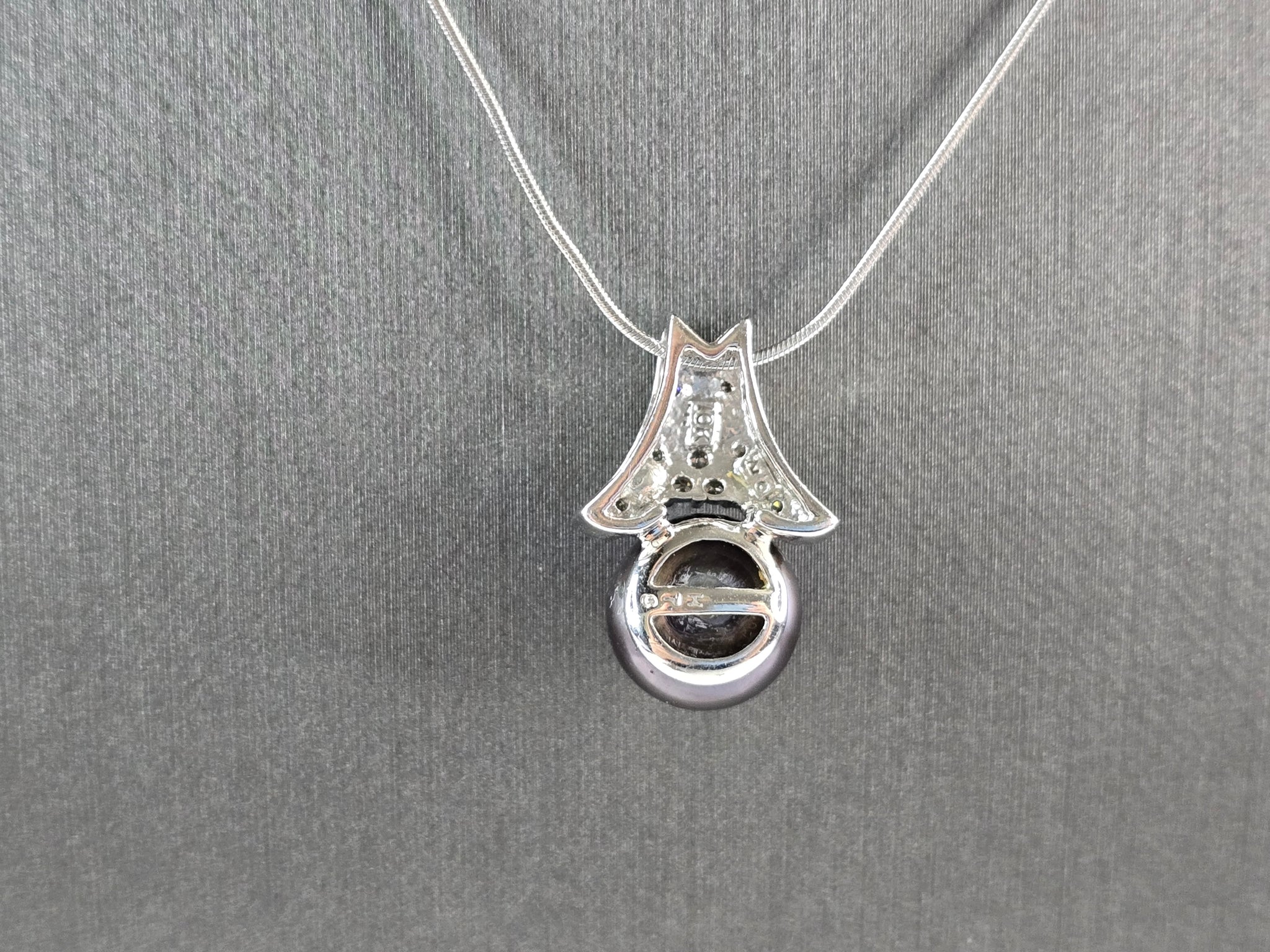 A BEAUTIFUL WOMENS VINTAGE ESTATE 14K WHITE GOLD NECKLACE WITH A 10K WHITE GOLD BLACK PEARL PENDANT ACCENTED WITH DIAMONDS.   NECKLACE MEASURES  16 1/4"  LONG, AND THE PENDANT MEASURES 3/4" BY 1/2".  TOGETHER THEY WEIGH 5.3g.  THERE ARE 7 TINY DIAMONDS IN THE PENDANT.  ANY QUESTIONS PLEASE ASK PRIOR TO BIDDING.  BE SURE TO CHECK OUT SOME OF MY OTHER GREAT ITEMS UP FOR SALE. THANK YOU