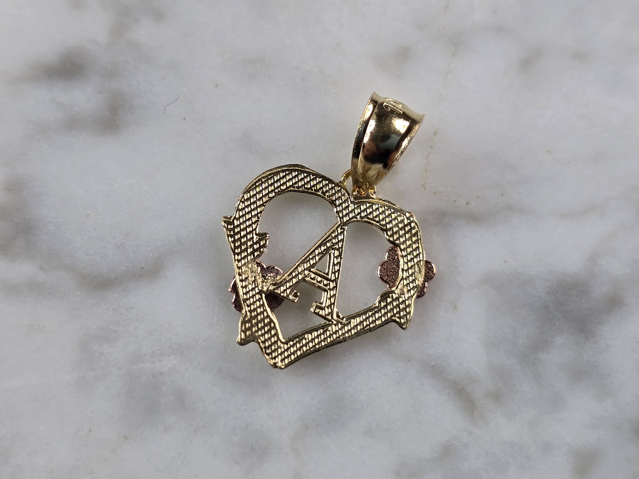 A WOMENS 10K YELLOW & ROSE GOLD "A" HEART PENDANT. PENDANT MEASURES 3/4" LONG BY 5/8" WIDE. TOTAL WEIGHT OF THE PENDANT IS 0.9g. WOULD MAKE A LOVELY GIFT FOR THAT SOMEONE SPECIAL. ANY QUESTIONS PLEASE ASK. BE SURE TO CHECK OUT SOME OF MY OTHER GREAT ITEMS UP FOR SALE. THANK YOU
