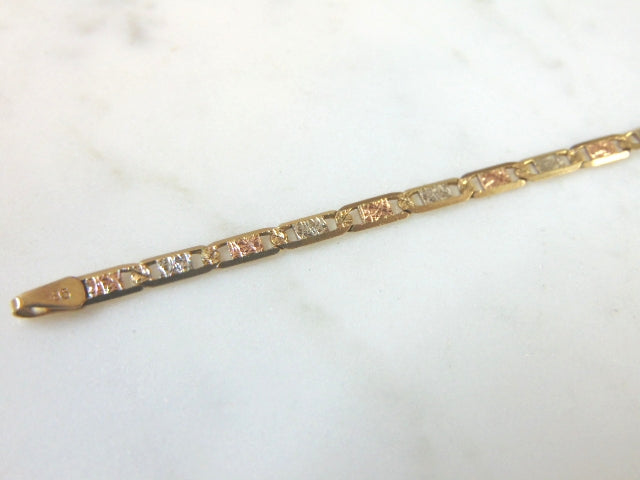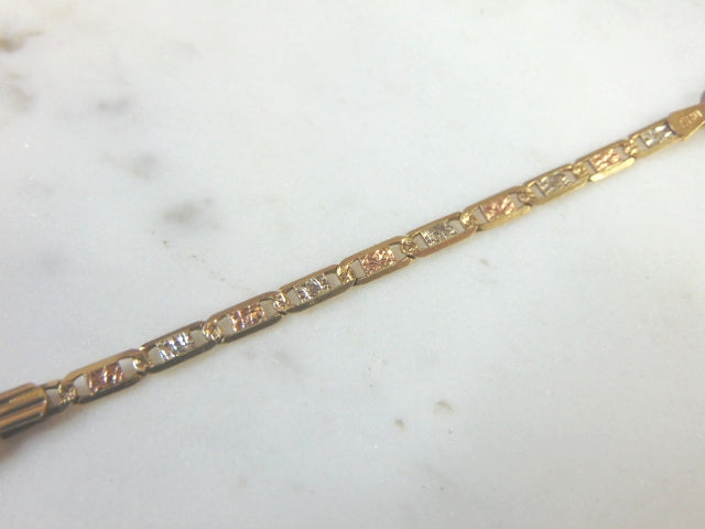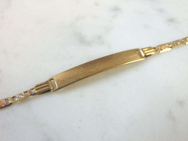 A WOMENS VINTAGE ESTATE 14K YELLOW, ROSE AND WHITE GOLD CHAIN ID BRACELET THAT WAS MADE IN ITALY. THE BRACELET MEASURES 7 3/4" LONG BY 1/4" AND WEIGHS 5.6g. IF ANY QUESTIONS, PLEASE CALL. THIS MAKES A GREAT GIFT FOR THAT SOMEONE SPECIAL. BE SURE TO CHECK OUT SOME OF OUR OTHER GREAT ITEMS FOR SALE.
