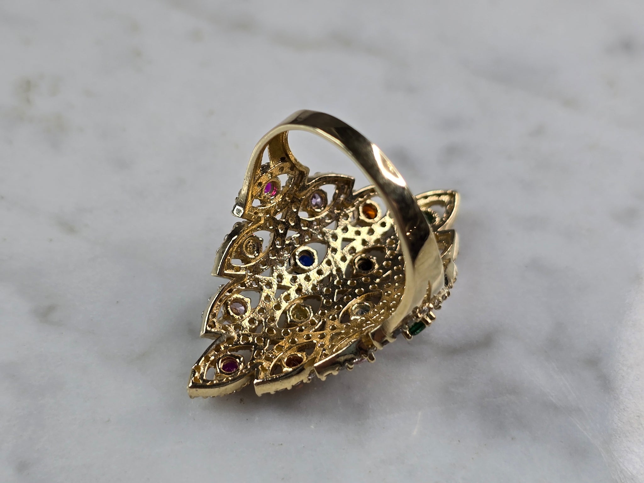 A UNIQUE WOMENS 14K YELLOW GOLD MODERNIST RING WITH MULTI COLORED STONES. THE RING SIZE IS A 8.25, AND WEIGHS 6.7g. THE LENGTH OF THE RING IS 1 5/8". RING HAS A FAINT MARK ON THE INSIDE. STONES ARE MAN MADE. THIS WOULD MAKE A NICE GIFT FOR THAT SOMEONE SPECIAL. ANY QUESTIONS, PLEASE DO NOT HESITATE TO ASK. BE SURE TO CHECK OUT MY OTHER GREAT ITEMS UP FOR SALE. THANK YOU.