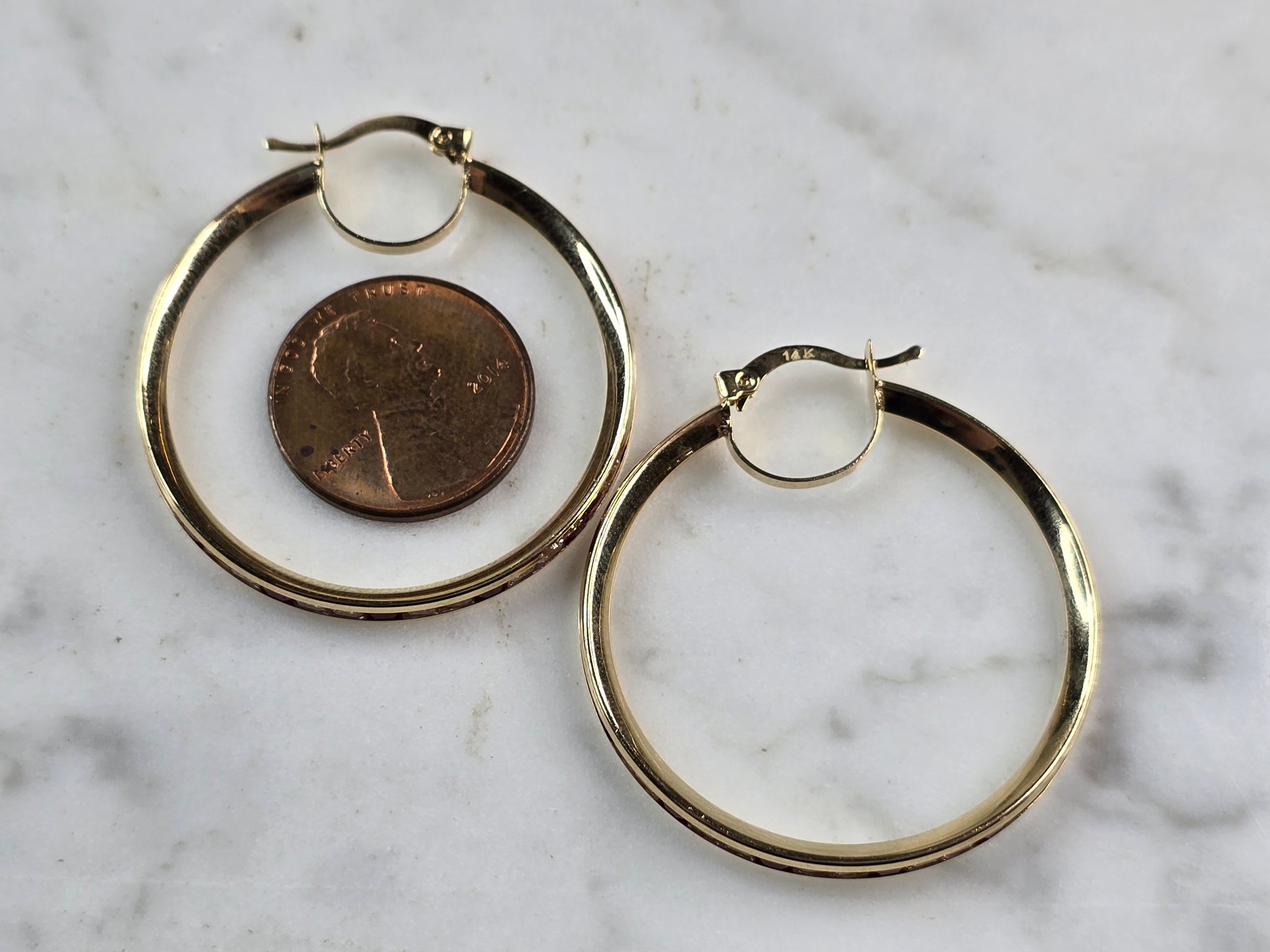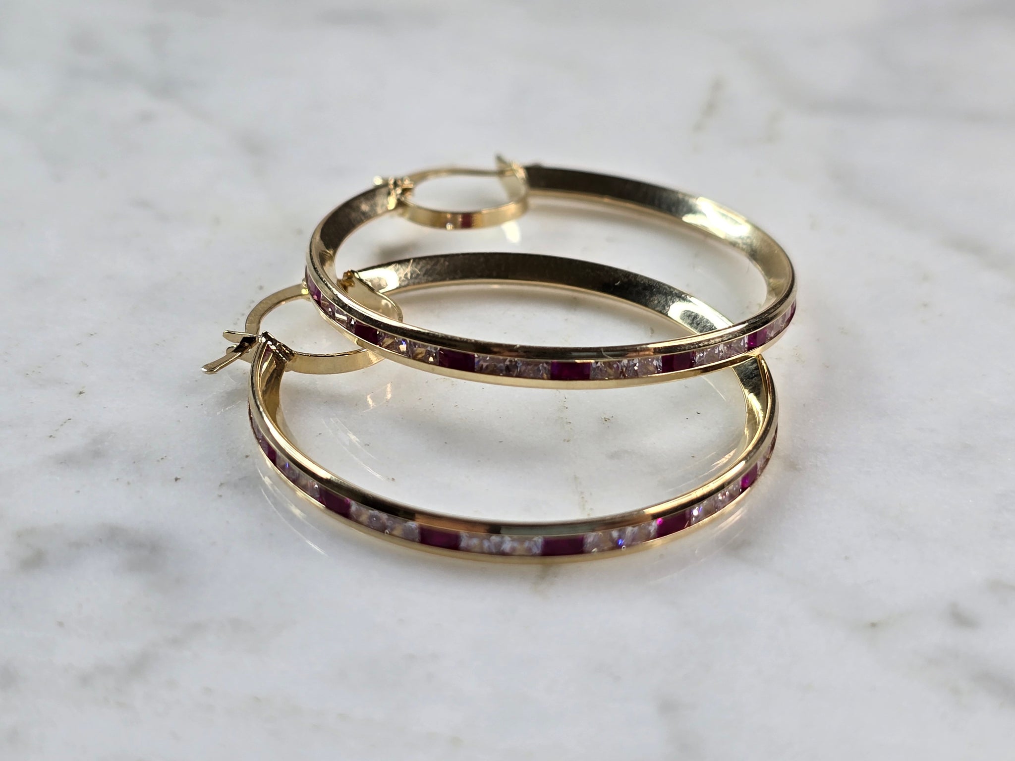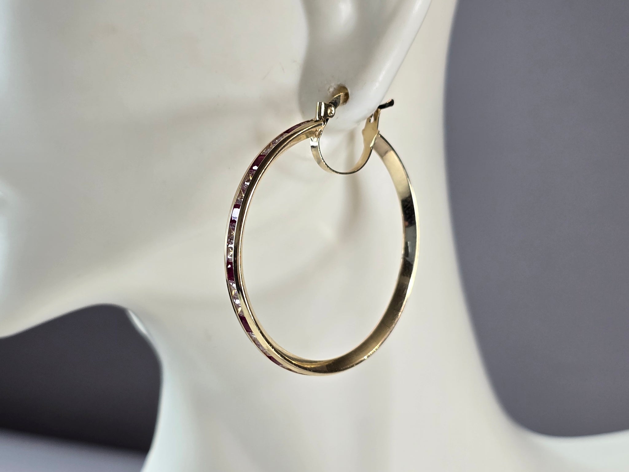 A LOVELY PAIR OF WOMENS 14K YELLOW GOLD RUBY & CZ HOOP EARRINGS . THE EARRINGS WEIGH 4.5g, AND MEASURE 1 1/2" LONG BY 1 3/8" WIDE. NOT SURE IF STONES ARE NATURAL OR MAN MADE. ANY QUESTIONS, PLEASE DON'T HESITATE TO ASK. BE SURE TO CHECK OUT SOME OF MY OTHER GREAT ITEMS UP FOR SALE. THANK YOU.