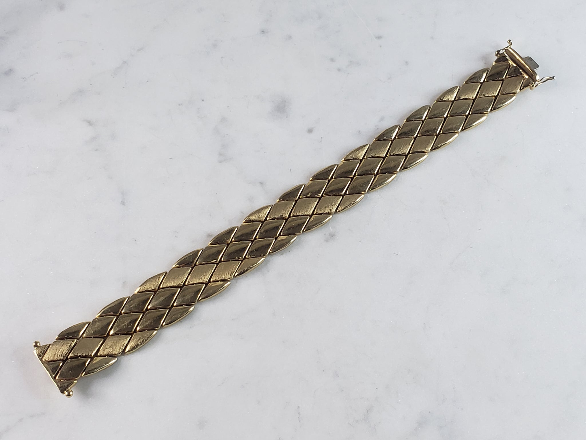 AN ELEGANT WOMENS VINTAGE ESTATE 14K YELLOW GOLD BRACELET. THE BRACELET MEASURES 7 1/4" LONG FROM THE CLASP BY 5/8" WIDE, AND WEIGHS 29.6g. BRACELET IS MARKED "585, ITALY". BRACELET DOES SHOW SOME MINOR SIGNS OF WEAR. THIS MAKES A GREAT GIFT FOR THAT SOMEONE SPECIAL. BE SURE TO CHECK OUT SOME OF OUR OTHER GREAT ITEMS FOR SALE.