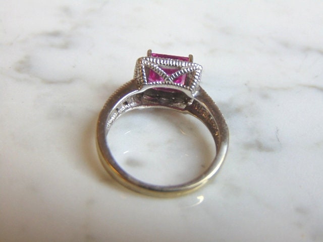 FOR SALE IS THIS LOVELY WOMEN'S 10K WHITE GOLD RING WITH WHAT APPEARS TO BE A LARGE PINK  SAPPHIRE STONE WITH DIAMOND ACCENTS. THE RING WEIGHS 3.9g, AND IS A SIZE 6.25.  THERE ARE ABOUT .25cts OF DIAMONDS.  NOT SURE IF THE PINK SAPPHIRE STONE IS NATURAL OR MAN MADE.  THE DIAMONDS I DO KNOW ARE REAL.  ANY QUESTIONS, PLEASE DO NOT HESITATE TO ASK. THIS MAKES A WONDERFUL GIFT FOR THAT SOMEONE SPECIAL.  BE SURE TO CHECK OUT SOME OF MY OTHER GREAT ITEMS UP FOR SALE.  THANK YOU.