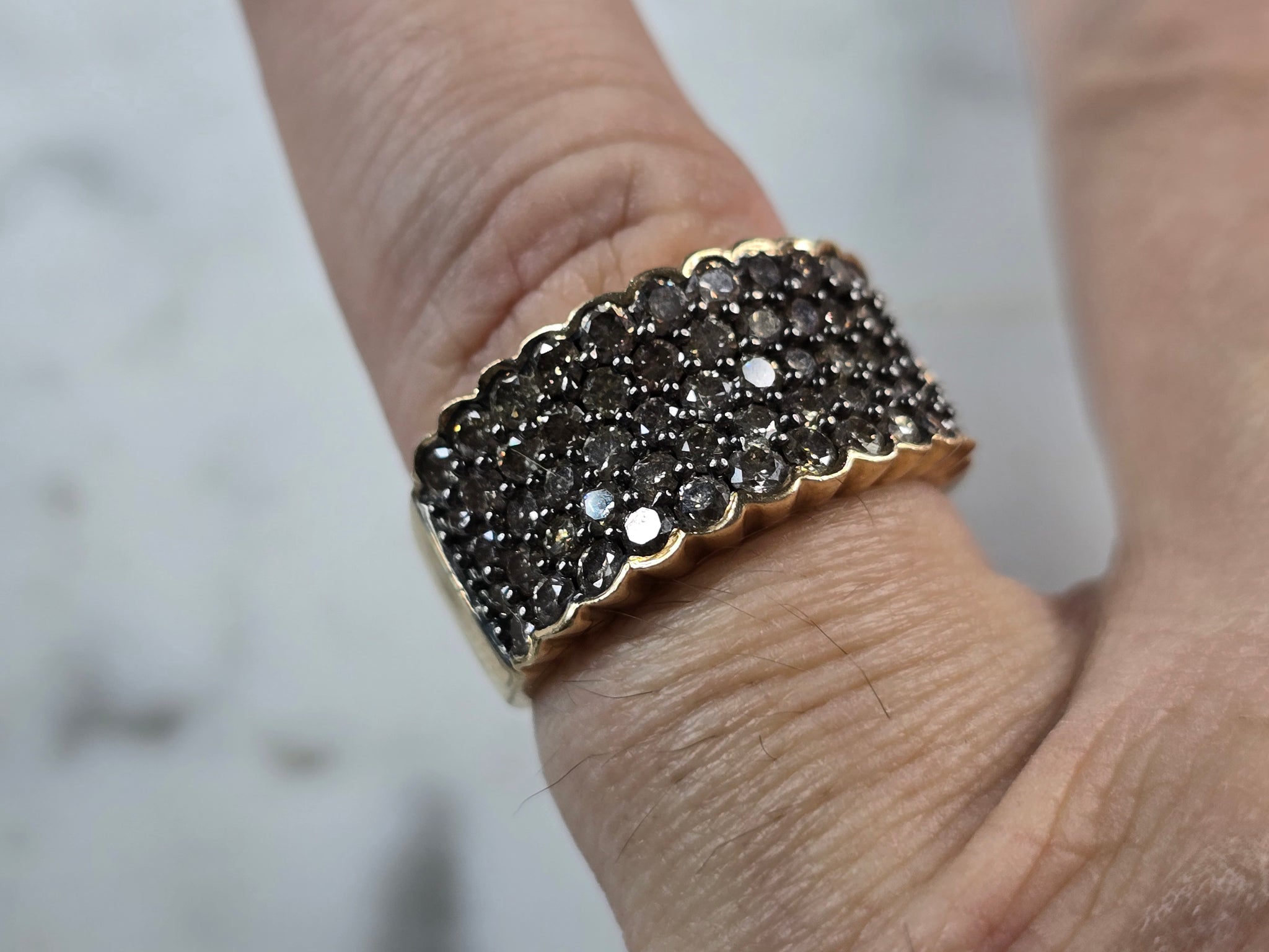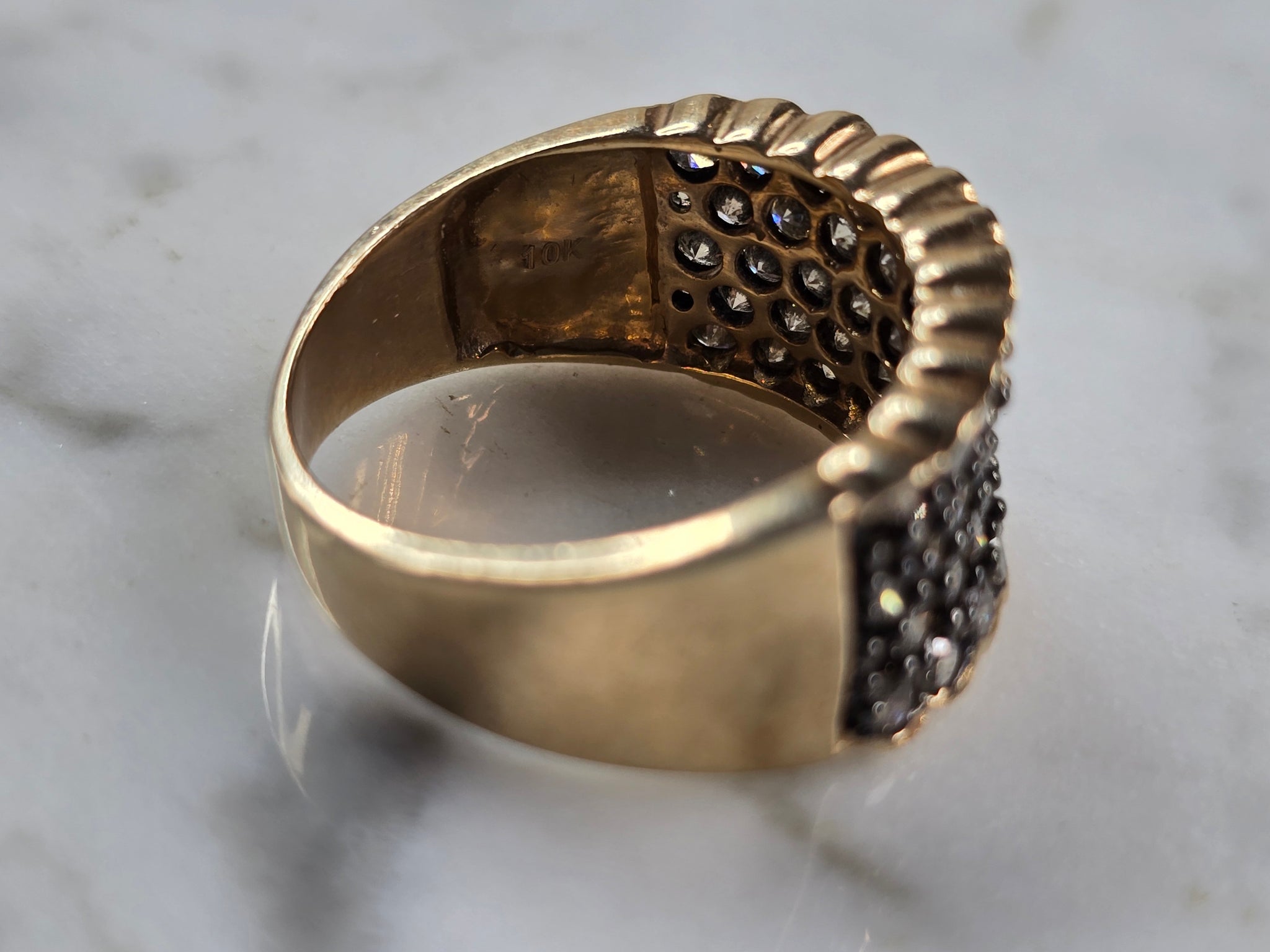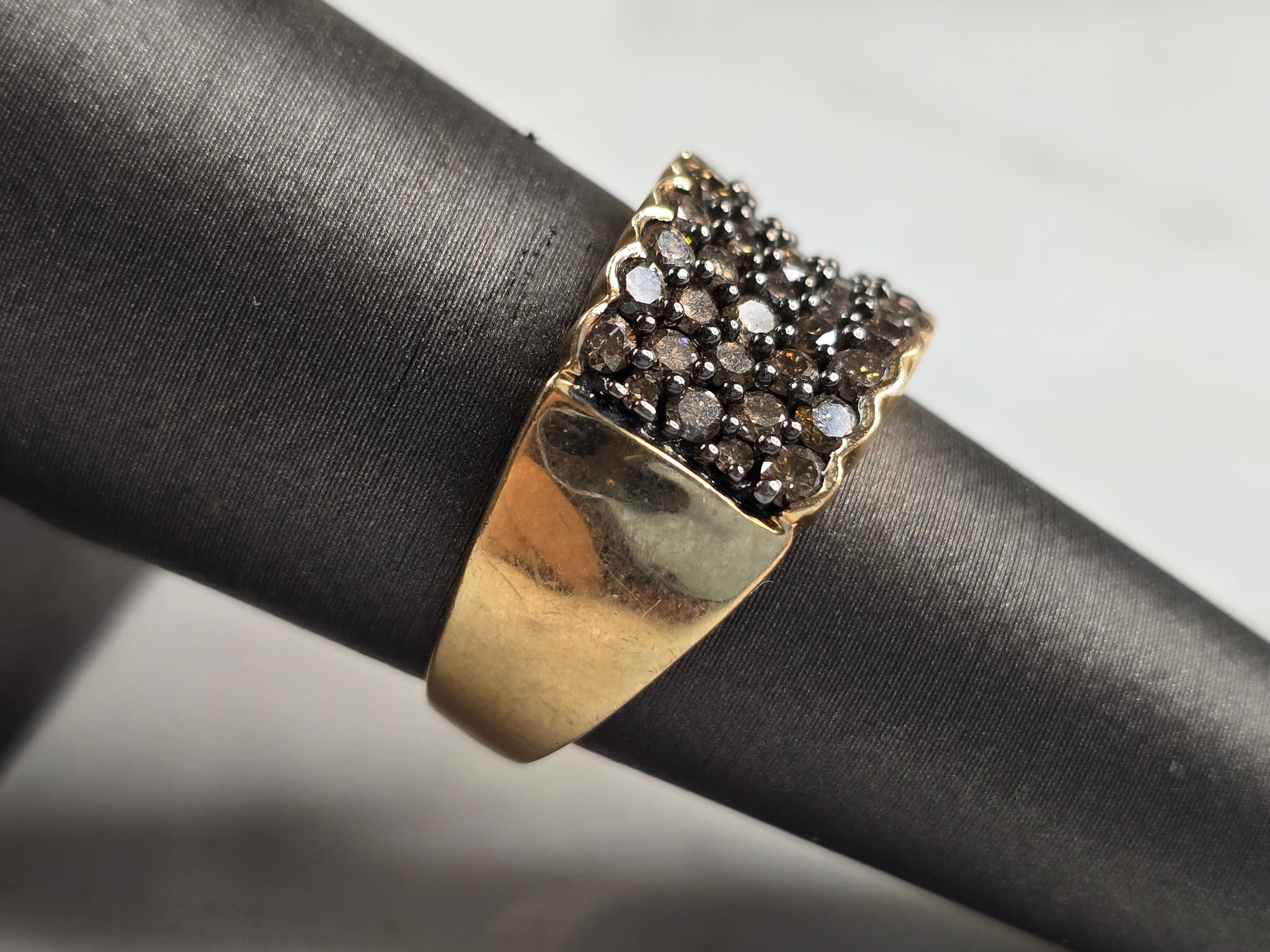 A WOMENS VINTAGE ESTATE 10K YELLOW GOLD CHOCOLATE DIAMOND RING.   THE RING WEIGHS 5.0g, AND IS A SIZE  7.0.  THE WIDTH OF THE RING IS 3/8".  THERE ARE ABOUT 56 TINY DIAMONDS IN THIS RING.  THIS MAKES A LOVELY GIFT FOR THAT SOMEONE SPECIAL.  ANY QUESTIONS PLEASE, DO NOT HESITATE TO ASK. BE SURE TO CHECK OUT SOME OF MY OTHER GREAT ITEMS UP FOR SALE.  THANK YOU.