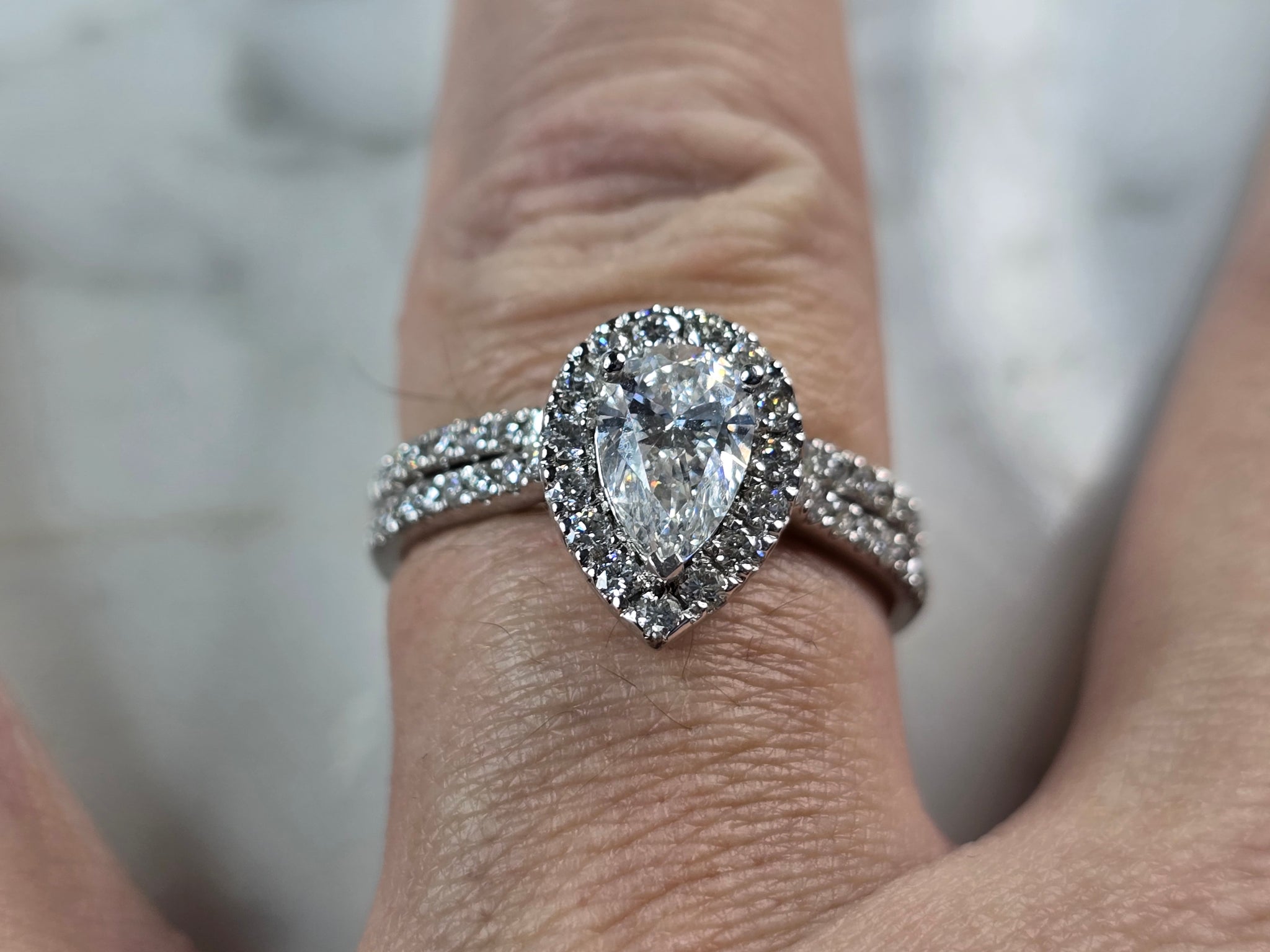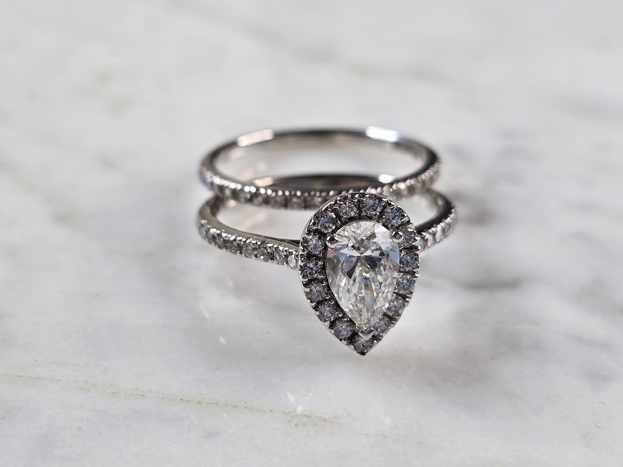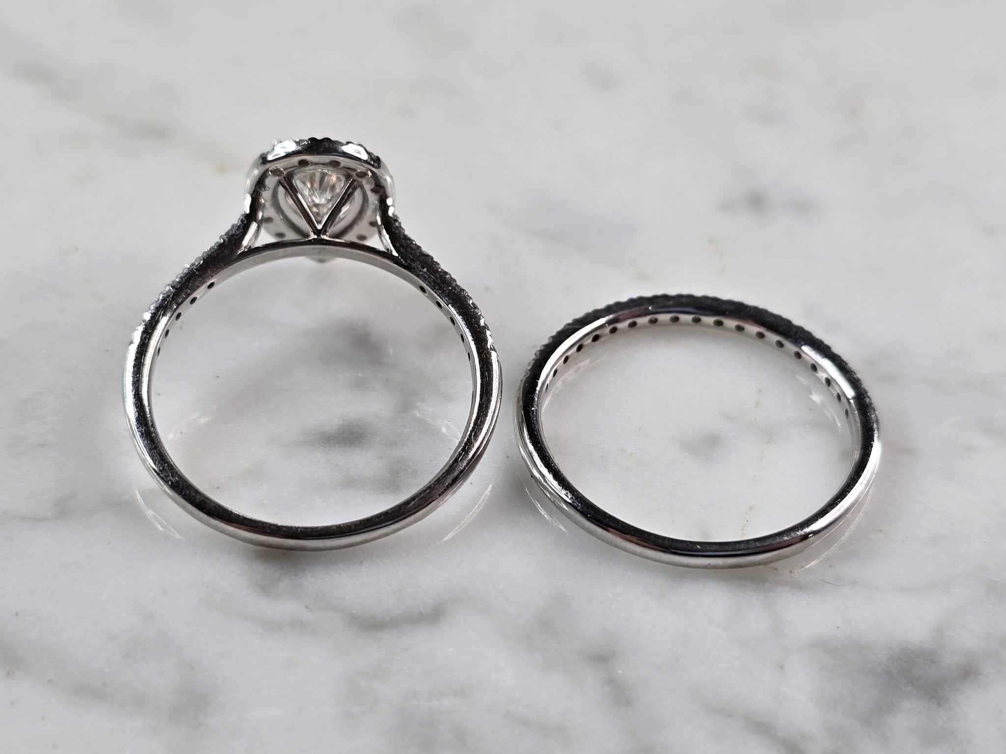 A WOMENS ESTATE 14K WHITE GOLD LAB CREATED DIAMOND RING SET. THE RINGS TOGETHER WEIGH 5.2g AND ARE A SIZE 9.5.  THE LENGTH OF THE RING IS ABOUT 1/2". THE CENTER DIAMOND IS ABOUT 0.75cts. THERE ARE 50 TINY ACCENT DIAMONDS.   RING IS MARKED.  ANY QUESTIONS PLEASE FEEL FREE TO ASK.  BE SURE TO CHECK OUT SOME OF MY OTHER GREAT ITEMS UP FOR SALE. THANK YOU