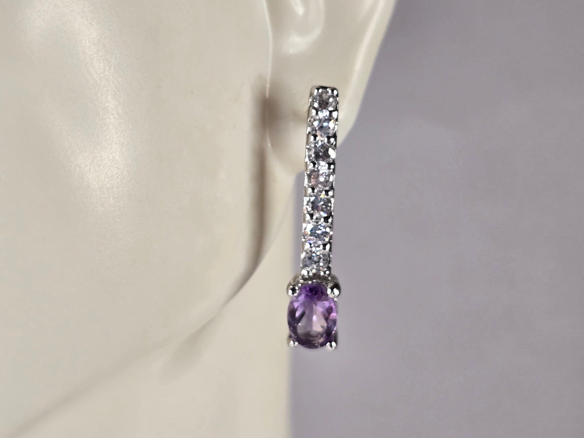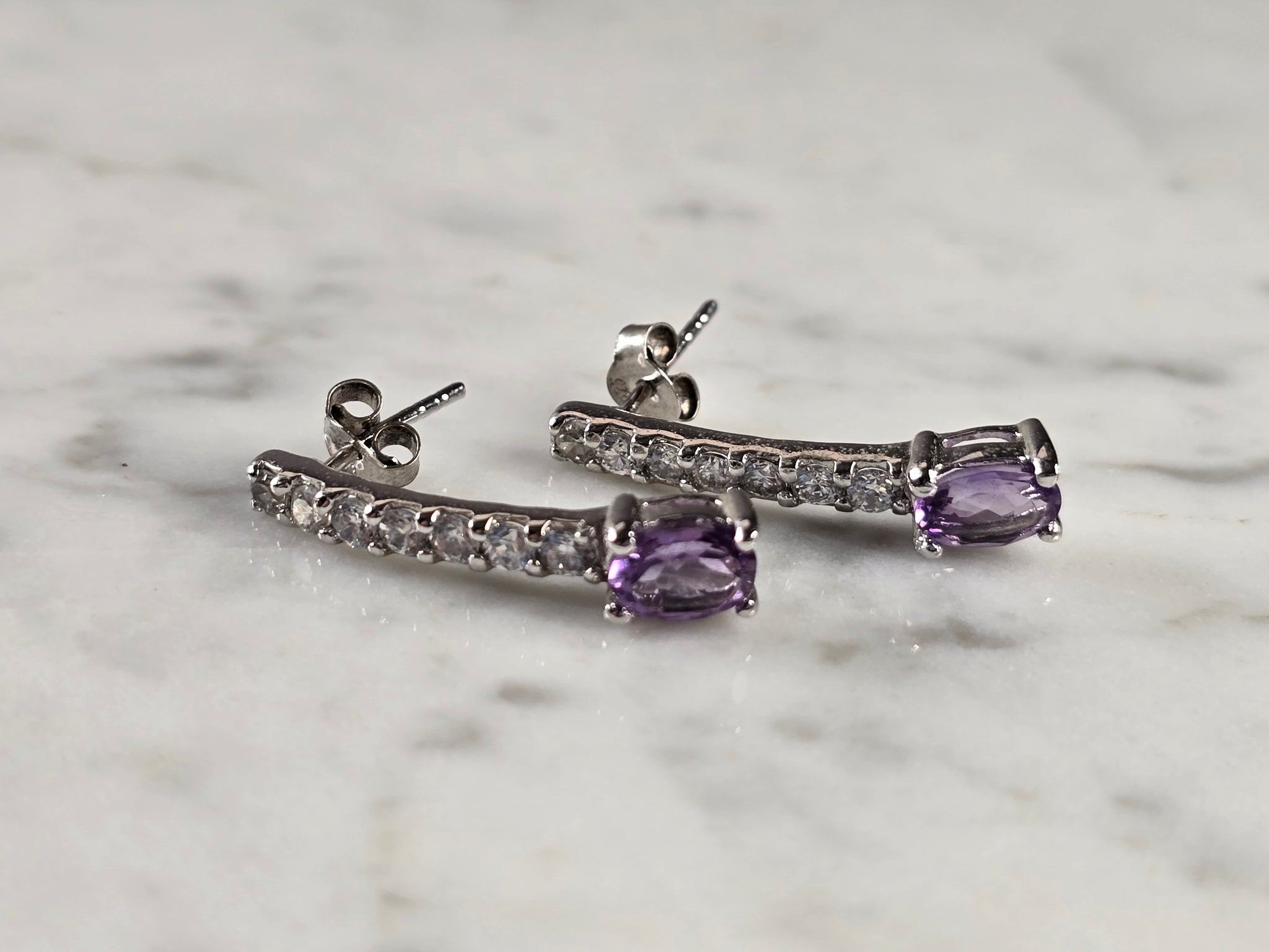 A PAIR OF WOMENS ESTATE STERLING SILVER AMETHYST COLORED EARRINGS.  EARRINGS WEIGH 3.0g, AND MEASURE  1" LONG BY  3/16" WIDE.  ANY QUESTIONS, PLEASE DO NOT HESITATE TO ASK.  BE SURE TO CHECK OUT SOME OF MY OTHER GREAT ITEMS UP FOR SALE. THANK YOU