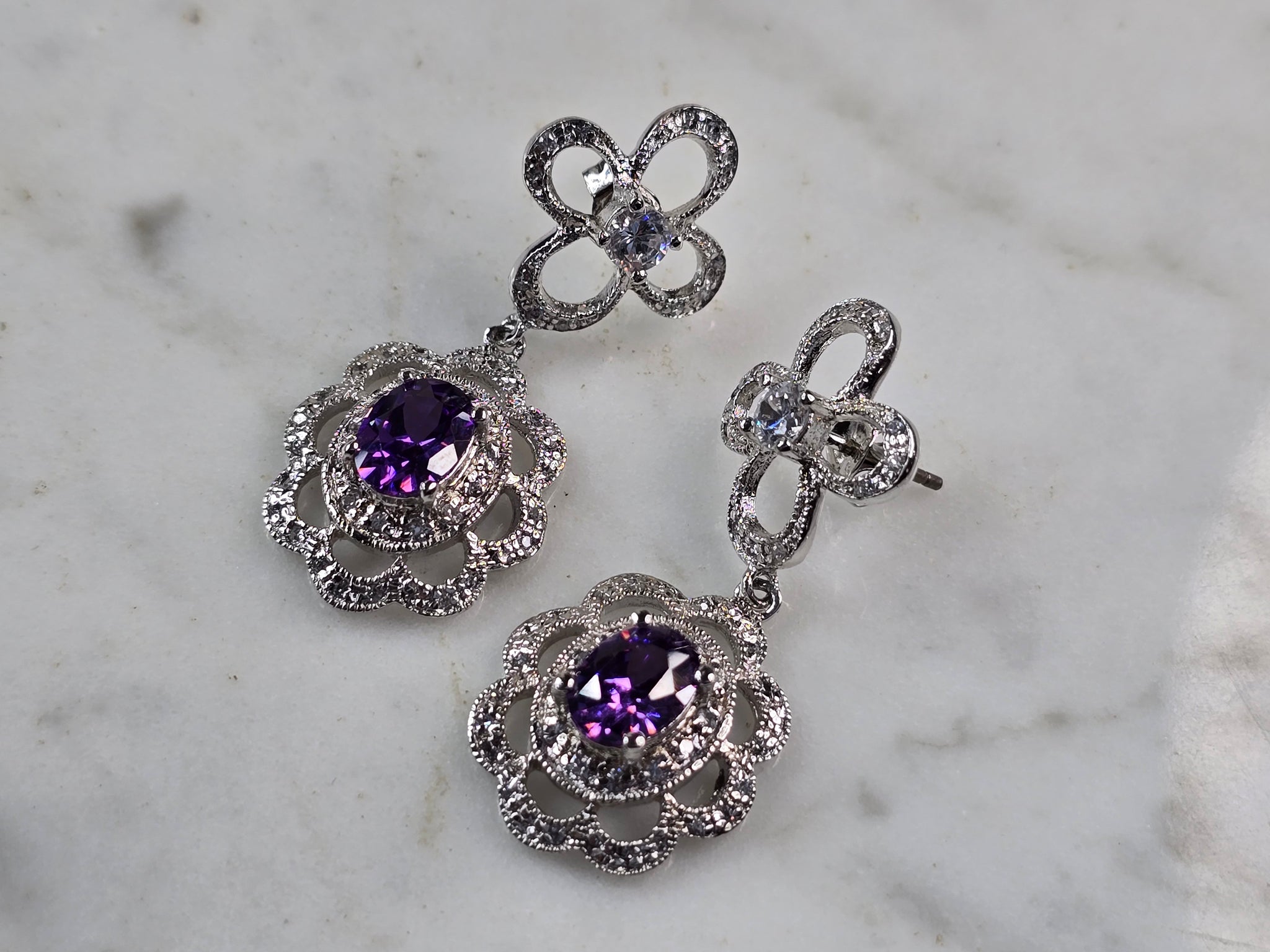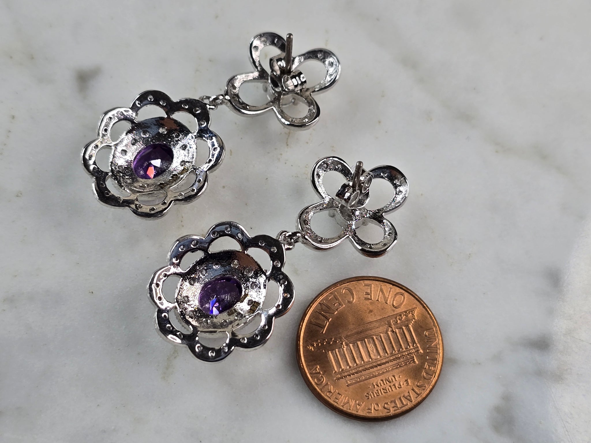 A PAIR OF WOMENS ESTATE STERLING SILVER AMETHYST COLORED EARRINGS.  EARRINGS WEIGH 8.4g, AND MEASURE  1 1/2" LONG BY  3/4" WIDE.  NOT SURE IF STONES ARE NATURAL OR MANMADE.   ANY QUESTIONS, PLEASE DO NOT HESITATE TO ASK.  BE SURE TO CHECK OUT SOME OF MY OTHER GREAT ITEMS UP FOR SALE. THANK YOU