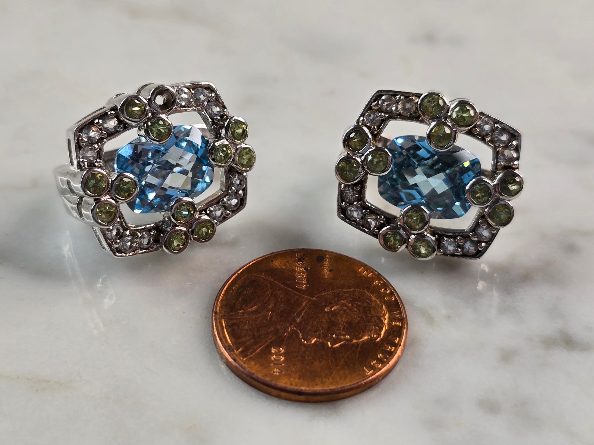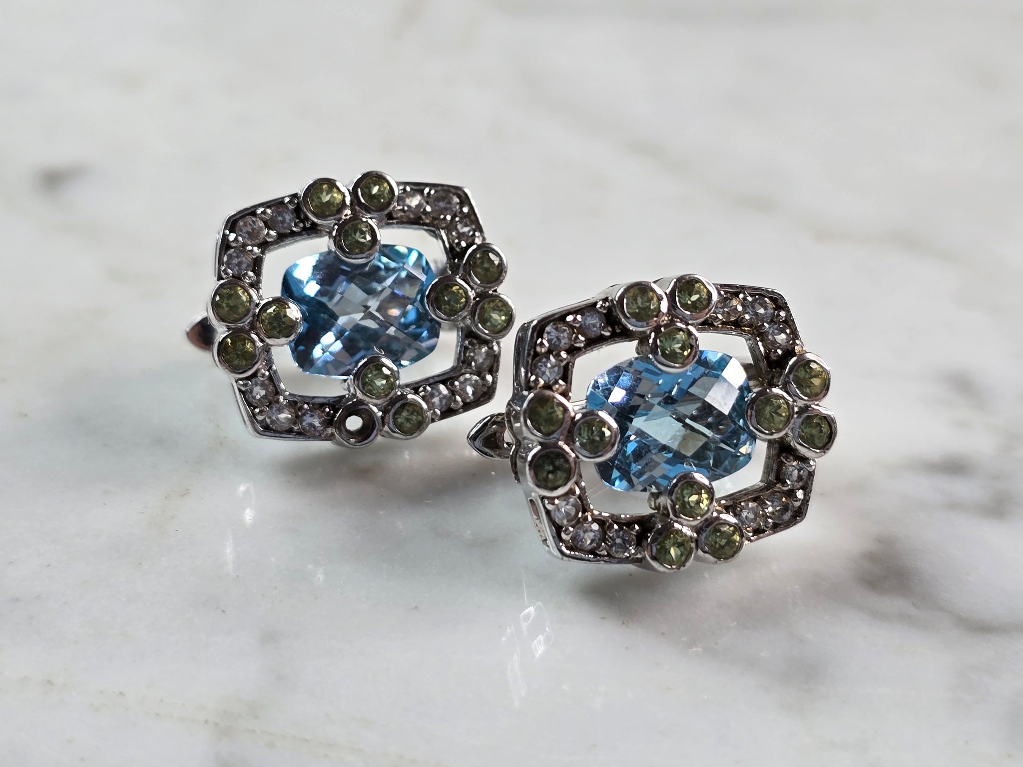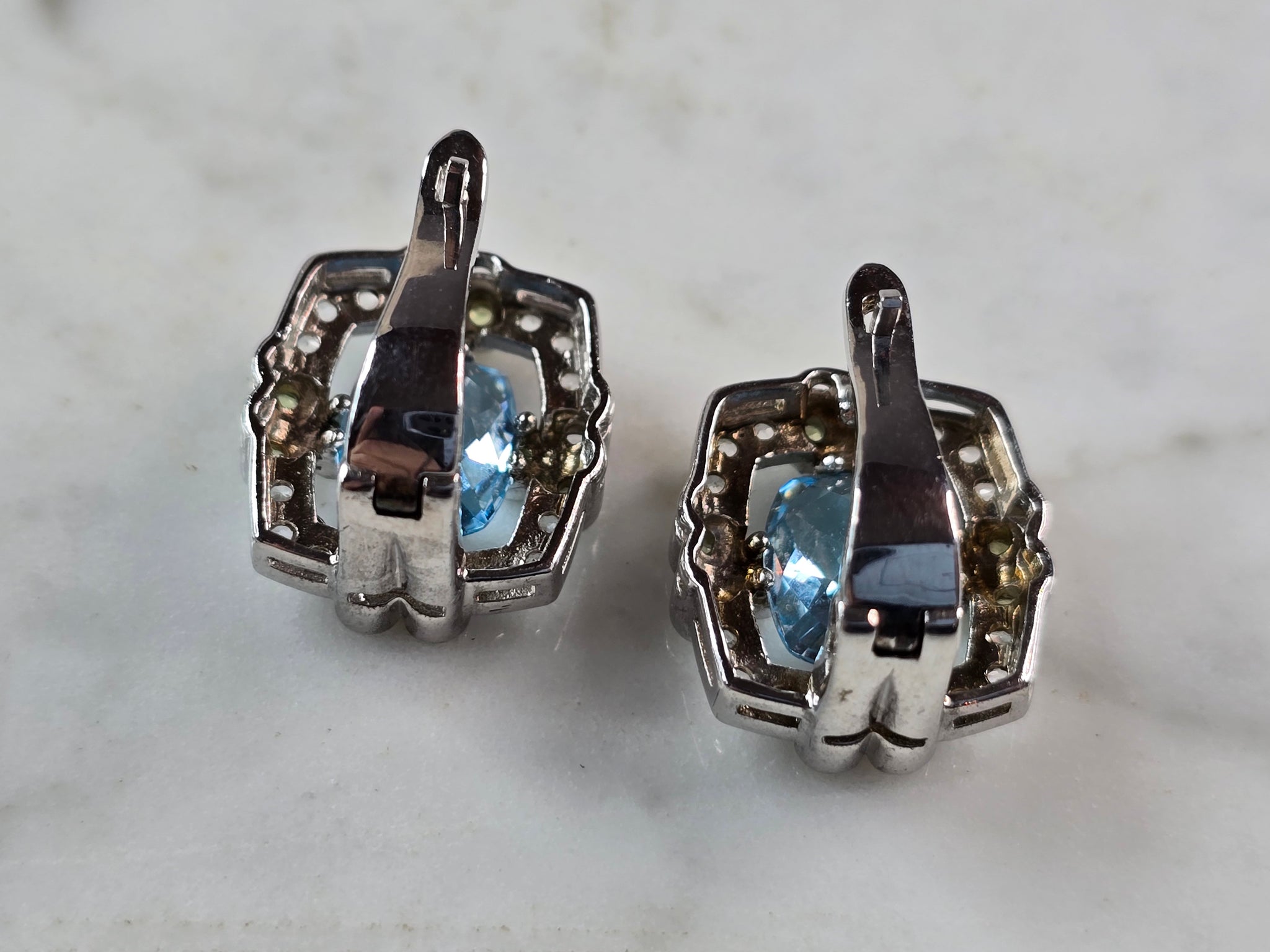A PAIR OF WOMENS ESTATE STERLING SILVER AQUAMARINE COLORED EARRINGS WITH PERIDOT COLORED ACCENTS.  EARRINGS WEIGH 11.0g AND MEASURE  3/4" LONG BY  5/8" WIDE.  ANY QUESTIONS, PLEASE DO NOT HESITATE TO ASK.  BE SURE TO CHECK OUT SOME OF MY OTHER GREAT ITEMS UP FOR SALE. THANK YOU