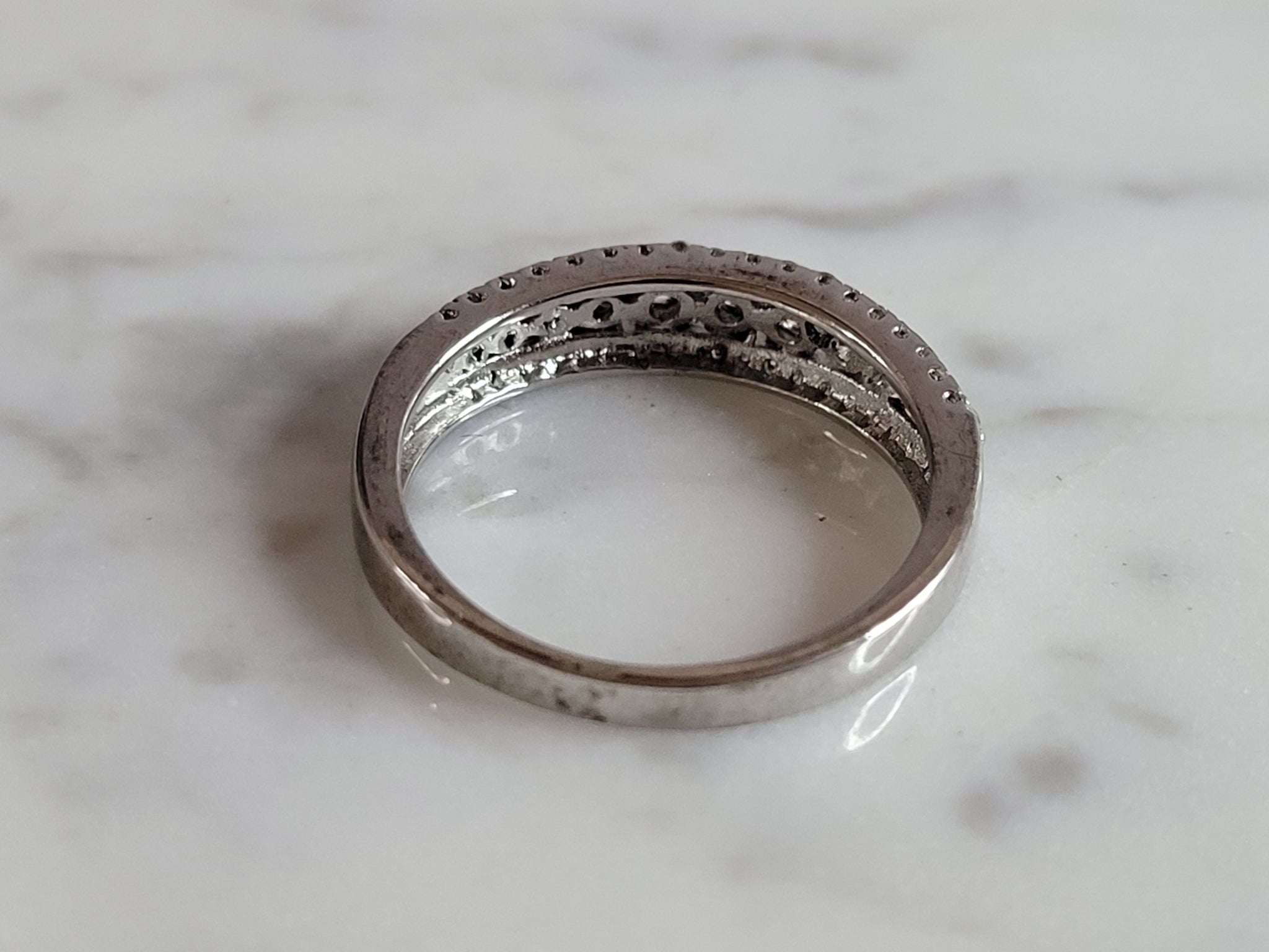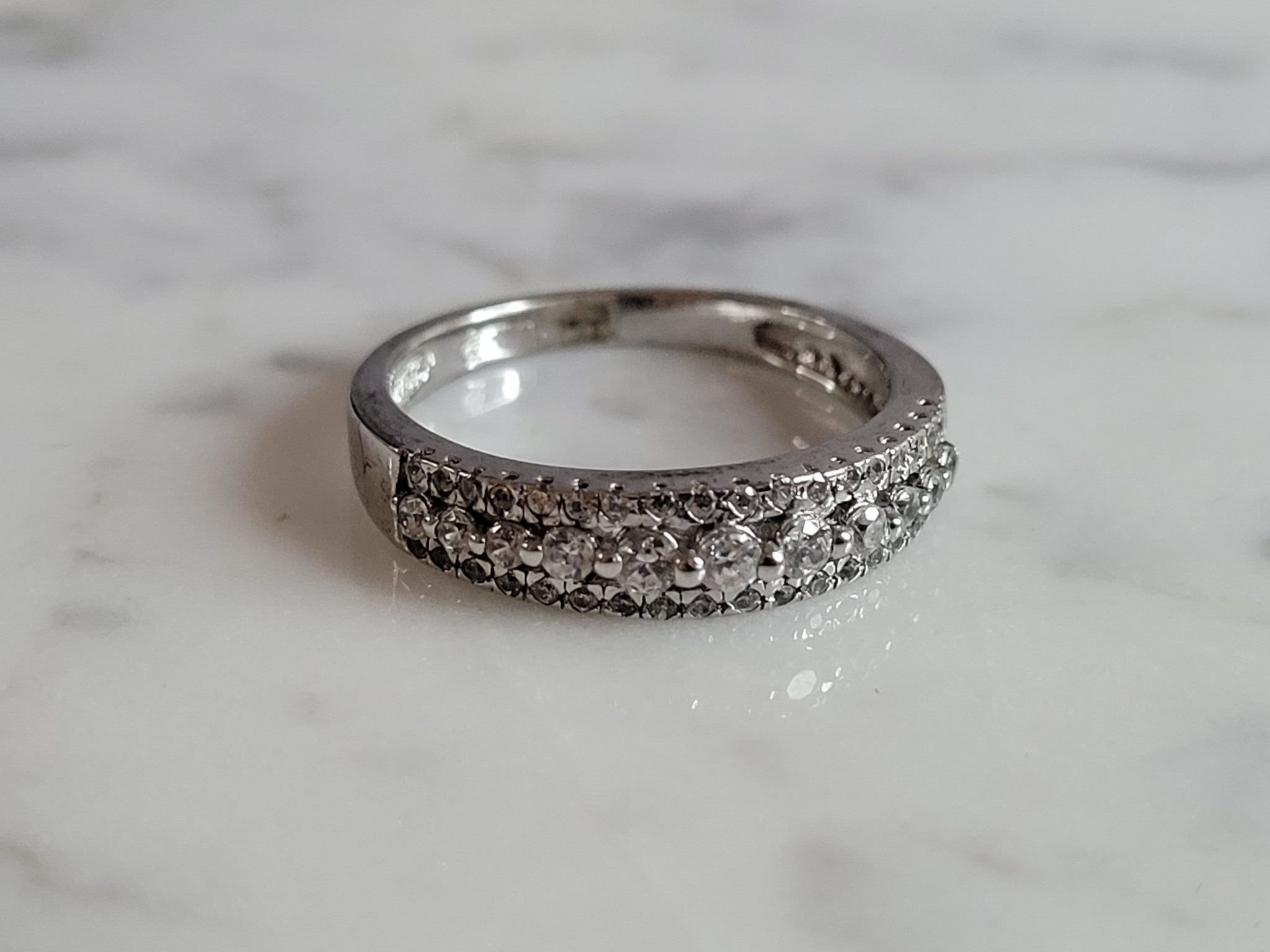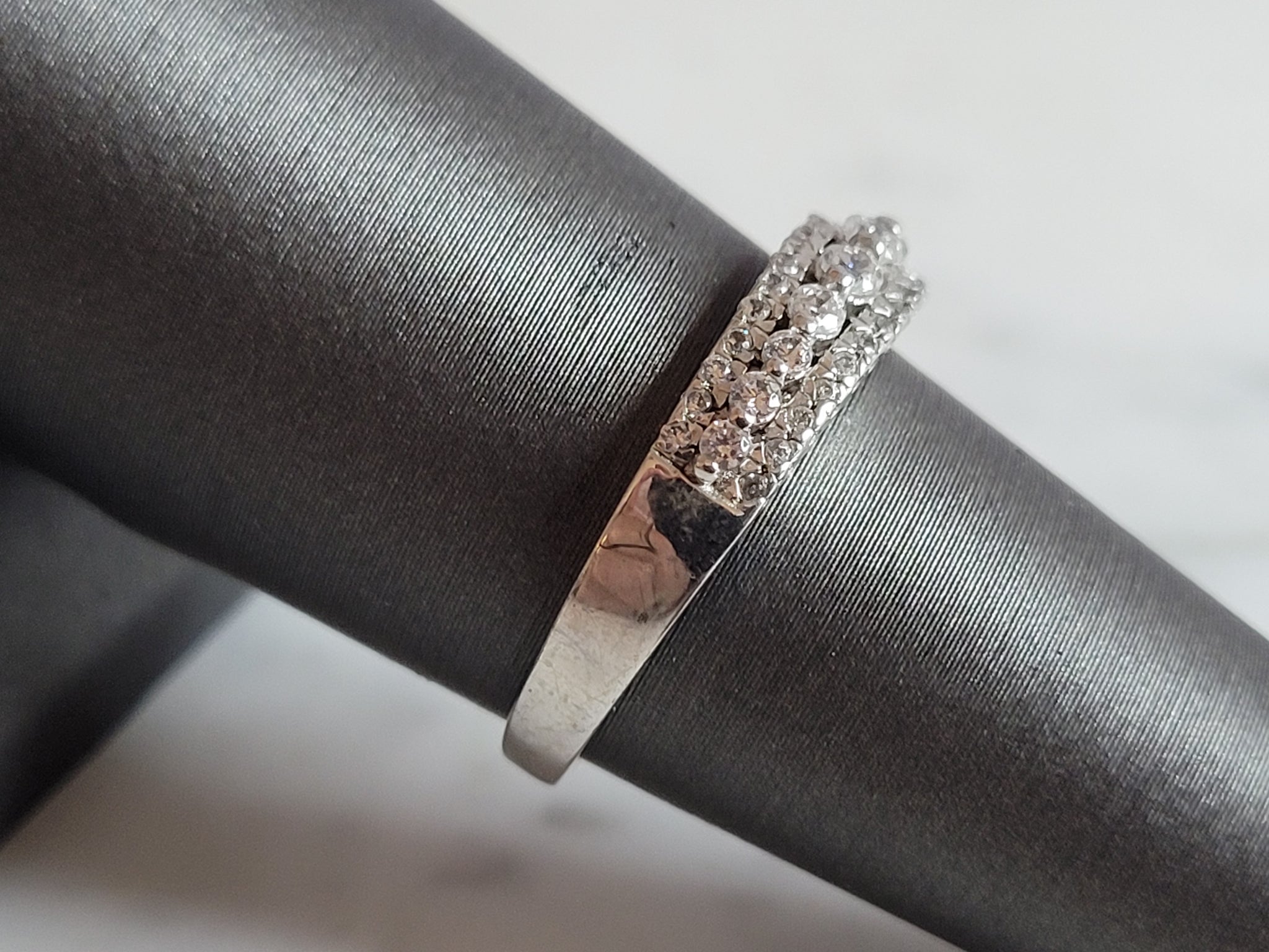 A WOMENS ESTATE STERLING SILVER CZ RING THAT WEIGHS 2.2g. THE RING IS A SIZE 6.75, AND MEASURES ABOUT 1/4" WIDE. THIS WOULD MAKE A NICE GIFT FOR THAT SOMEONE SPECIAL. ANY QUESTIONS PLEASE DO NOT HESITATE TO ASK. BE SURE TO CHECK OUT SOME OF MY OTHER GREAT ITEMS UP FOR SALE. THANK YOU.