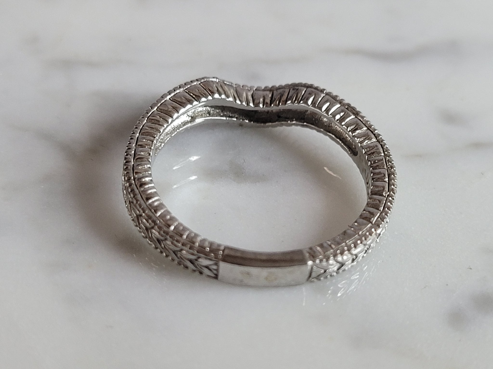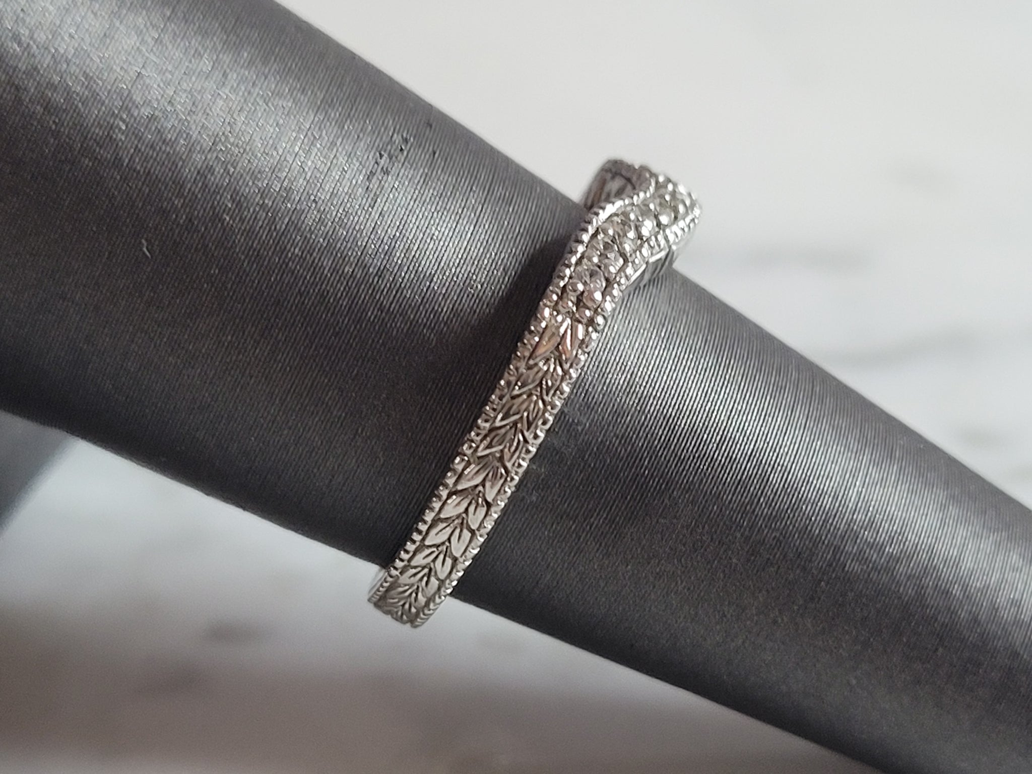 A WOMENS ESTATE STERLING SILVER CZ SPACER RING THAT WEIGHS 2.6g. THE RING IS A SIZE 6.0, AND MEASURES ABOUT 1/8" WIDE. THIS WOULD MAKE A NICE GIFT FOR THAT SOMEONE SPECIAL. ANY QUESTIONS PLEASE DO NOT HESITATE TO ASK. BE SURE TO CHECK OUT SOME OF MY OTHER GREAT ITEMS UP FOR SALE. THANK YOU.