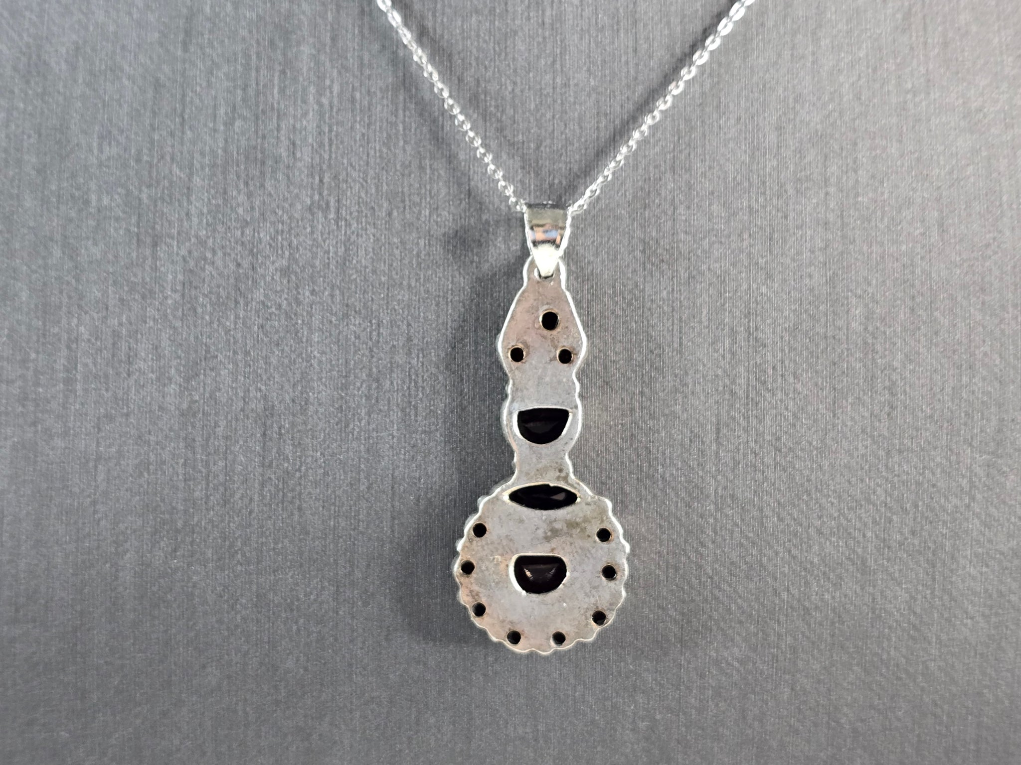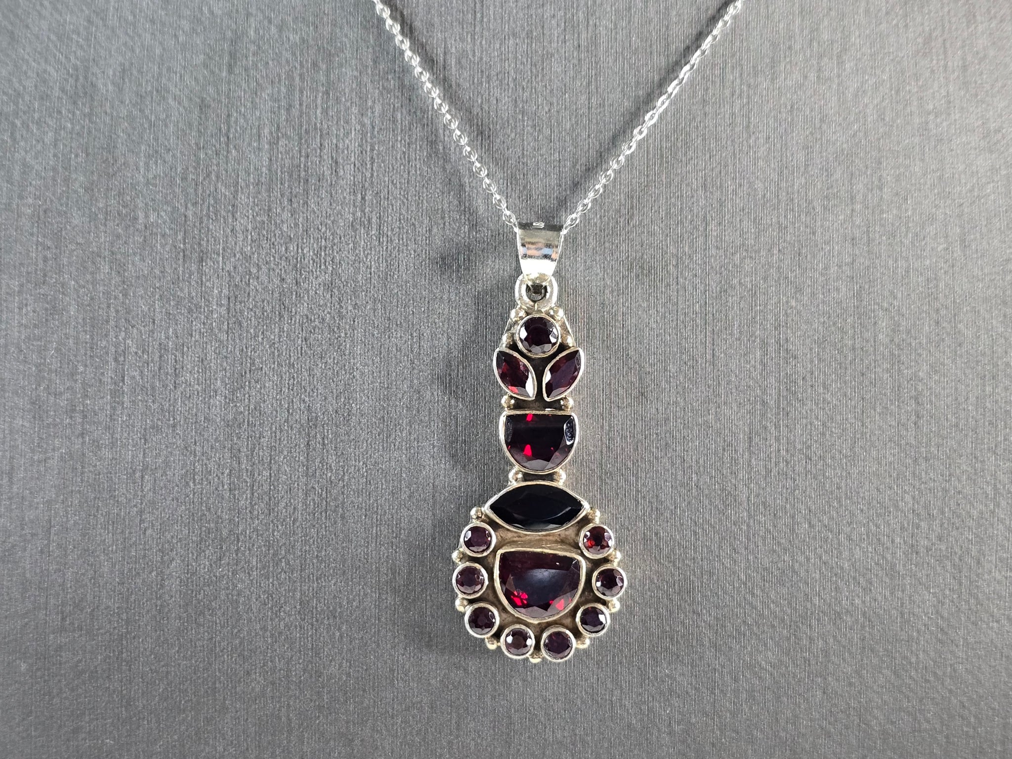 A WOMENS ESTATE STERLING SILVER PENDANT WITH GARNET COLORED STONES. PENDANT WITH NECKLACE WEIGHS 10.1g. THE PENDANT MEASURES 1 3/4" LONG BY 5/8" WIDE, AND THE NECKLACE MEASURES 18" LONG. NOT SURE IF THE STONES ARE NATURAL OR MAN MADE. MAKES A GREAT GIFT FOR THAT SOMEONE SPECIAL. ANY QUESTIONS, PLEASE ASK. BE SURE TO CHECK OUT OUR OTHER ITEMS FOR SALE.