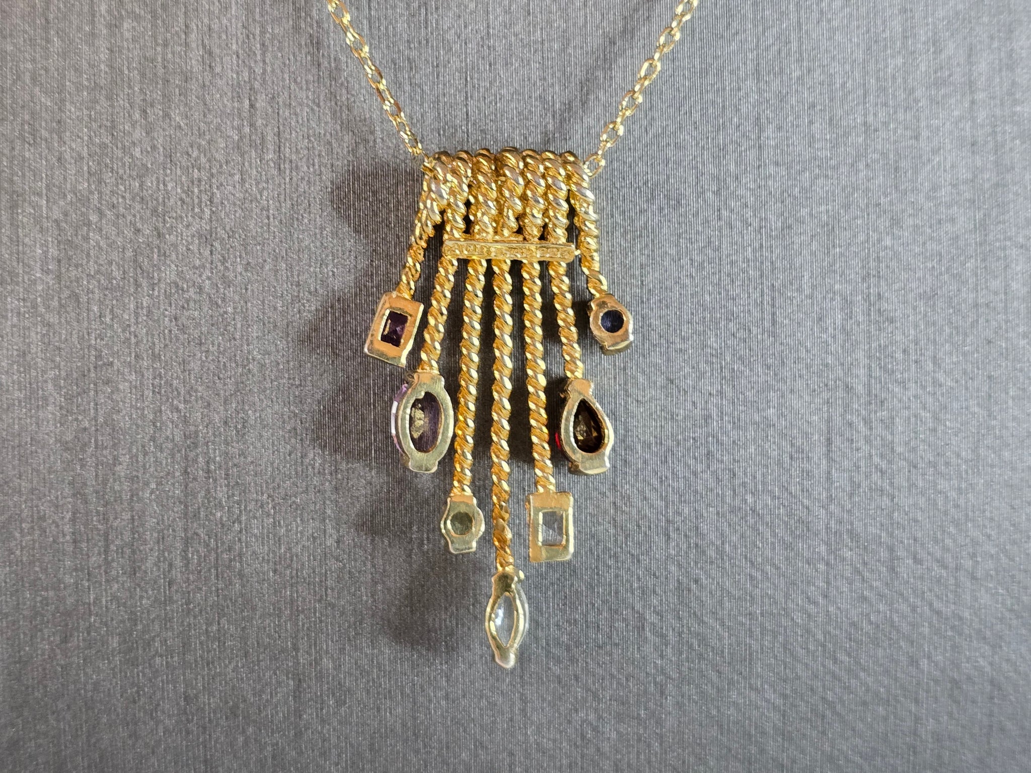 A WOMENS VINTAGE ESTATE STERLING SILVER GOLD TONE MODERNIST MULTI STONE PENDANT WITH NECKLACE. THE NECKLACE MEASURES ABOUT 19 3/4" LONG, AND THE PENDANT MEASURES 1 1/2" LONG BY 3/4" WIDE. TOGETHER THEY WEIGH 6.6g. NOT SURE IF THE STONES ARE NATURAL OR MAN MADE. ANY QUESTIONS PLEASE DO NOT HESITATE TO ASK. BE SURE TO CHECK OUT SOME OF MY OTHER GREAT ITEMS UP FOR SALE. THANK YOU.