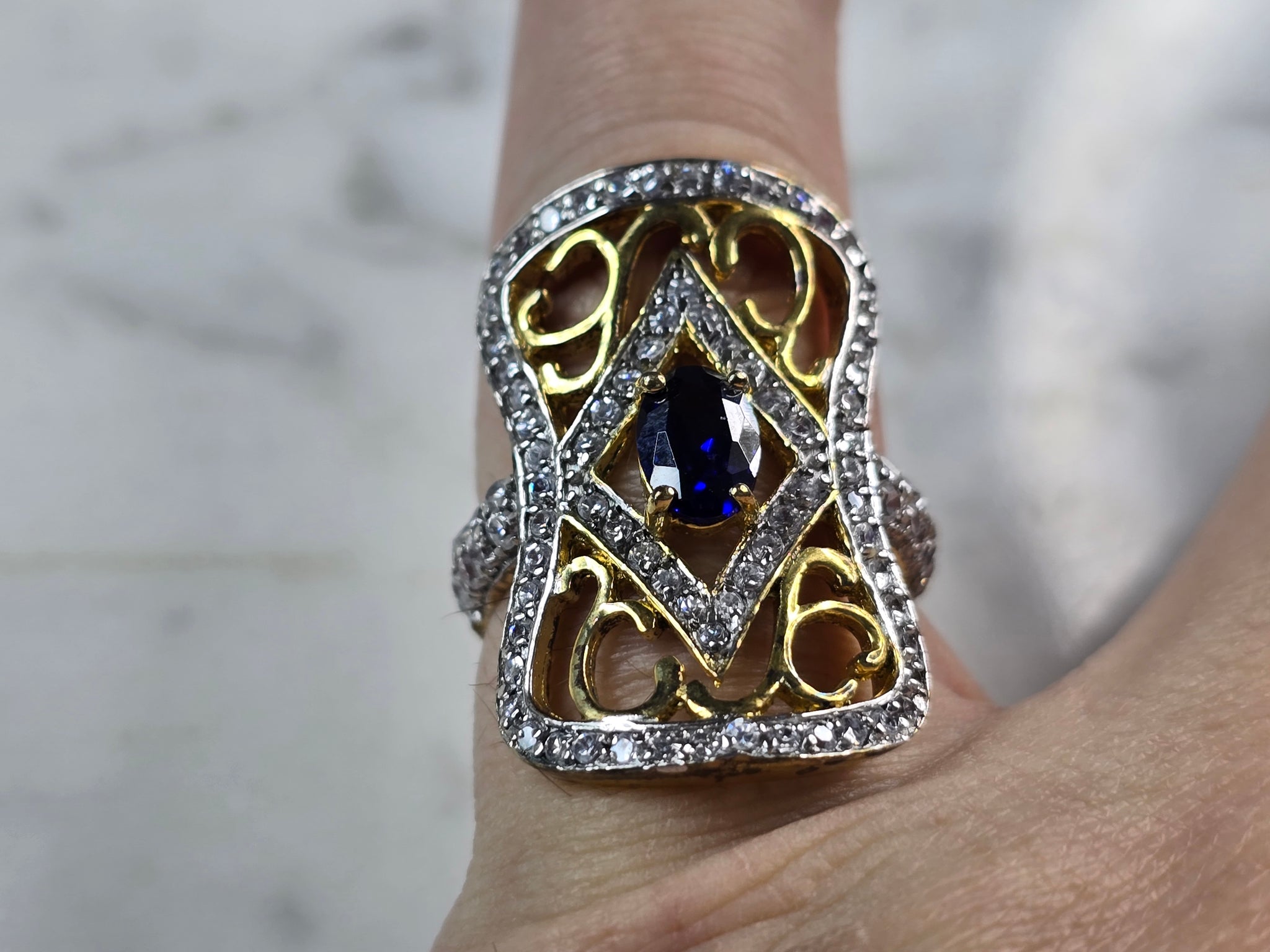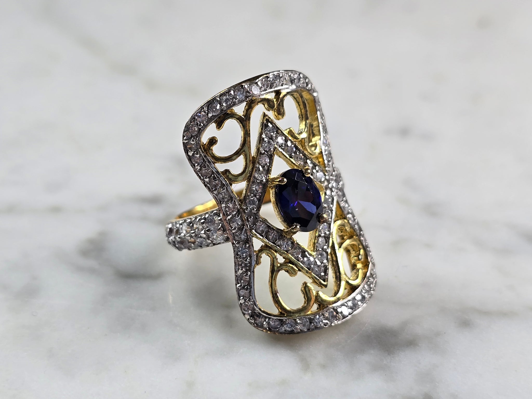 A WOMENS VINTAGE ESTATE STERLING SILVER GOLD TONE RING. THE RING WEIGHS 6.6g, AND IS A SIZE 7.0. THE LENGTH OF THE RING IS 1 1/8". ANY QUESTIONS, PLEASE DO NOT HESITATE TO ASK. THIS MAKES A WONDERFUL GIFT FOR THAT SOMEONE SPECIAL. BE SURE TO CHECK OUT SOME OF MY OTHER GREAT ITEMS UP FOR SALE. THANK YOU.