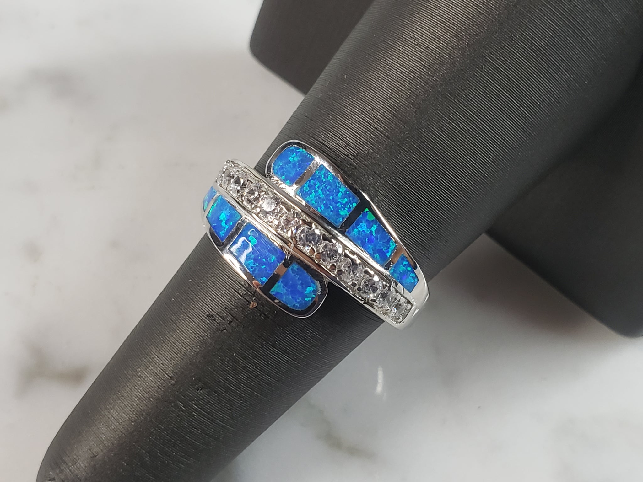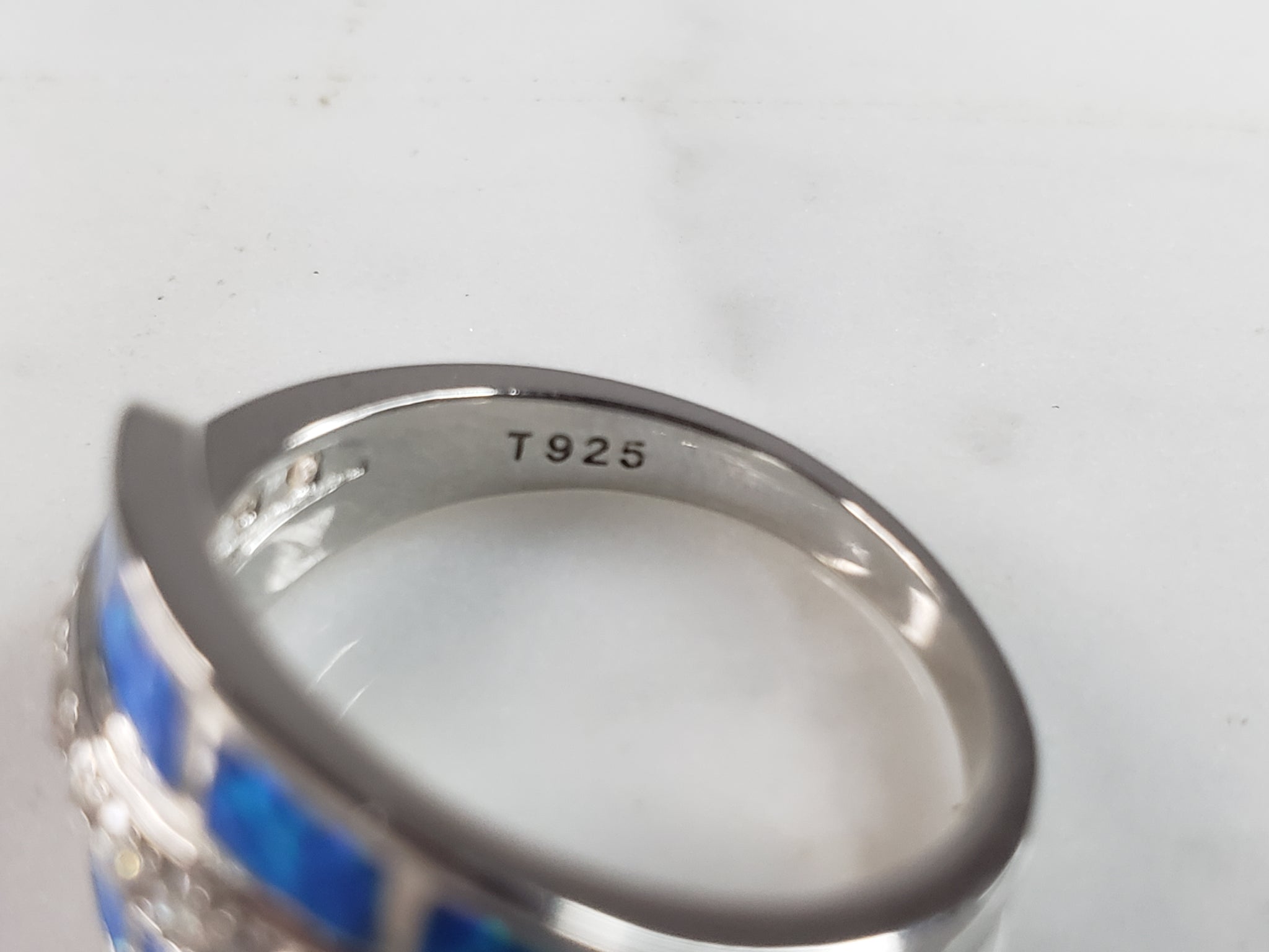 A WOMENS ESTATE STERLING SILVER MODERNIST BLUE OPAL COLORED RING. THE RING IS A SIZE 7.0 AND WEIGHS 4.5g. WIDTH OF RING MEASURES 1/2". NOT SURE IF STONE IS NATURAL OR MAN MADE. THE RING MAKES A BEAUTIFUL GIFT FOR THAT SOMEONE SPECIAL. ANY OTHER QUESTIONS, PLEASE ASK. BE SURE TO CHECK OUT SOME OF MY OTHER GREAT ITEMS UP FOR SALE. THANK YOU.