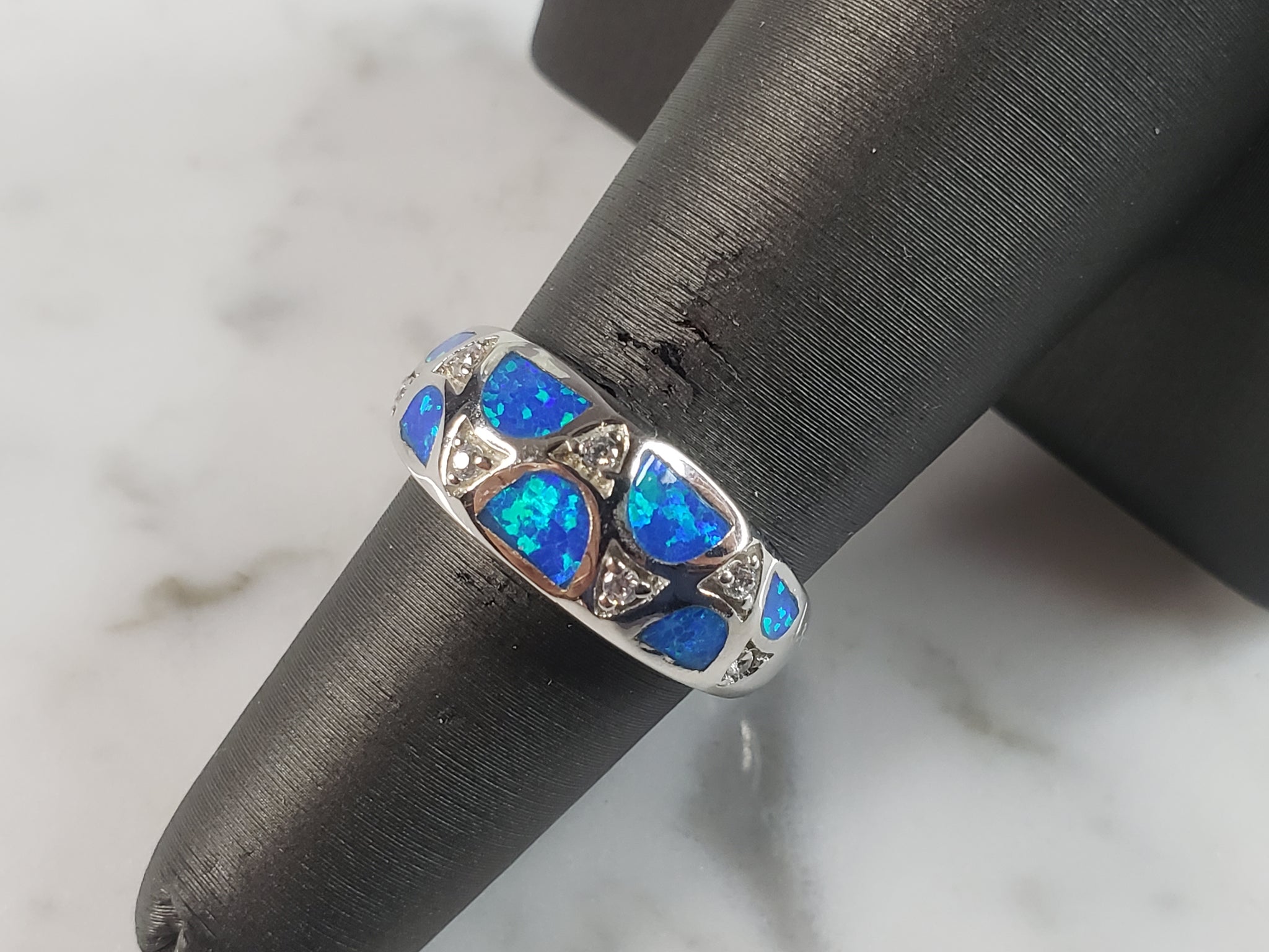 A WOMENS ESTATE STERLING SILVER MODERNIST BLUE OPAL COLORED RING. THE RING IS A SIZE 6.0 AND WEIGHS 4.6g. WIDTH OF RING MEASURES 3/8". NOT SURE IF STONE IS NATURAL OR MAN MADE. THE RING MAKES A BEAUTIFUL GIFT FOR THAT SOMEONE SPECIAL. ANY OTHER QUESTIONS, PLEASE ASK. BE SURE TO CHECK OUT SOME OF MY OTHER GREAT ITEMS UP FOR SALE. THANK YOU.