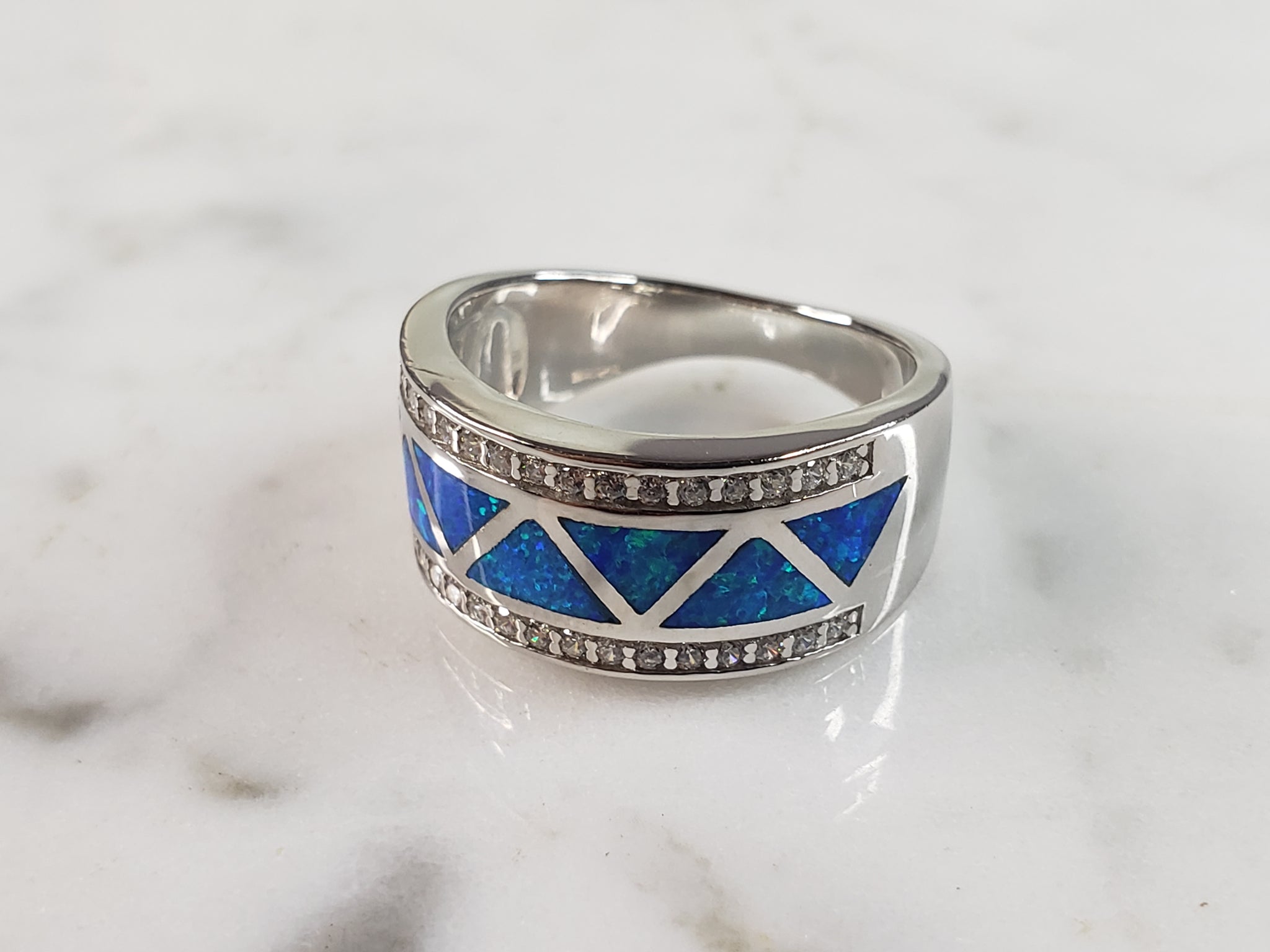 A WOMENS ESTATE STERLING SILVER MODERNIST BLUE OPAL COLORED RING. THE RING IS A SIZE 6.25 AND WEIGHS 5.2g. WIDTH OF RING MEASURES 3/8". NOT SURE IF STONE IS NATURAL OR MAN MADE. THE RING MAKES A BEAUTIFUL GIFT FOR THAT SOMEONE SPECIAL. ANY OTHER QUESTIONS, PLEASE ASK. BE SURE TO CHECK OUT SOME OF MY OTHER GREAT ITEMS UP FOR SALE. THANK YOU.