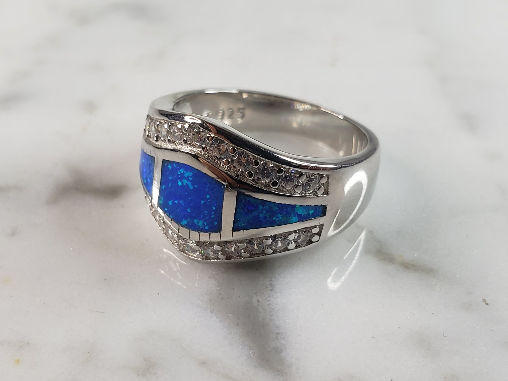 A WOMENS ESTATE STERLING SILVER MODERNIST BLUE OPAL COLORED RING. THE RING IS A SIZE 6.0 AND WEIGHS 5.7g. WIDTH OF RING MEASURES 1/2". NOT SURE IF STONE IS NATURAL OR MAN MADE. THE RING MAKES A BEAUTIFUL GIFT FOR THAT SOMEONE SPECIAL. ANY OTHER QUESTIONS, PLEASE ASK. BE SURE TO CHECK OUT SOME OF MY OTHER GREAT ITEMS UP FOR SALE. THANK YOU.