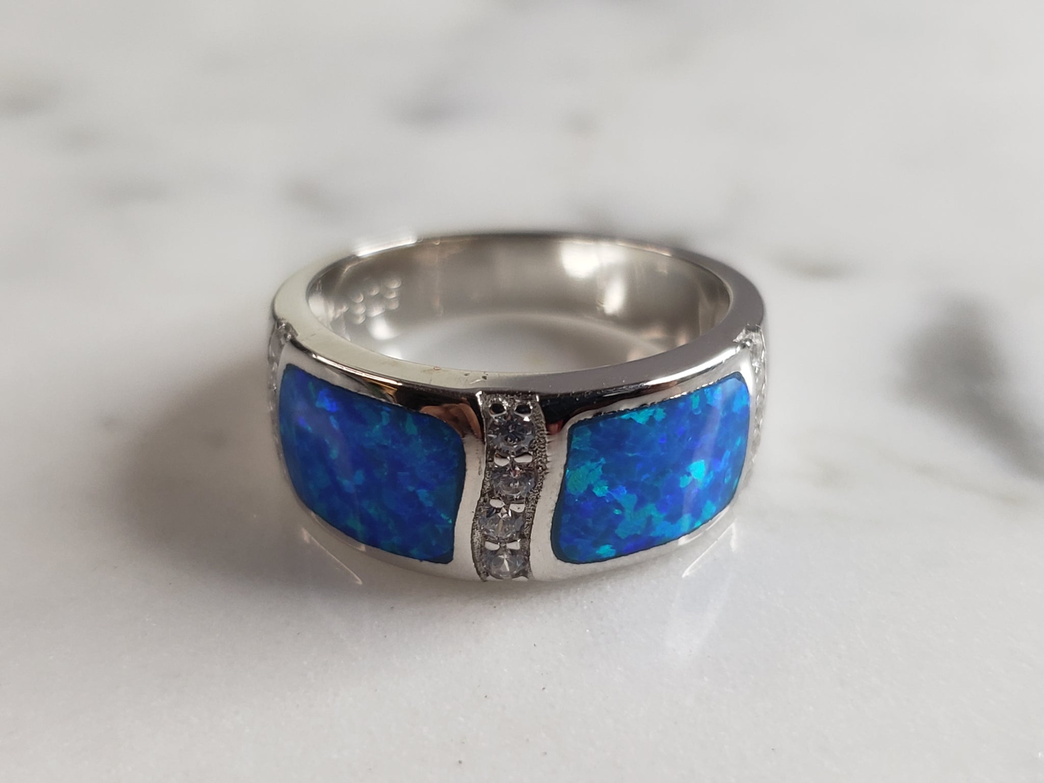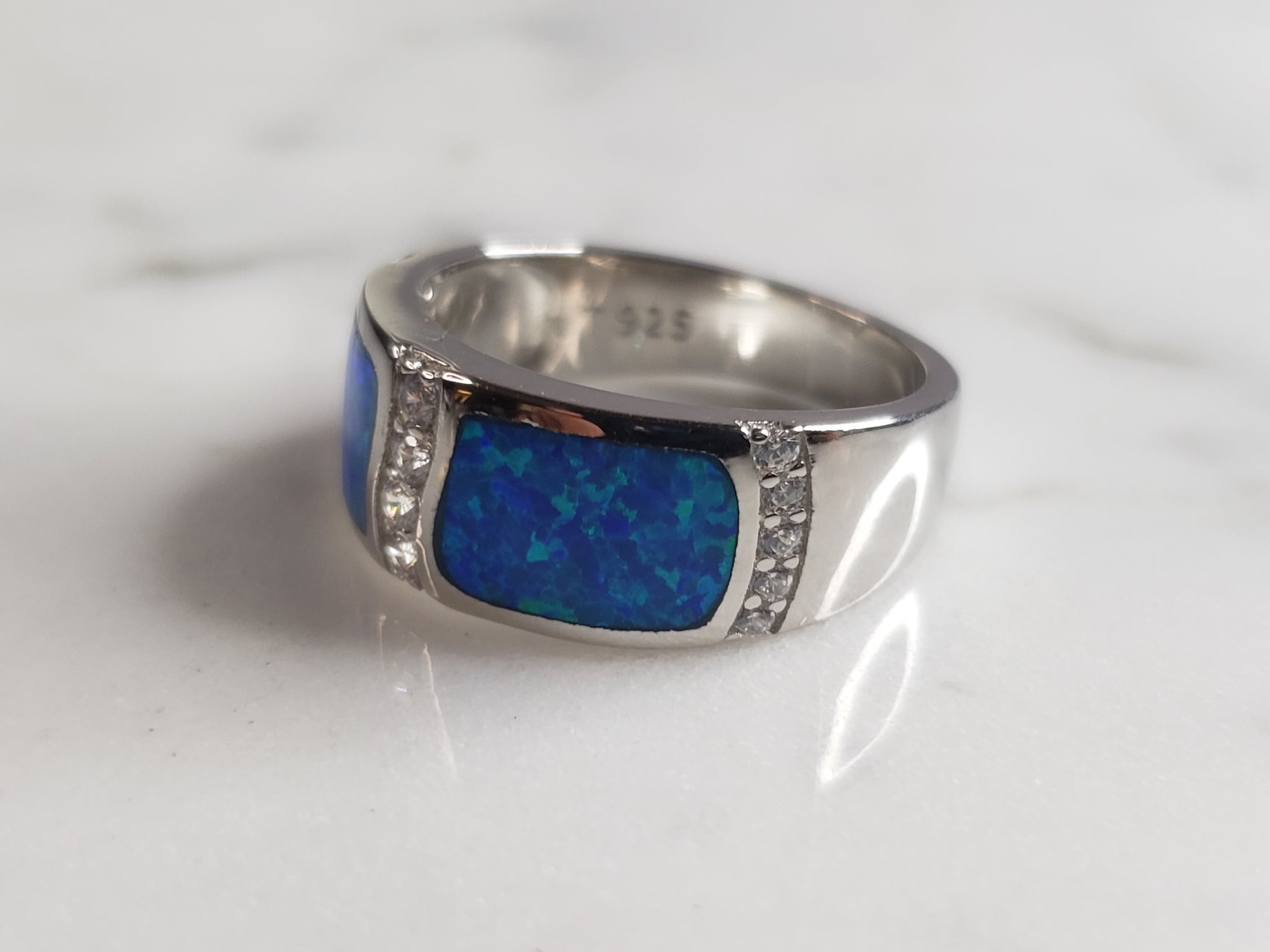 A WOMENS ESTATE STERLING SILVER MODERNIST BLUE OPAL COLORED RING. THE RING IS A SIZE 7.0 AND WEIGHS 5.0g. WIDTH OF RING MEASURES 3/8". NOT SURE IF STONE IS NATURAL OR MAN MADE. THE RING MAKES A BEAUTIFUL GIFT FOR THAT SOMEONE SPECIAL. ANY OTHER QUESTIONS, PLEASE ASK. BE SURE TO CHECK OUT SOME OF MY OTHER GREAT ITEMS UP FOR SALE. THANK YOU.