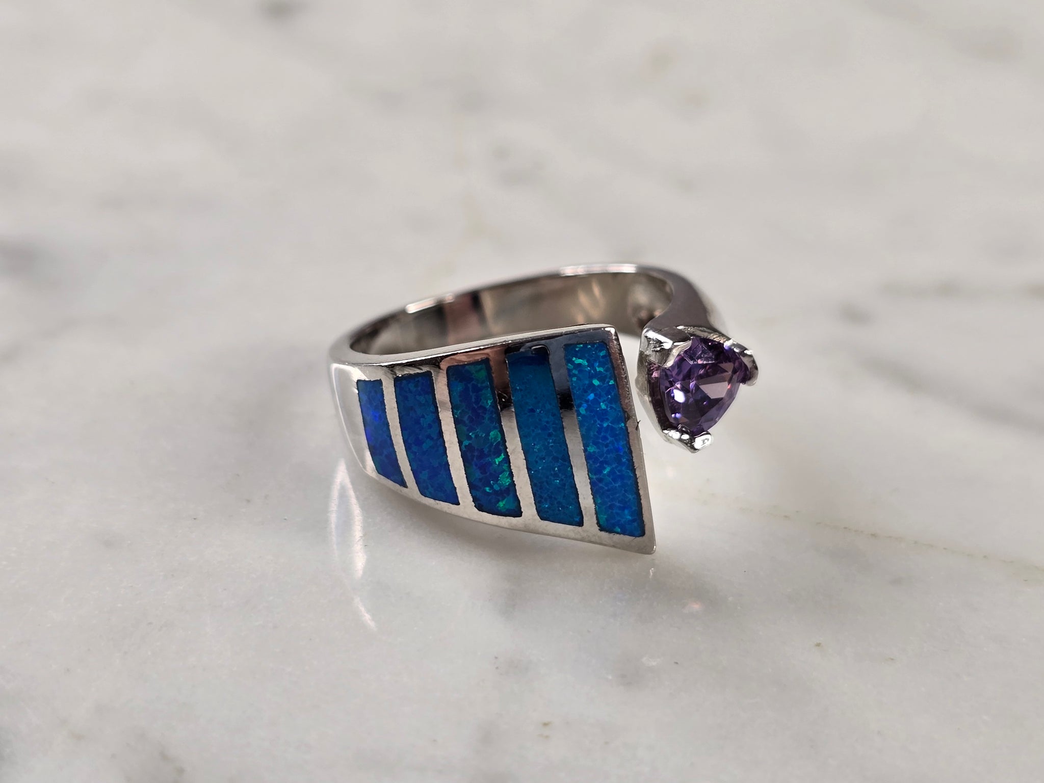 A WOMENS ESTATE STERLING SILVER MODERNIST BLUE OPAL RING.  THE RING IS A SIZE 6.0, AND WEIGHS 5.0g.   THE WIDTH OF THE RING IS 1/2".  NOT SURE IF OPAL IS NATURAL OR MAN MADE.  THE RING MAKES A BEAUTIFUL GIFT FOR THAT SOMEONE SPECIAL.  ANY  QUESTIONS, PLEASE ASK.  BE SURE TO CHECK OUT SOME OF MY OTHER GREAT ITEMS UP FOR SALE. THANK YOU.
