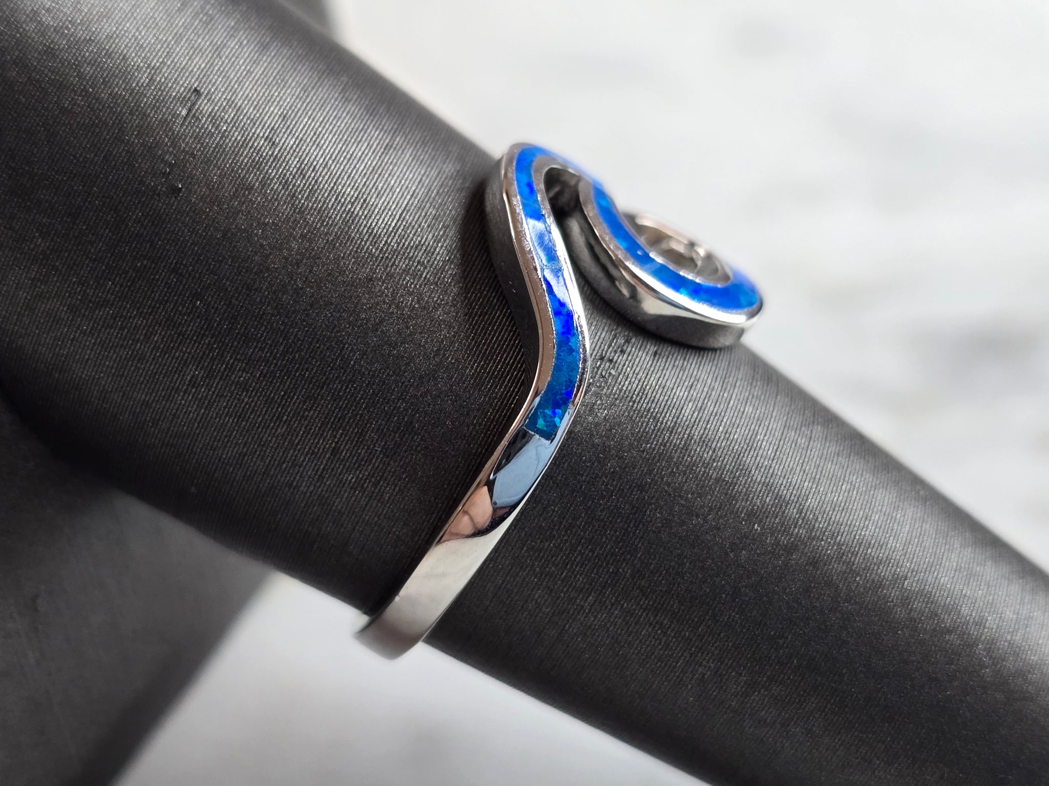 A WOMENS ESTATE STERLING SILVER MODERNIST BLUE OPAL COLORED WAVE RING. THE RING IS A SIZE 9.0 AND WEIGHS 3.1g. WIDTH OF RING MEASURES 1/2". NOT SURE IF STONE IS NATURAL OR MAN MADE. THE RING MAKES A BEAUTIFUL GIFT FOR THAT SOMEONE SPECIAL. ANY QUESTIONS, PLEASE ASK. BE SURE TO CHECK OUT SOME OF MY OTHER GREAT ITEMS UP FOR SALE. THANK YOU.