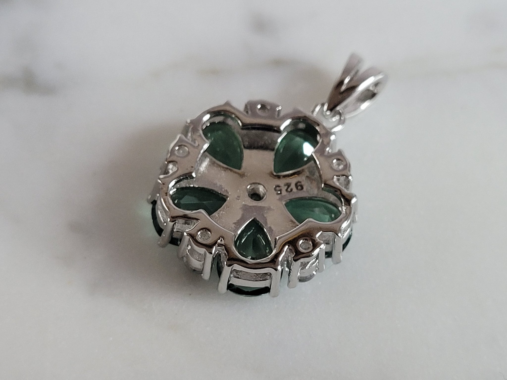 A WOMENS ESTATE STERLING SILVER MODERNIST CZ FLORAL PENDANT WITH AN EMERALD COLORED STONE. PENDANT WEIGHS 2.9g AND MEASURES 7/8" LONG BY 5/8" WIDE. MAKES A GREAT GIFT FOR THAT SOMEONE SPECIAL. ANY QUESTIONS, PLEASE ASK. BE SURE TO CHECK OUT OUR OTHER ITEMS FOR SALE.