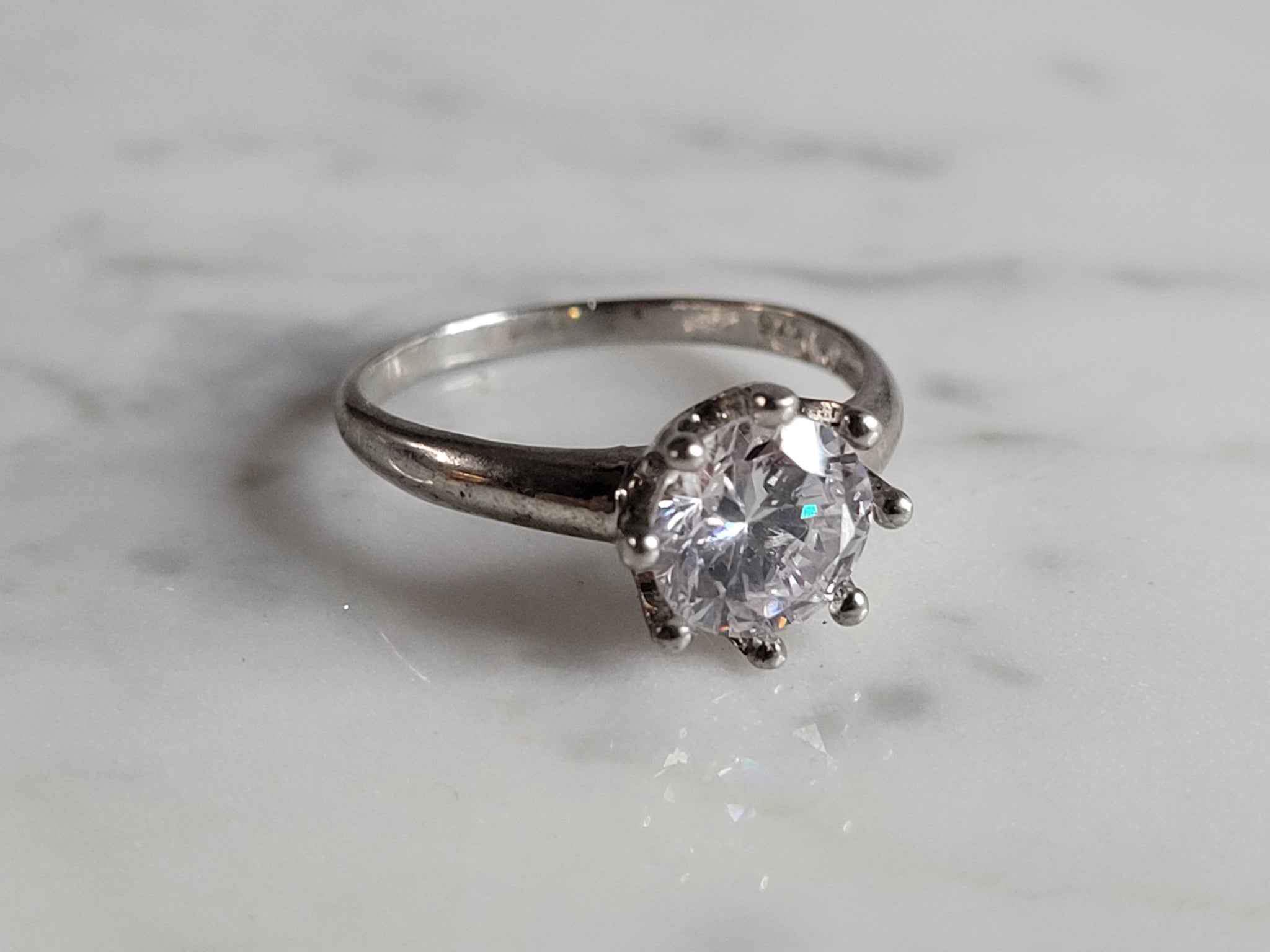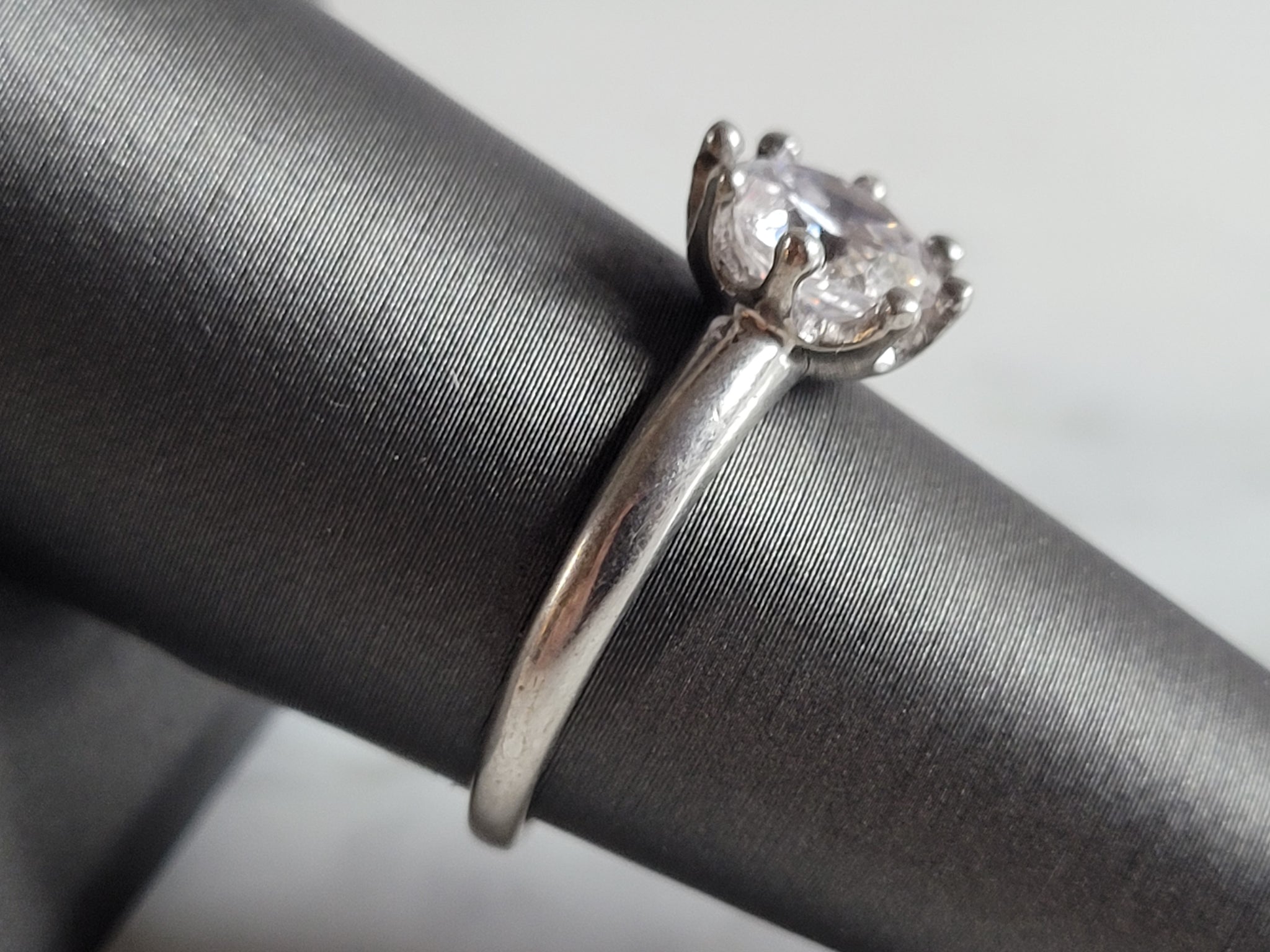 A WOMENS ESTATE STERLING SILVER MODERNIST CZ RING. THE RING WEIGHS 2.6g, AND IS A SIZE 7.75. THE WIDTH OF THE RING IS 3/8". THIS RING WOULD MAKE A GREAT GIFT FOR SOMEONE SPECIAL. ANY QUESTIONS PLEASE DONT HESITATE TO ASK. BE SURE TO CHECK OUT SOME OF OUR OTHER GREAT ITEMS UP FOR SALE. THANK YOU.
