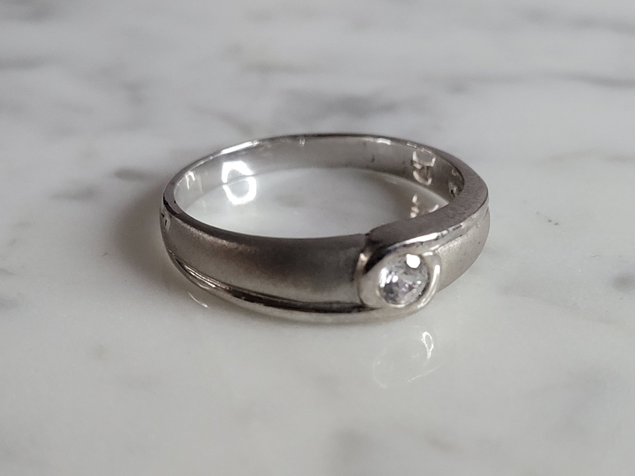 A WOMENS ESTATE STERLING SILVER MODERNIST CZ RING. THE RING WEIGHS 3.1g, AND IS A SIZE 9.0.  THE WIDTH OF THE RING IS 3/16". AS YOU MAY BE ABLE TO SEE THE RING HAS A MATTE FINISH. THIS RING WOULD MAKE A GREAT GIFT FOR SOMEONE SPECIAL. ANY QUESTIONS PLEASE DONT HESITATE TO ASK. BE SURE TO CHECK OUT SOME OF OUR OTHER GREAT ITEMS UP FOR SALE. THANK YOU.