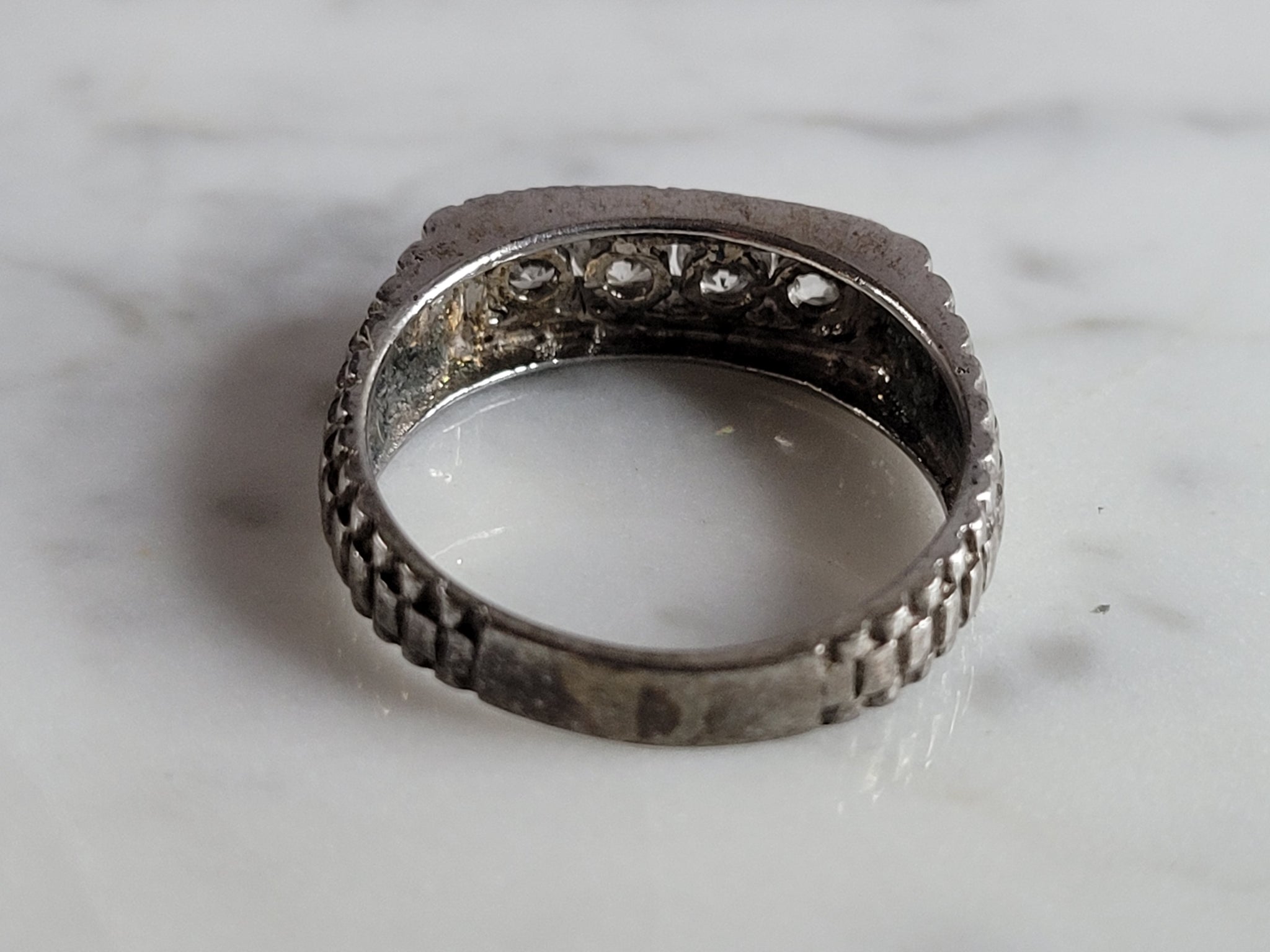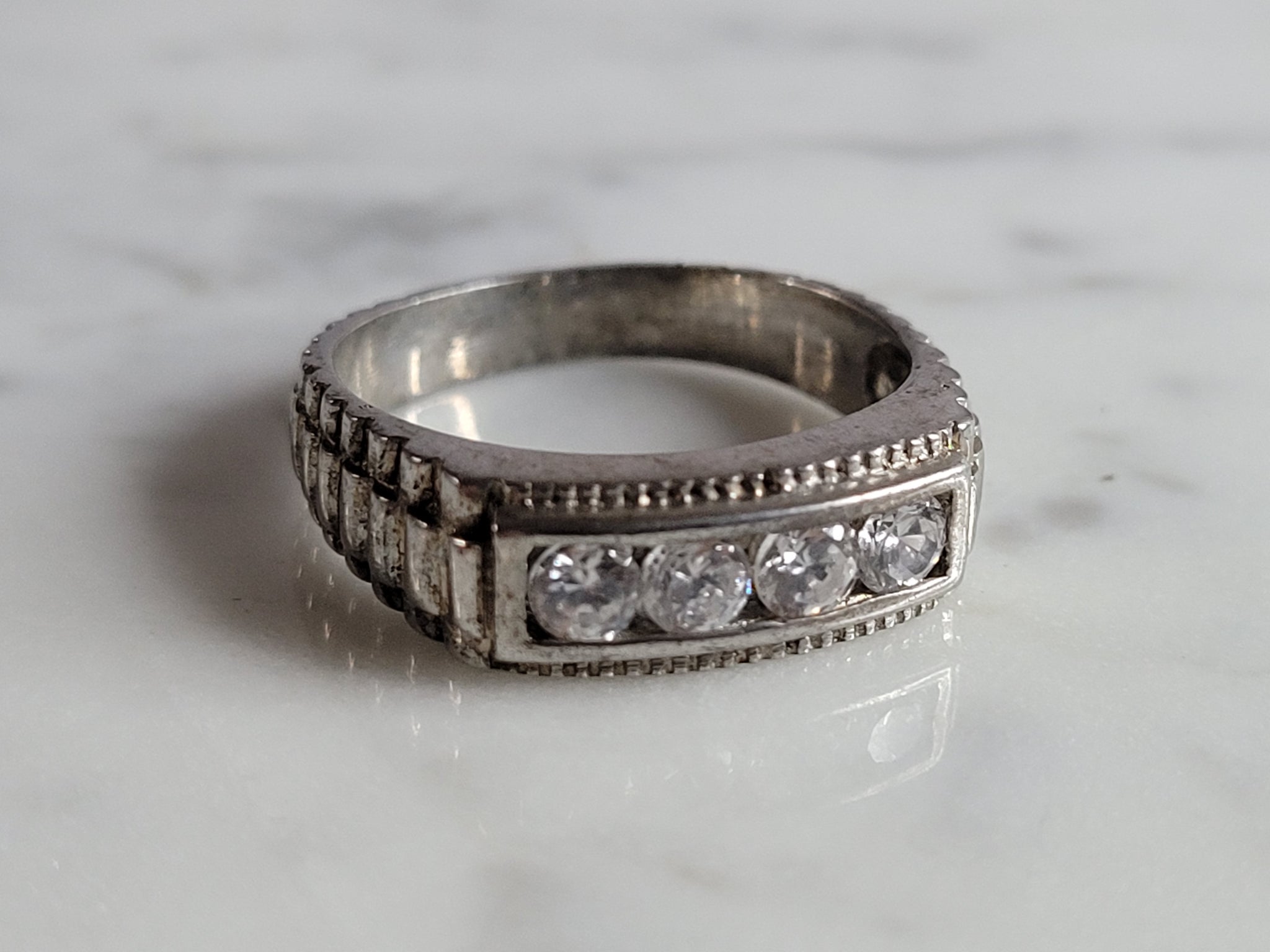 A WOMENS ESTATE STERLING SILVER MODERNIST CZ RING. THE RING WEIGHS 4.0g, AND IS A SIZE 6.5. THE WIDTH OF THE RING IS 1/4". THIS RING WOULD MAKE A GREAT GIFT FOR SOMEONE SPECIAL. ANY QUESTIONS PLEASE DONT HESITATE TO ASK. BE SURE TO CHECK OUT SOME OF OUR OTHER GREAT ITEMS UP FOR SALE. THANK YOU.