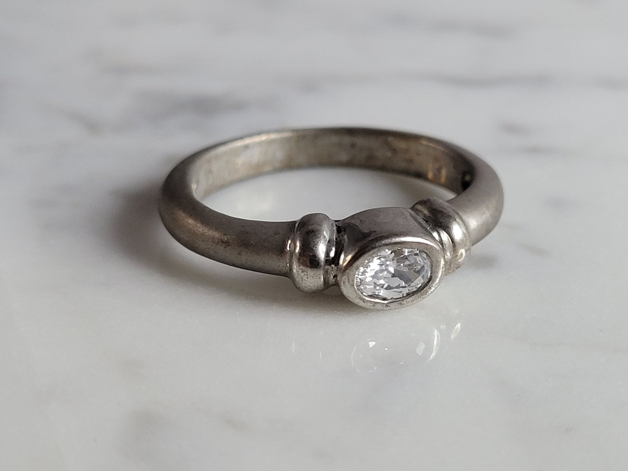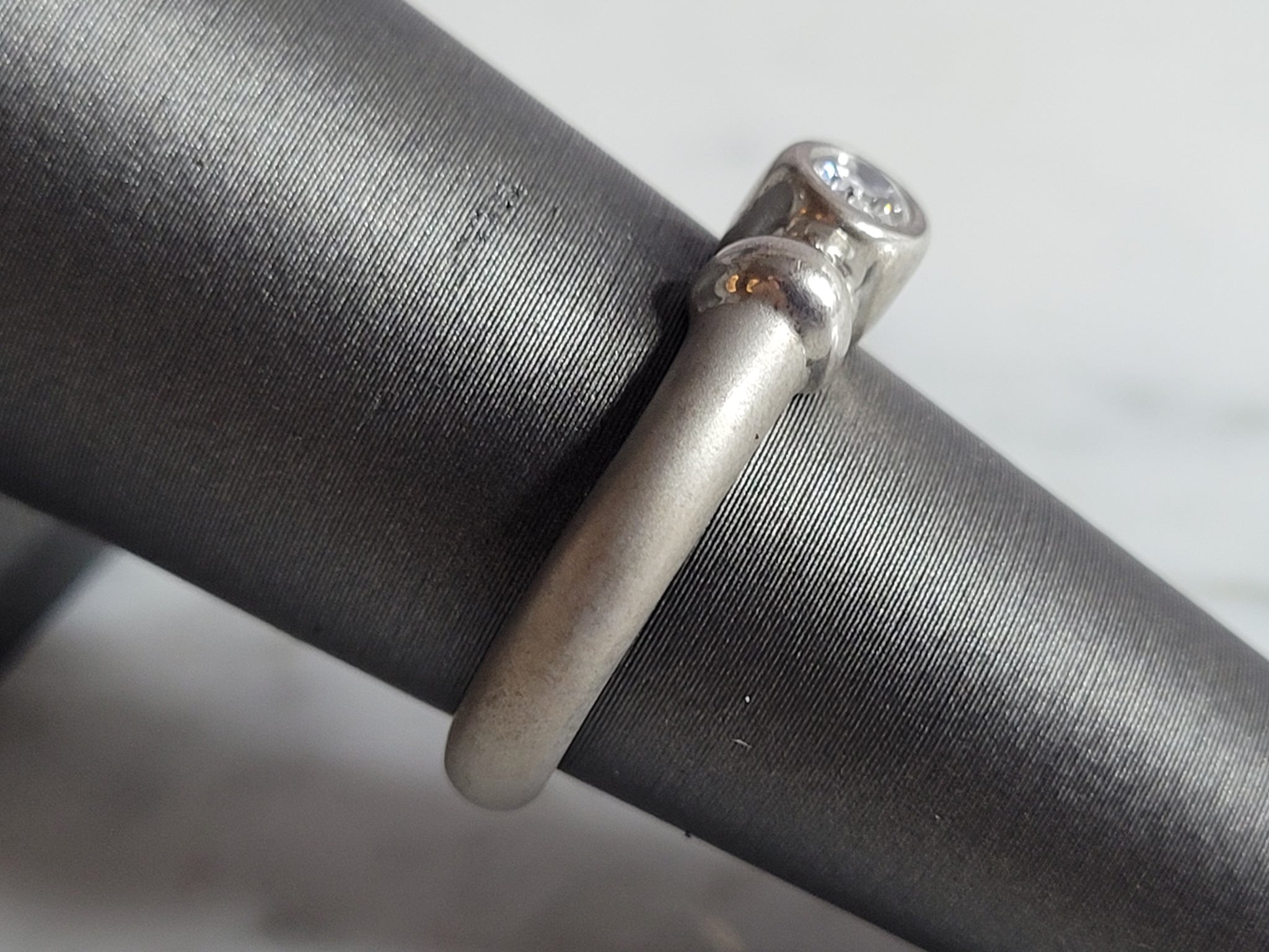 A WOMENS ESTATE STERLING SILVER MODERNIST CZ RING. THE RING WEIGHS 4.2g, AND IS A SIZE 7.0. THE WIDTH OF THE RING IS 3/16". AS YOU MAY BE ABLE TO SEE THE RING HAS A MATTE FINISH. THIS RING WOULD MAKE A GREAT GIFT FOR SOMEONE SPECIAL. ANY QUESTIONS PLEASE DONT HESITATE TO ASK. BE SURE TO CHECK OUT SOME OF OUR OTHER GREAT ITEMS UP FOR SALE. THANK YOU.