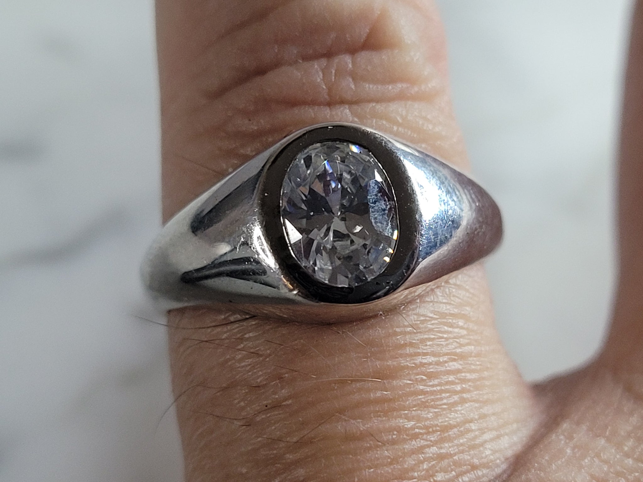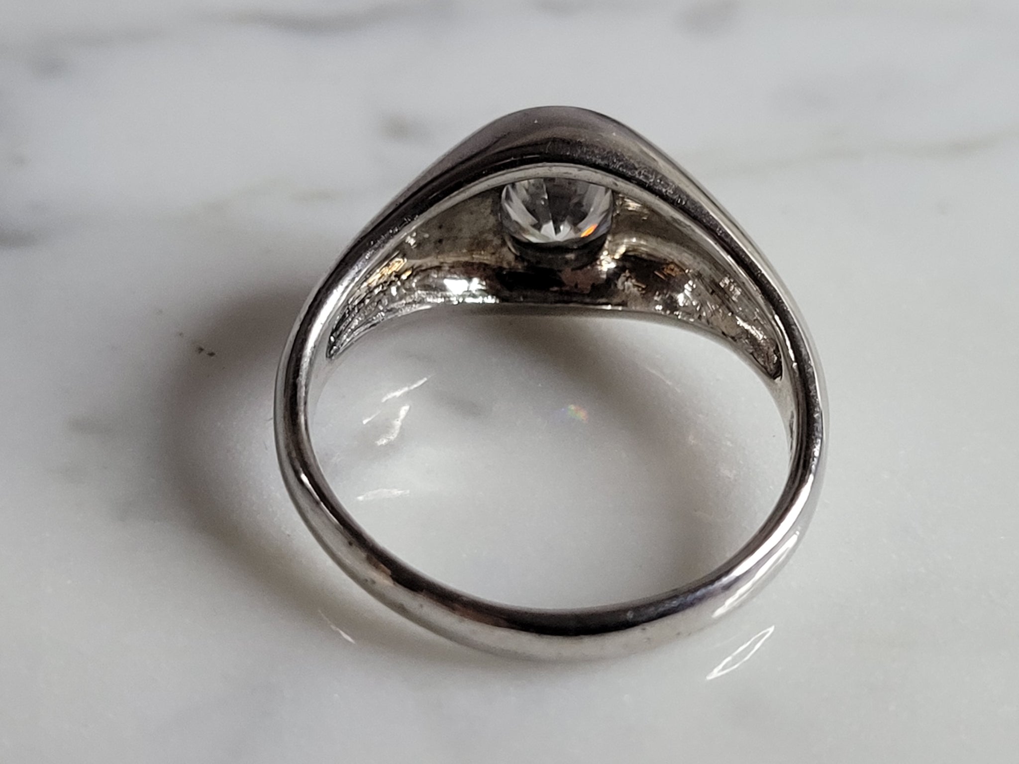 A WOMENS ESTATE STERLING SILVER MODERNIST CZ RING. THE RING WEIGHS 4.7g, AND IS A SIZE 8.25.  THE WIDTH OF THE RING IS 3/8". THIS RING WOULD MAKE A GREAT GIFT FOR SOMEONE SPECIAL. ANY QUESTIONS PLEASE DONT HESITATE TO ASK. BE SURE TO CHECK OUT SOME OF OUR OTHER GREAT ITEMS UP FOR SALE. THANK YOU.
