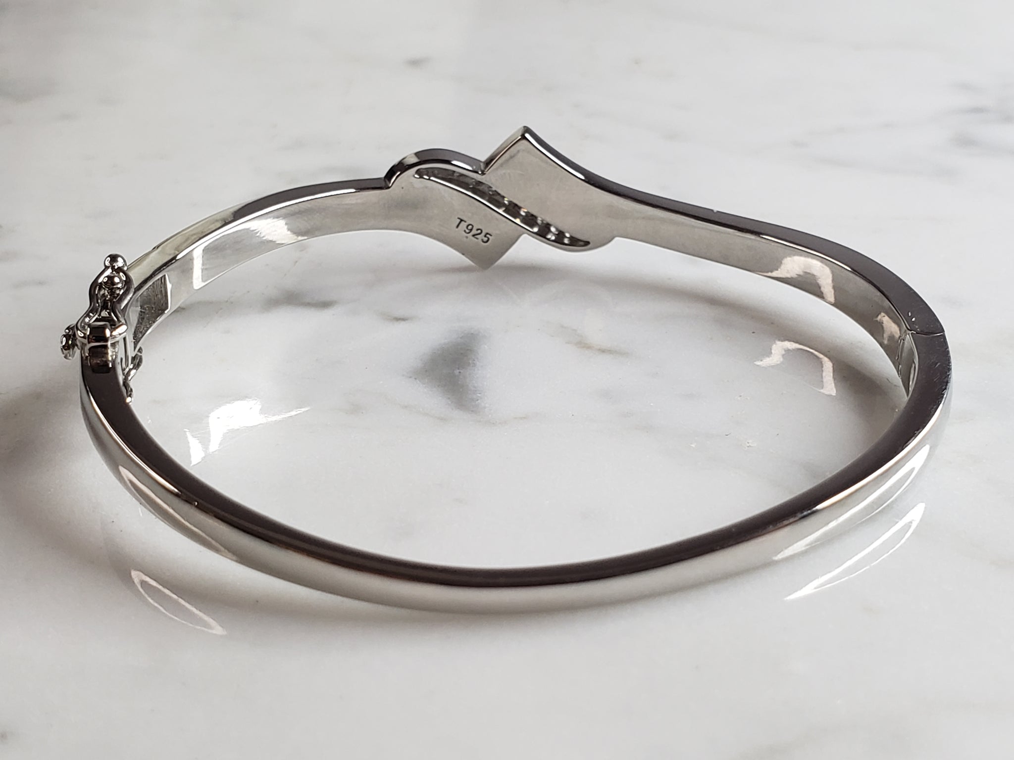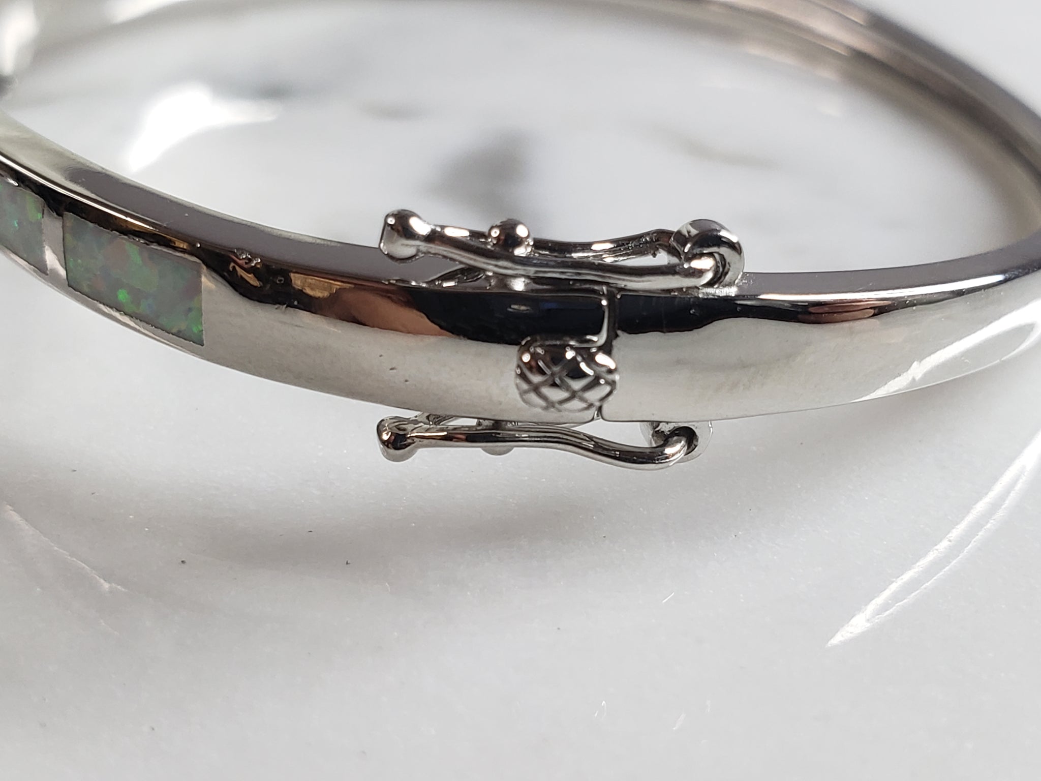 FOR SALE IS THIS WONDERFUL WOMENS STERLING SILVER MODERNIST OPAL COLORED BANGLE BRACELET. THE BRACELET WEIGHS 17.1g AND IS ABOUT 1/2" WIDE. THE CIRCUMFERENCE WITH THE GAP IS 6 3/4". NOT SURE IF STONE IS NATURAL OR MAN MADE. ANY QUESTIONS PLEASE DO NOT HESITATE TO ASK. BE SURE TO CHECK OUT SOME OF OUR OTHER GREAT PIECES OF JEWELRY FOR SALE. THANK YOU.