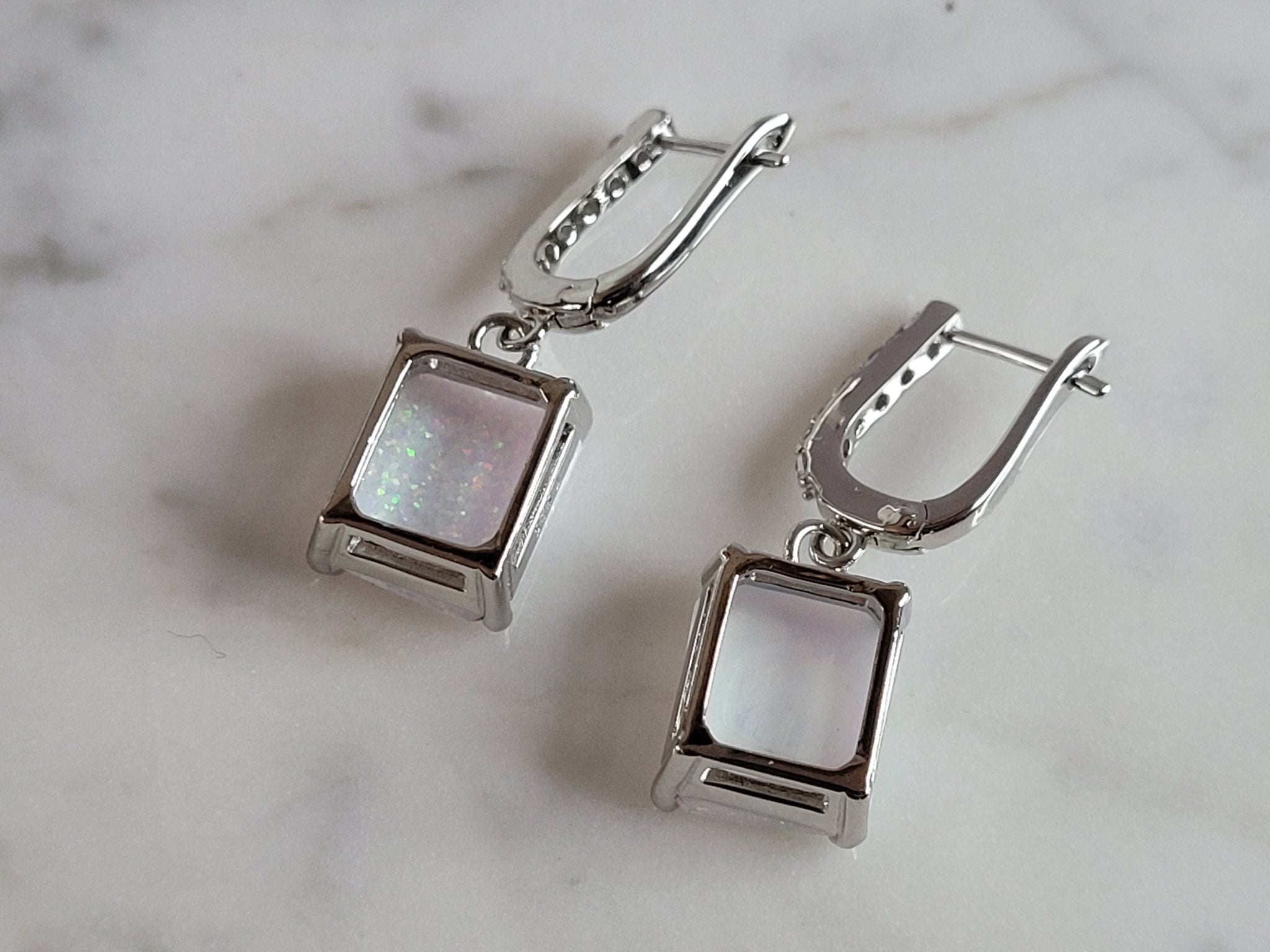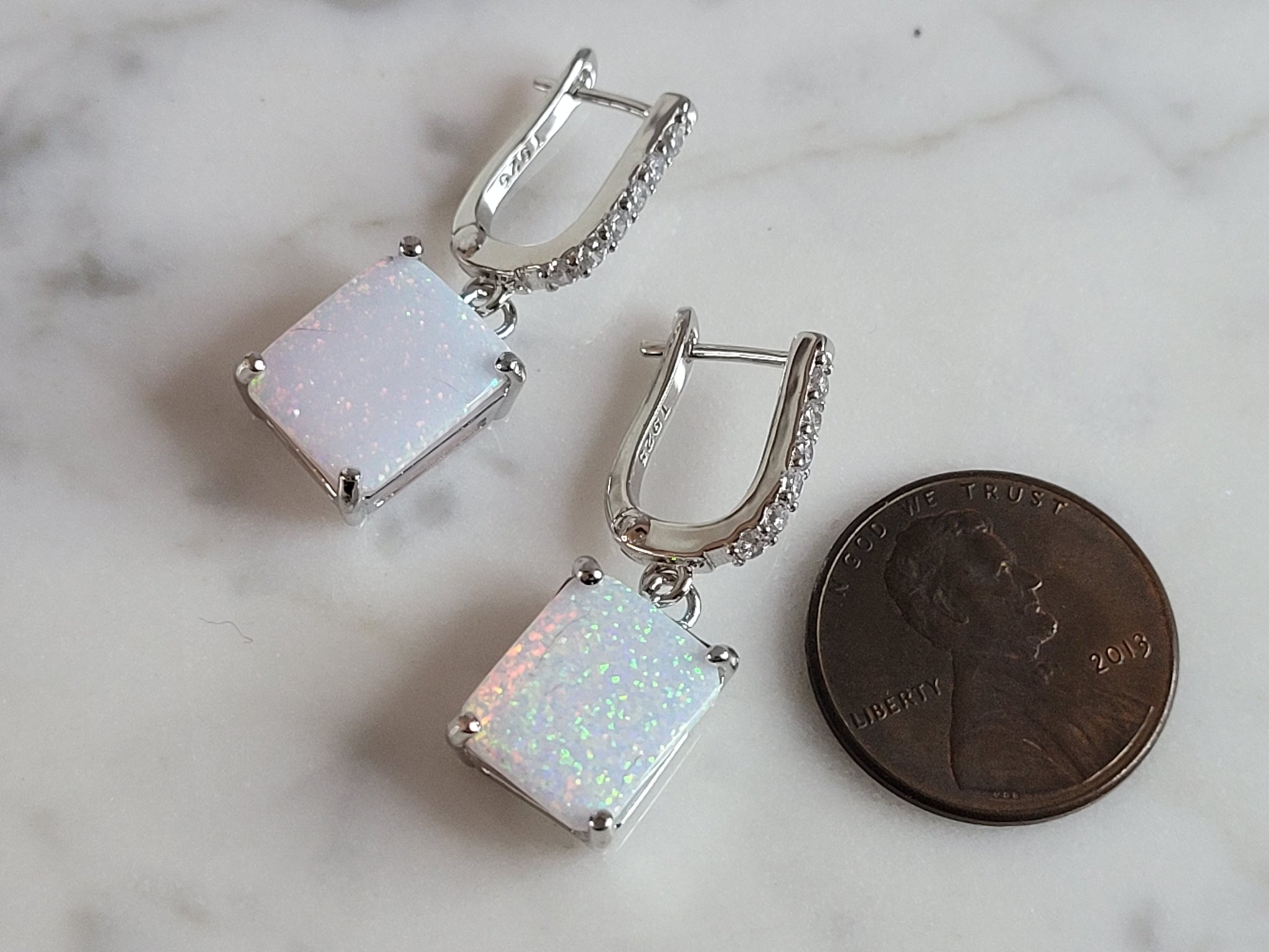A PAIR OF WOMENS STERLING SILVER OPAL COLORED EARRINGS THAT WEIGH 4.5g AND MEASURES 1 1/8" LONG BY 3/8" WIDE. NOT SURE IF STONES ARE REAL OR MAN MADE. ANY QUESTIONS, PLEASE DO NOT HESITATE TO ASK. BE SURE TO CHECK OUT SOME OF MY OTHER GREAT ITEMS UP FOR SALE. THANK YOU