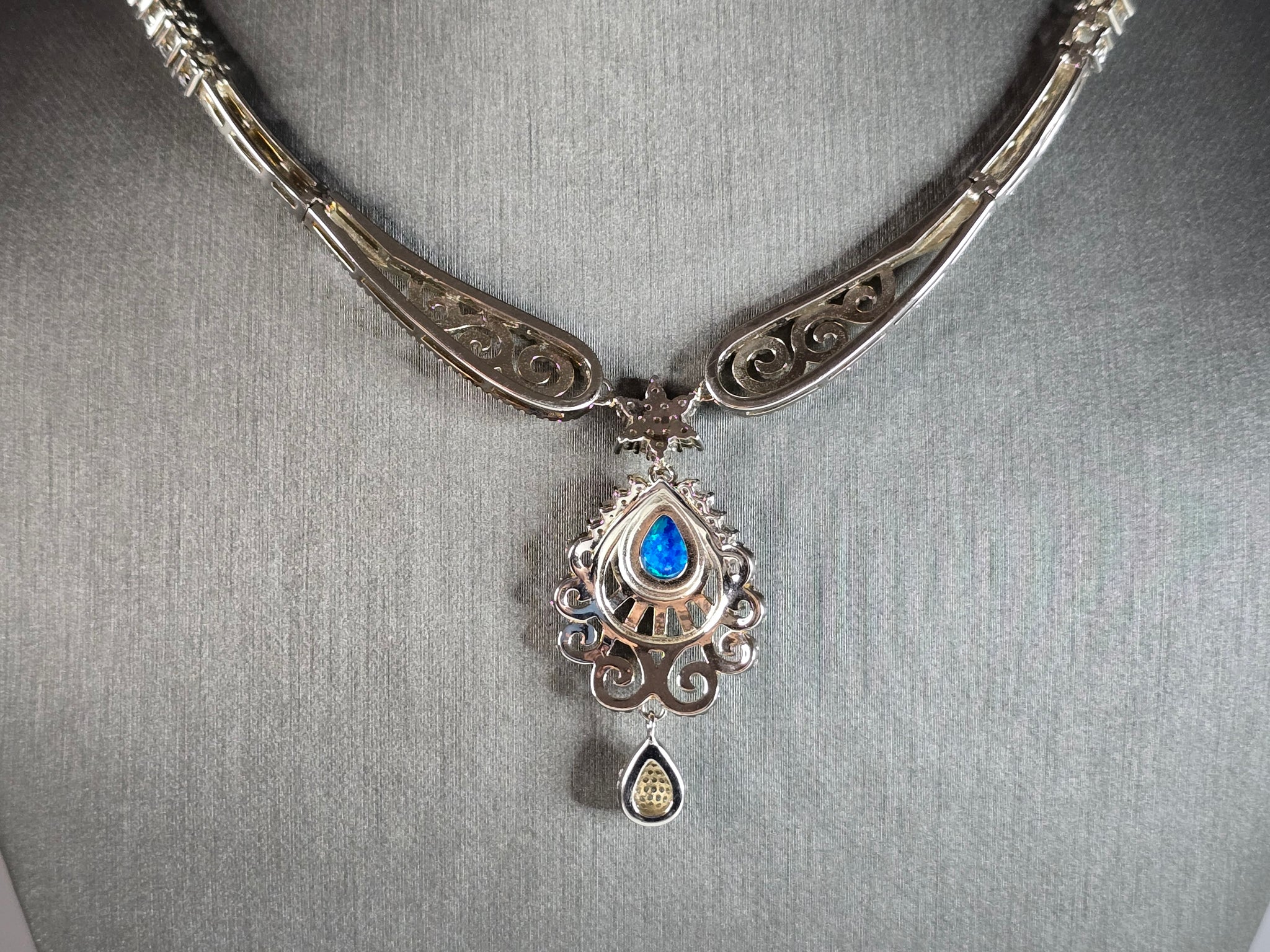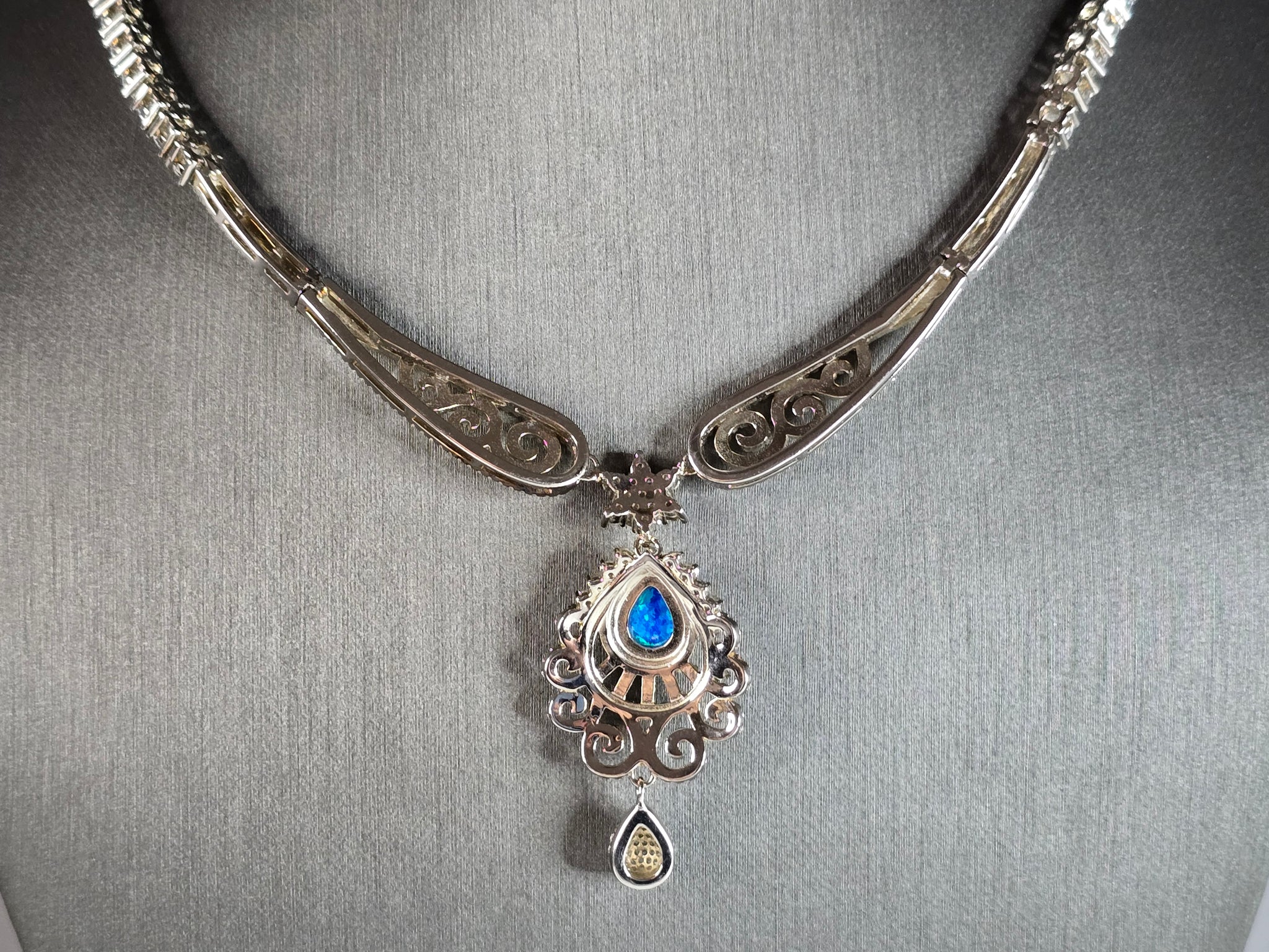 A BEAUTIFUL WOMENS ESTATE STERLING SILVER MODERNIST OPAL NECKLACE. NOT SURE IF STONE IS NATURAL OR MAN MADE. THE NECKLACE MEASURES 20" LONG, AND WEIGHS 26.7g. PENDANT HANGS 1 3/4". WOULD MAKE A GREAT GIFT FOR THAT SPECIAL SOMEONE. ANY QUESTIONS PLEASE DO NOT HESITATE TO ASK. BE SURE TO CHECK OUT SOME OF MY OTHER GREAT ITEMS UP FOR SALE. THANK YOU.