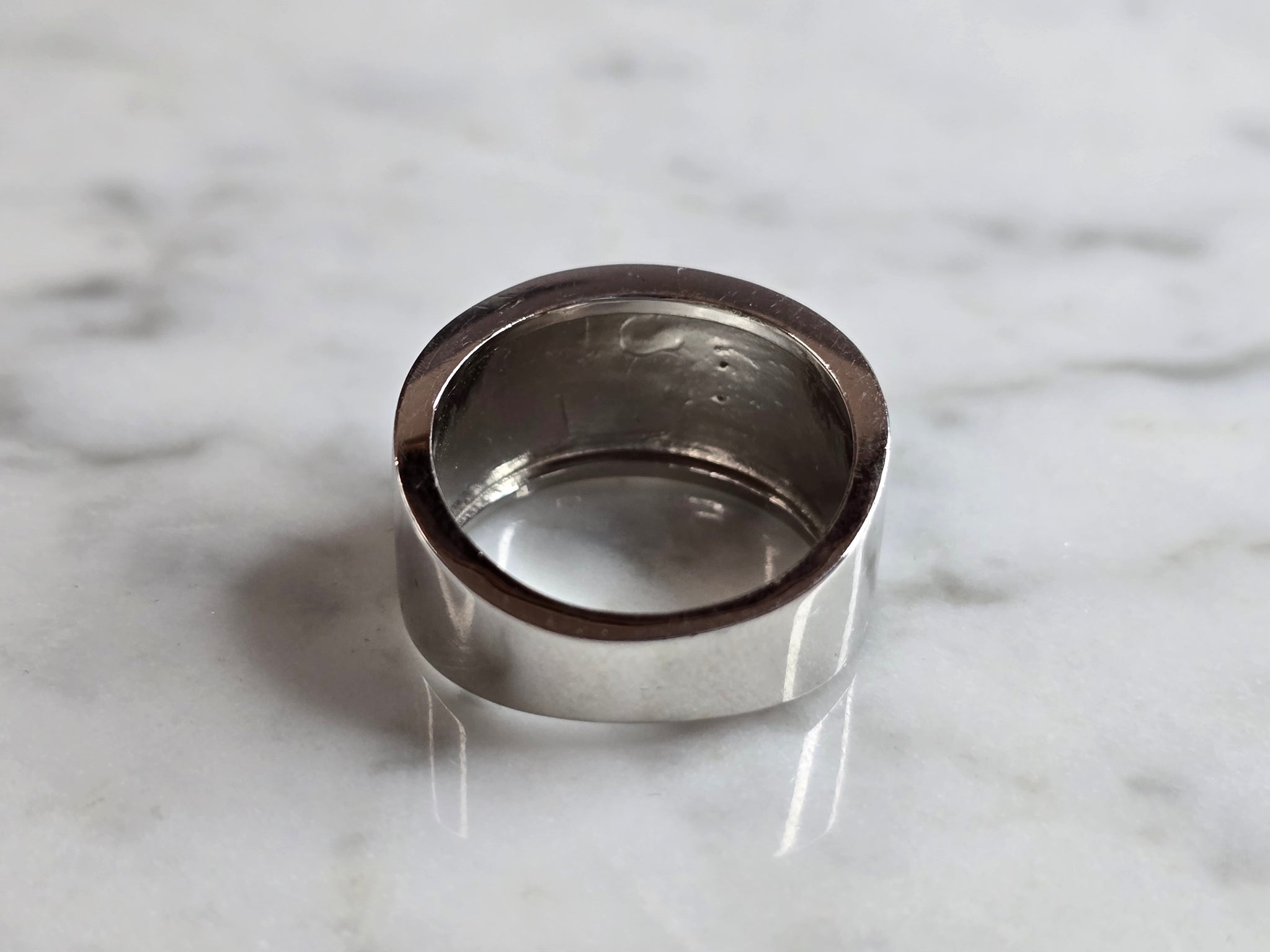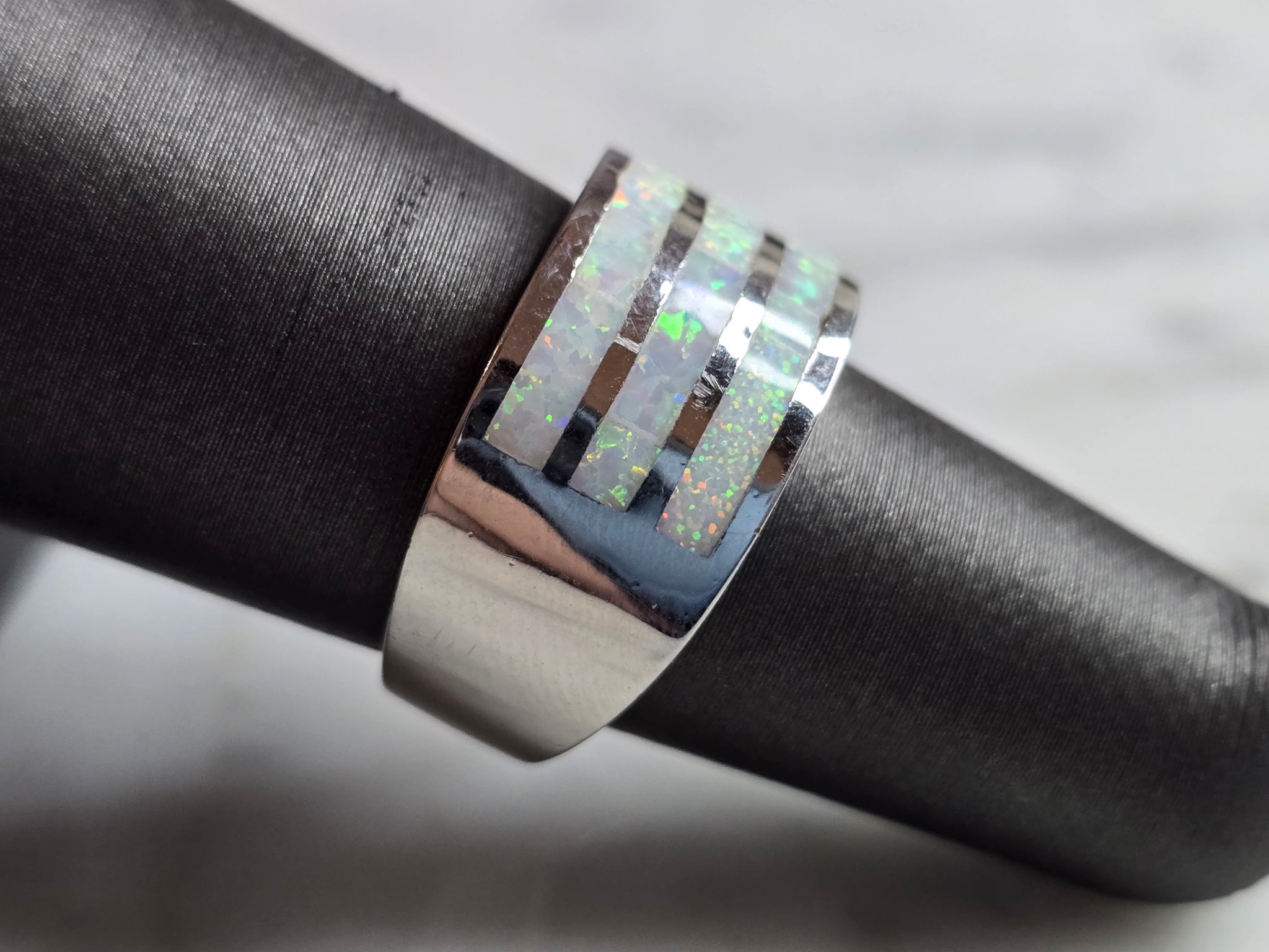 A WOMENS ESTATE STERLING SILVER MODERNIST OPAL COLORED RING. THE RING IS A SIZE 6.25, AND WEIGHS 6.7g. WIDTH OF RING MEASURES 3/8". NOT SURE IF STONE IS NATURAL OR MAN MADE. THE RING MAKES A BEAUTIFUL GIFT FOR THAT SOMEONE SPECIAL. ANY QUESTIONS, PLEASE ASK. BE SURE TO CHECK OUT SOME OF MY OTHER GREAT ITEMS UP FOR SALE. THANK YOU.