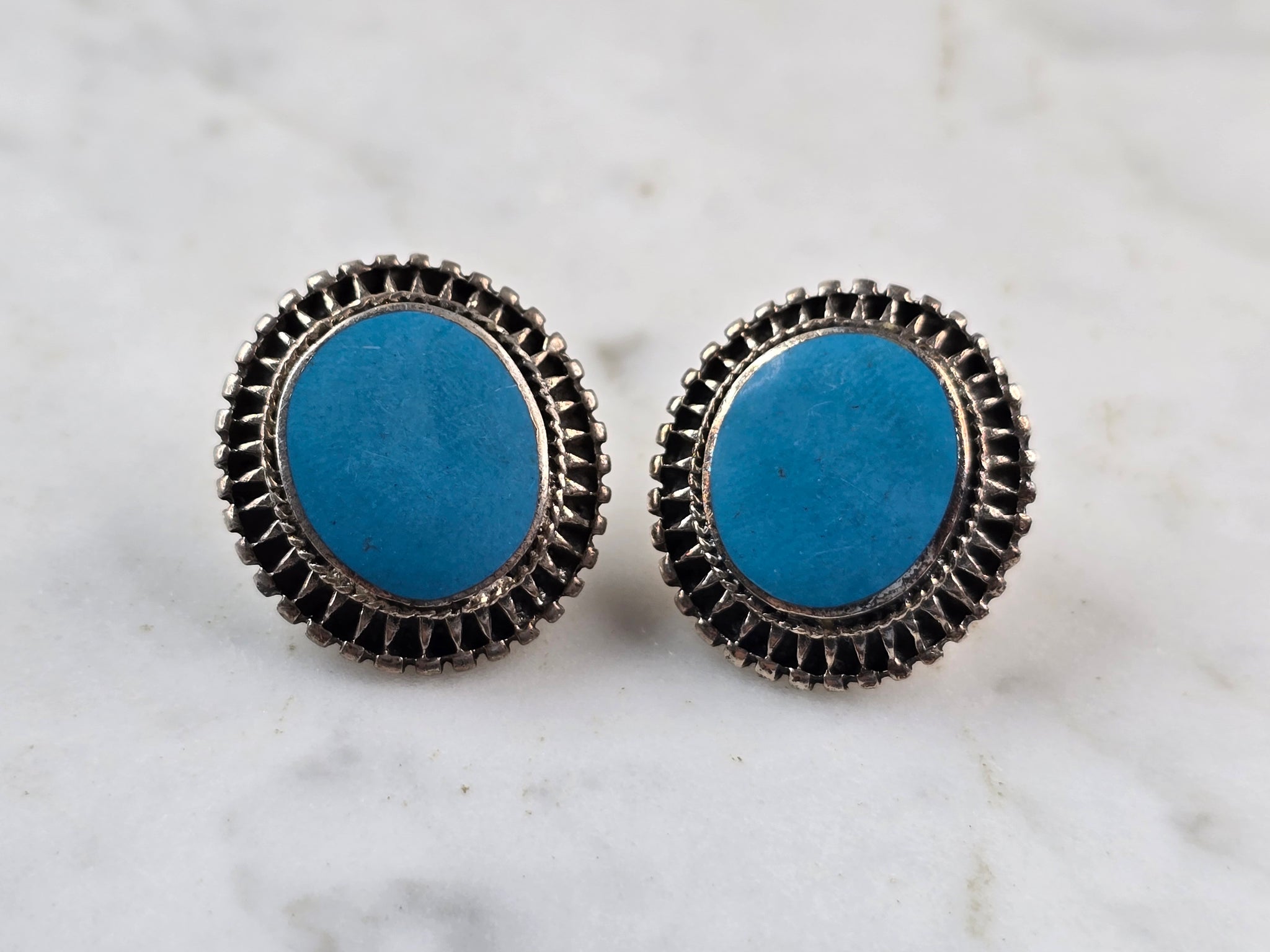 A PAIR OF WOMENS STERLING SILVER SOUTHWESTERN TURQUOISE COLORED EARRINGS. EARRINGS WEIGH 9.2g AND MEASURE 7/8" LONG BY 3/8" WIDE . EARRINGS ARE STAMPED "925, LEX". ANY QUESTIONS, PLEASE DO NOT HESITATE TO ASK. BE SURE TO CHECK OUT SOME OF MY OTHER GREAT ITEMS UP FOR SALE. THANK YOU