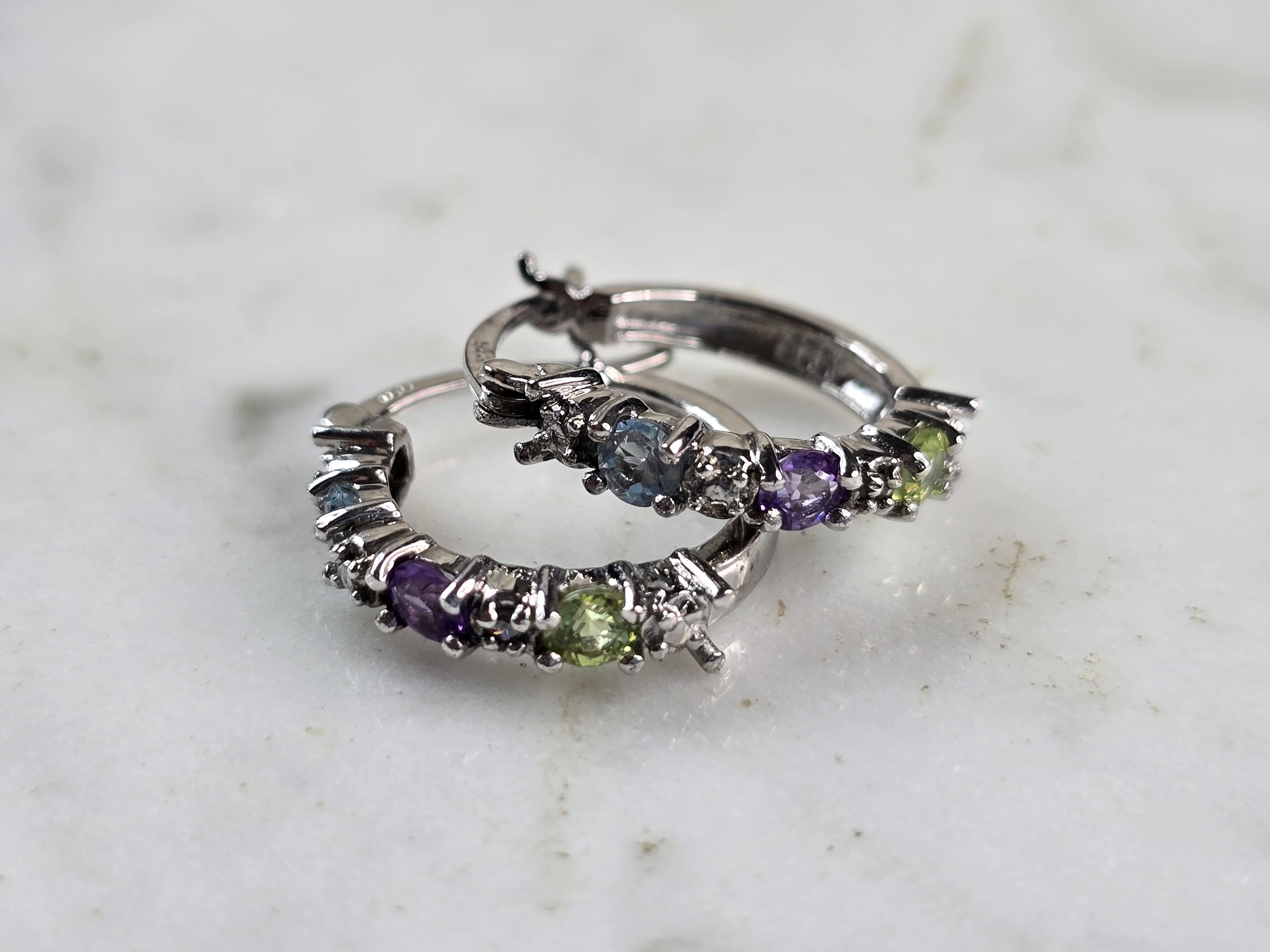 A PAIR OF WOMENS  ESTATE STERLING SILVER  MULTI STONE HOOP EARRINGS.  EARRINGS MEASURE ABOUT 5/8" BY 1/8". THE EARRINGS WEIGH 2.9g.  NOT SURE IF STONES ARE NATURAL OR MANMADE.  MAKES A LOVELY GIFT FOR THAT SOMEONE SPECIAL.