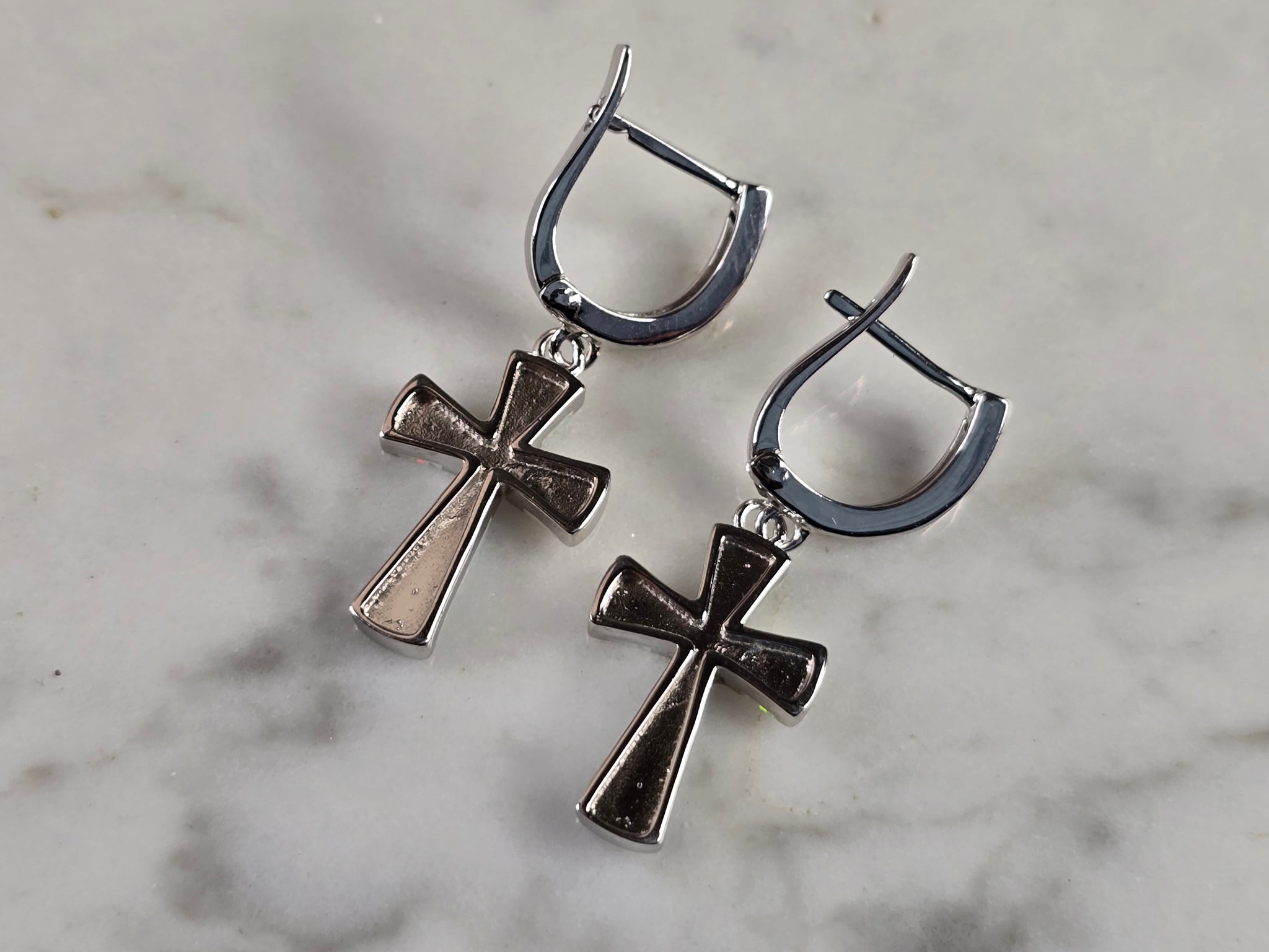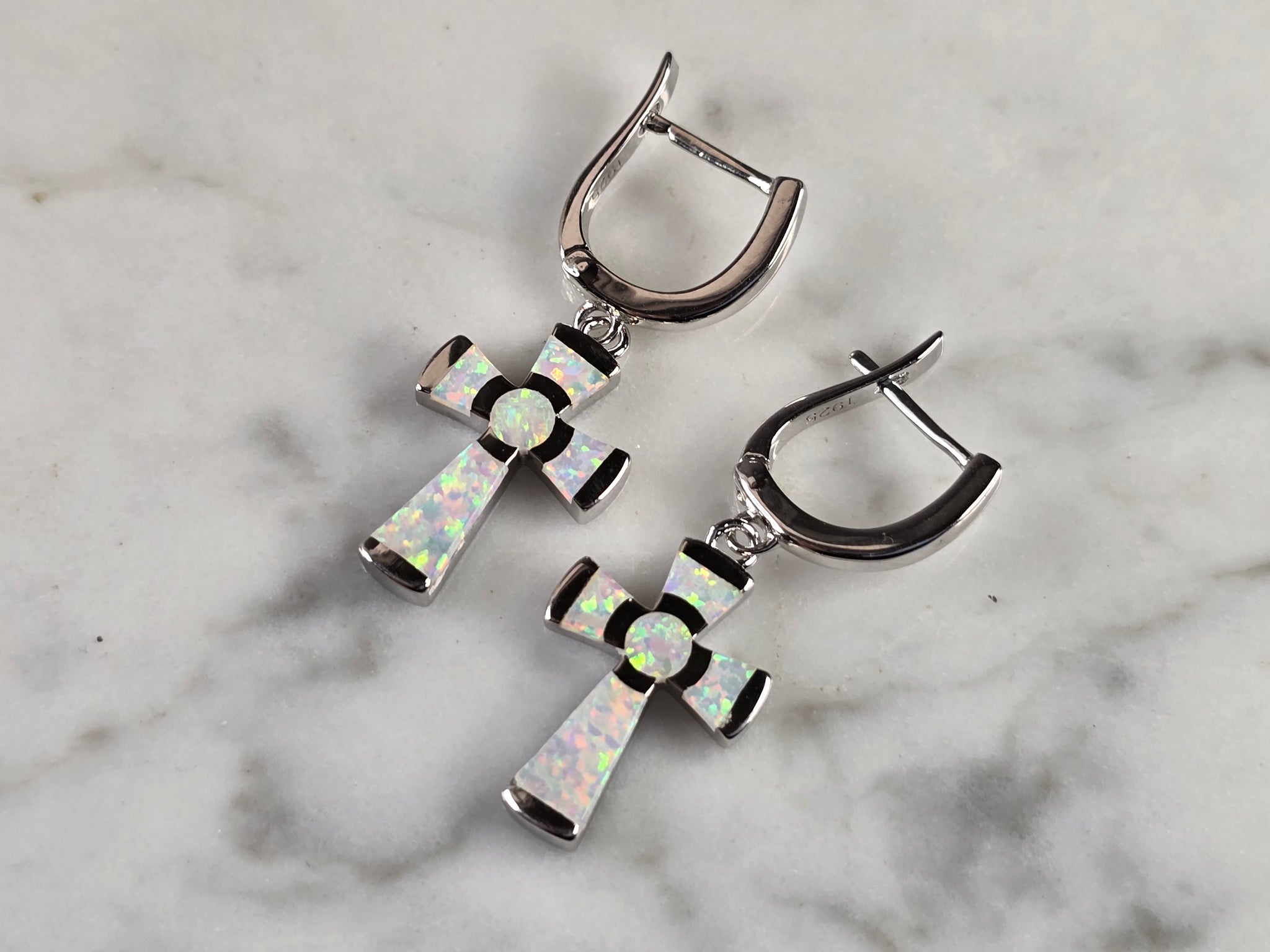 A PAIR OF WOMENS STERLING SILVER OPAL COLORED CROSS EARRINGS THAT WEIGH 4.2g, AND MEASURES 1 1/4" LONG BY 1/2" WIDE. NOT SURE IF STONES ARE REAL OR MAN MADE. ANY QUESTIONS, PLEASE DO NOT HESITATE TO ASK. BE SURE TO CHECK OUT SOME OF MY OTHER GREAT ITEMS UP FOR SALE. THANK YOU