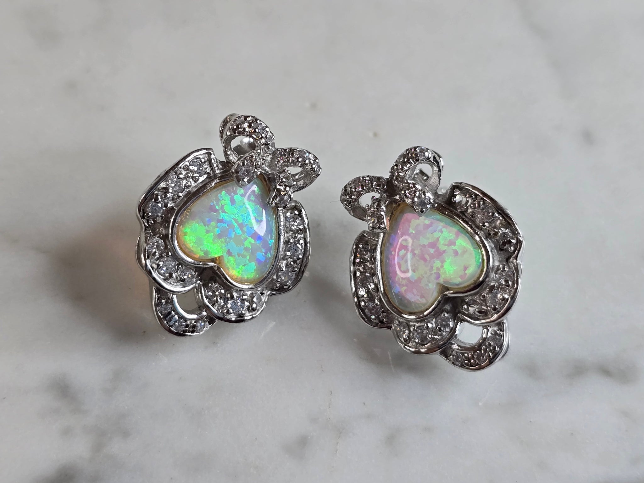 A PAIR OF WOMENS STERLING SILVER OPAL COLORED HEART EARRINGS WITH CZ ACCENTS. EARRINGS WEIGH 9.7g AND MEASURE 7/8" LONG BY 3/4" WIDE. NOT SURE IF STONES ARE NATURAL OR MAN MADE. ANY QUESTIONS, PLEASE DO NOT HESITATE TO ASK. BE SURE TO CHECK OUT SOME OF MY OTHER GREAT ITEMS UP FOR SALE. THANK YOU