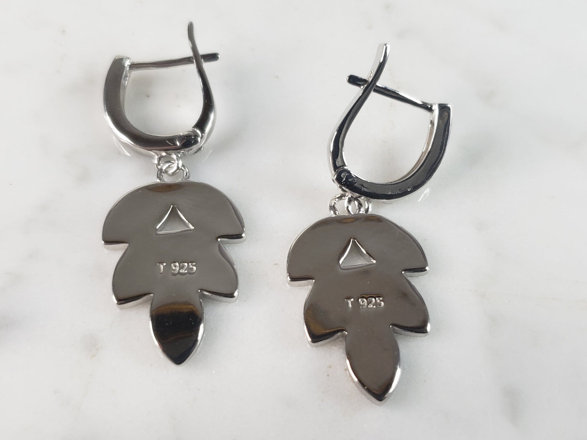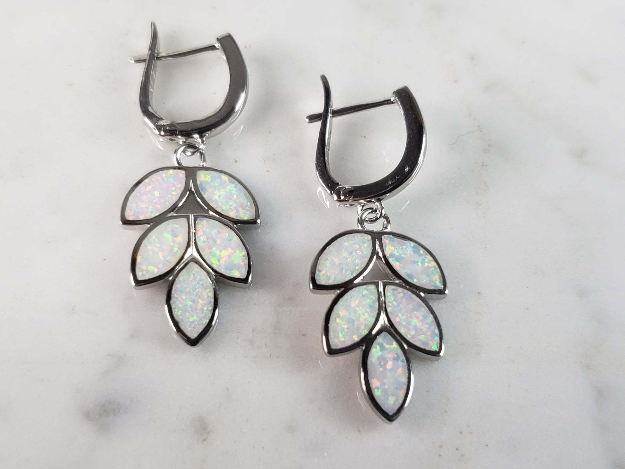 A PAIR OF WOMENS STERLING SILVER OPAL COLORED LEAF EARRINGS THAT WEIGH 4.3g AND MEASURES 1 3/8" LONG BY 1/2" WIDE. NOT SURE IF STONES ARE REAL OR MAN MADE. ANY OTHER QUESTIONS, PLEASE DO NOT HESITATE TO ASK. BE SURE TO CHECK OUT SOME OF MY OTHER GREAT ITEMS UP FOR SALE. THANK YOU