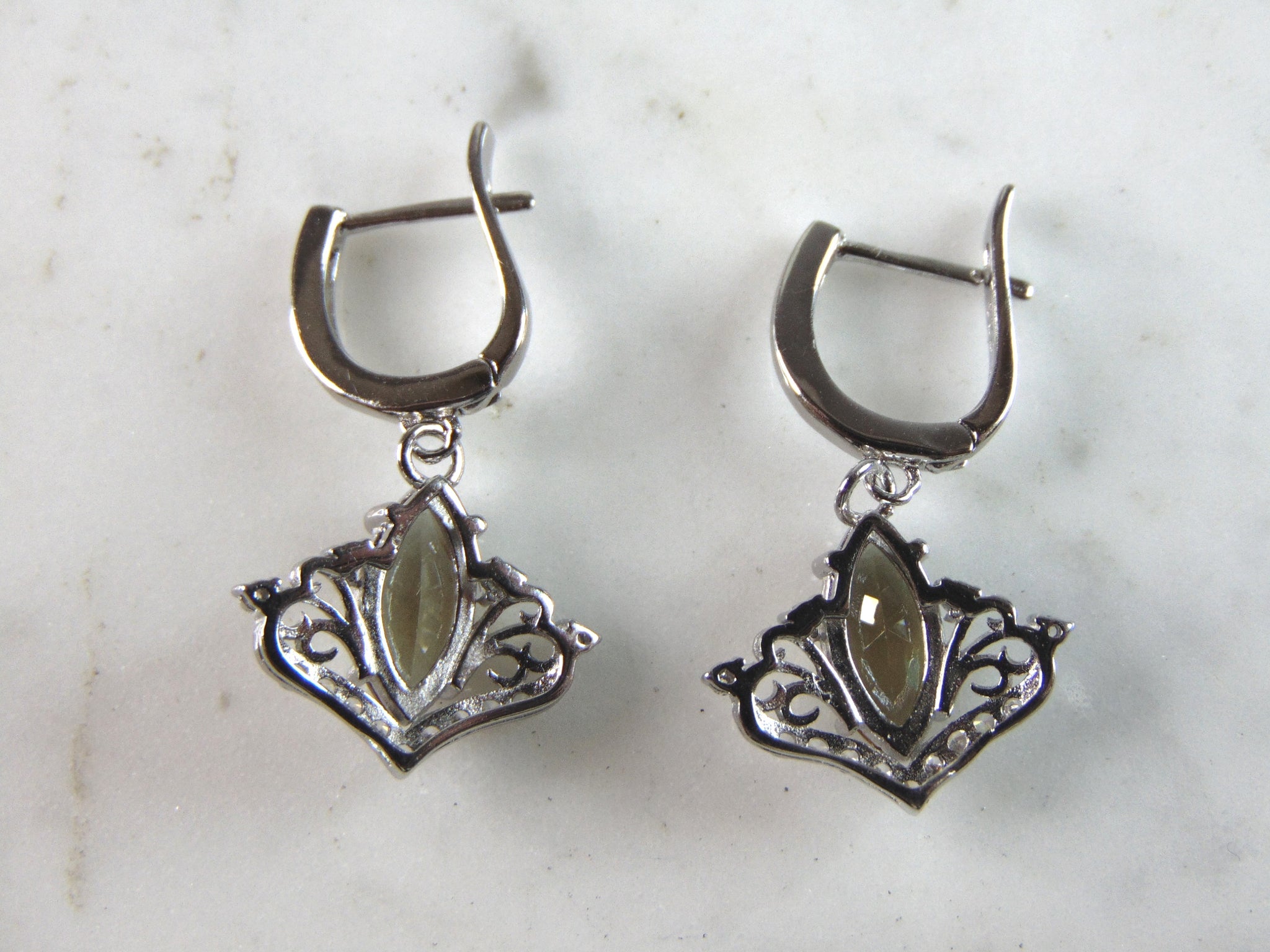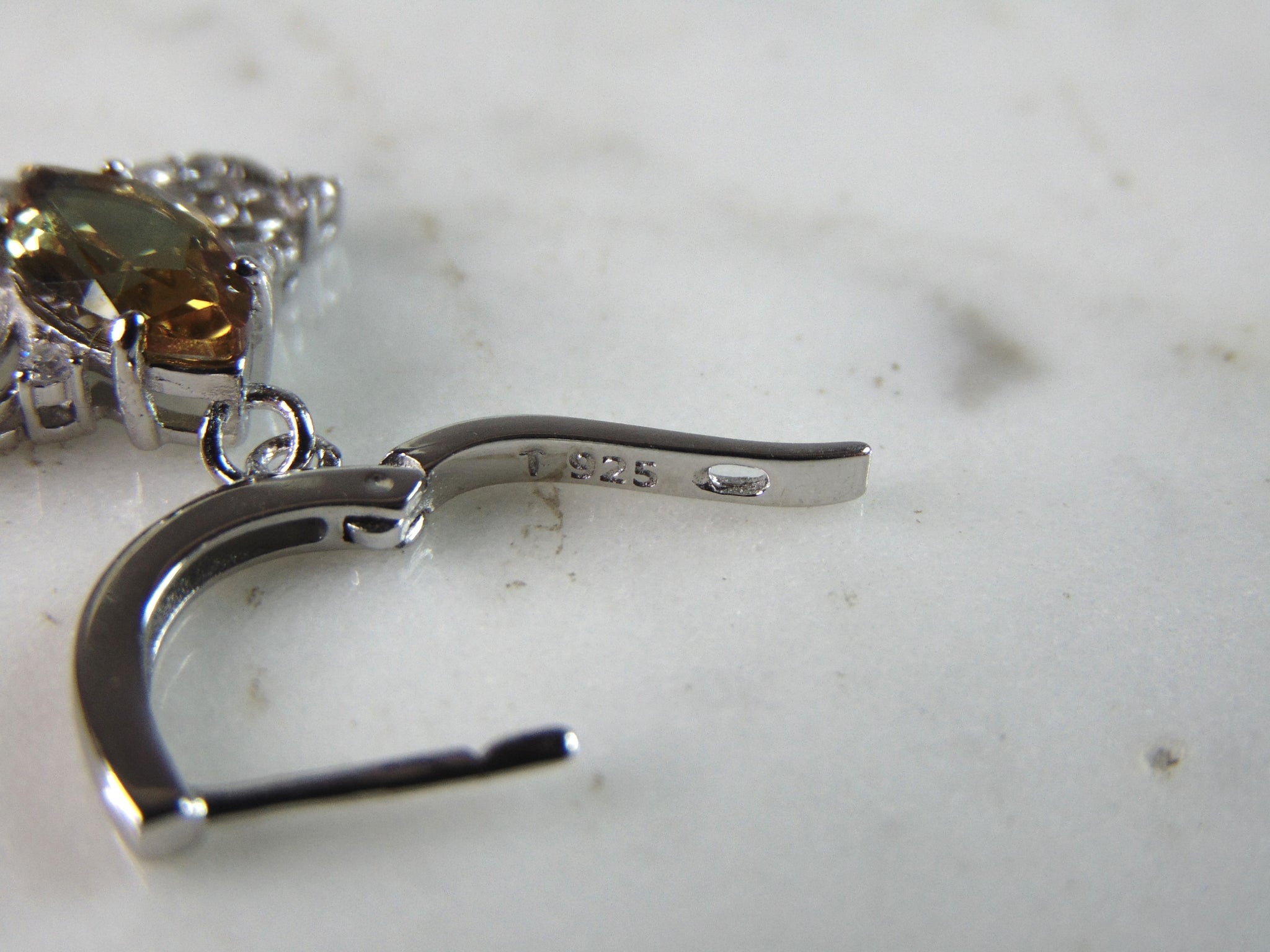 A PAIR OF WOMENS ESTATE STERLING SILVER CITRINE COLORED DANGLE EARRINGS. EARRINGS WEIGH 4.2g AND MEASURES 1 1/8" LONG BY 5/8" WIDE. ANY OTHER QUESTIONS, PLEASE DO NOT HESITATE TO ASK. BE SURE TO CHECK OUT SOME OF MY OTHER GREAT ITEMS UP FOR SALE. THANK YOU